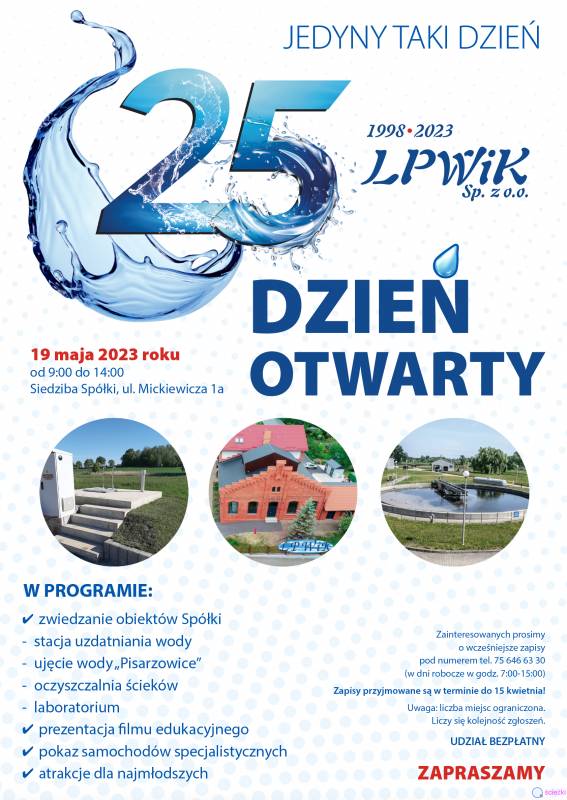 Woda ma wpływ na as wszystkich, wszyscy powinniśmy podjąć działania mające na celu świadome korzystanie, konsumowanie i zarządzanie wodą w naszym życiu. Światowy Dzień Wody to idealna okazja, aby przypomnieć, jak istotna w naszym życiu jest woda. Ważna jest edukacja i świadomość. Od kilku lat 22 marca Lubańskie Przedsiębiorstwo Wodociągów i Kanalizacji Sp. z o. o. próbuje zachęcić nasze lokalne społeczeństwo do chwilowej refleksji na temat wody. Do tej pory realizowane były w tym dniu konkursy dla dzieci i młodzieży , W tym roku, z uwagi na jubileusz Przedsiębiorstwa tj. 25lecie istnienia Spółki, postanowiliśmy zorganizować coś szczególnego - otworzyć dla naszych Odbiorców Usług drzwi naszych obiektów. Dnia 19.05.2023 roku chcielibyśmy przedstawić mieszkańcom miasta Lubań nasze obiekty, technologię, pracę w efekcie których dostarczamy wodę o dobrej jakości oraz odbieramy i oczyszczamy ścieki w sposób niezawodny troszcząc się o zapewnienie czystego i zdrowego środowiska naturalnego.