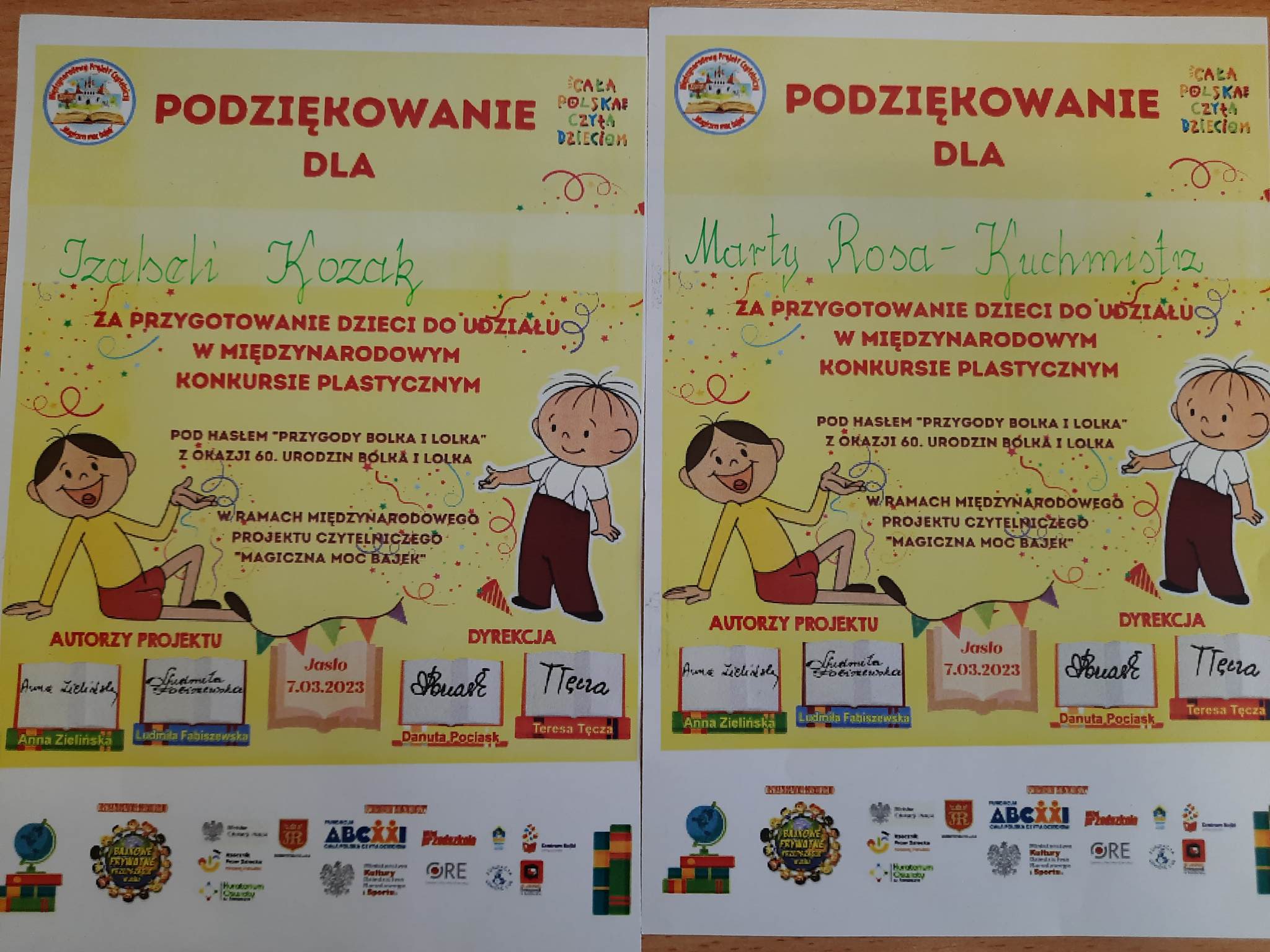 W miesiącu lutym świetlica szkolna wzięła udział w międzynarodowym konkursie plastycznym z okazji 60 urodzin Bolka i Lolka pod hasłem „Przygody Bolka i Lolka” w ramach międzynarodowego projektu czytelniczego „Magiczna moc bajek” organizowanego przez Bajkowe Prywatne Przedszkole w Jaśle.
