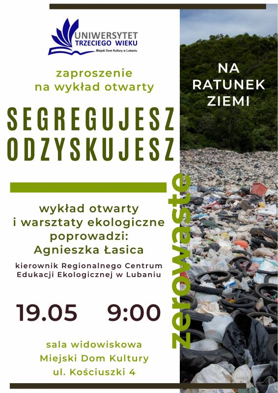 19.05 o godz. 9:00 zapraszamy do sali widowiskowej Miejskiego Domu Kultury na wyklad otwarty pn. "Segregujesz odzyskujesz", który poprowadzi Agnieszka Łasica- kierownik Regionalnego Centrum Ekologicznego w Lubaniu.