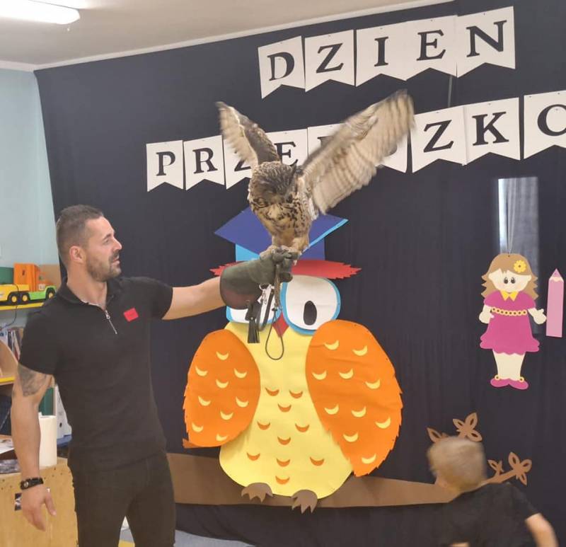 20 września w naszym przedszkolu obchodziliśmy wyjątkowy Dzień Przedszkolaka. Po raz pierwszy gościliśmy na warsztatach edukacyjnych niesamowitą „Skrzydlatą Ferajnę” z Radziechowa. Nasze przedszkolaki miały okazję zobaczyć kilka gatunków pięknych sów. Usłyszeliśmy wiele ciekawych informacji na temat tych drapieżnych ptaków, ich trybu życia, żywienia, wyglądu i zachowania. Każdy miał możliwość pogłaskać sowę i przekonać się jak delikatne w dotyku jest jej upierzenie. Wiemy jak ważne dla dzieci jest obcowanie z przyrodą, dlatego cieszymy się, że tego dnia wszyscy mogliśmy być tak blisko niej. Serdecznie dziękujemy panu Jakubowi i Skrzydlatej Ferajnie za mile spędzony czas i niezapomniane wrażenia!