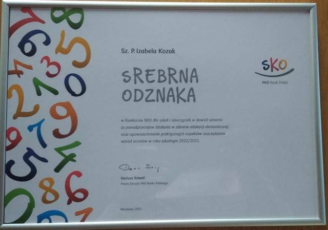 13 października 2023 roku w budynku Ufficio Primo w Warszawie odbyła się uroczysta gala podsumowująca Ogólnopolski Konkurs SKO dla szkół i nauczycieli za rok szkolny 2022/2023. Podczas gali opiekun SKO – Izabela Kozak otrzymała srebrną odznakę za swoje działania w zakresie edukacji ekonomicznej oraz promocji oszczędzania wśród uczniów. Nagrodę wręczyła Małgorzata Kocoń – dyrektor Biura Młodego Klienta w Banku PKO BP.