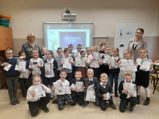 Podczas spotkania uczniowie mieli także okazję poznać dwóch sympatycznych bohaterów SKO- Żyrafkę Lokatkę i Pancernika Hatetepesa, którzy opowiedzieli o oszczędzaniu i korzystaniu z usług bankowości internetowej przeznaczonej dla dzieci do 13 roku życia. Następnie, uczniowie złożyli uroczyste przyrzeczenie, że będą systematycznie oszczędzać w SKO oraz brać udział w organizowanych konkursach. Pracownik banku PKO BP pasował uczniów na SKO-wicza, wręczył KSIĄŻECZKĘ SKO i upominek ufundowany przez bank. To ważne wydarzenie będzie przypominać uczniom o ich pozytywnym starcie i oszczędzaniu w SKO.