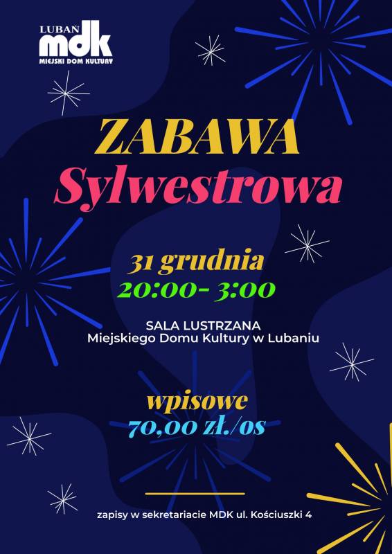Serdecznie zapraszamy do zapisów na wspólną zabawę sylwestrową przy muzyce zespołu Relax w składzie Krysia i Janusz w sali lustrzanej Miejskiego Domu Kultury w Lubaniu.