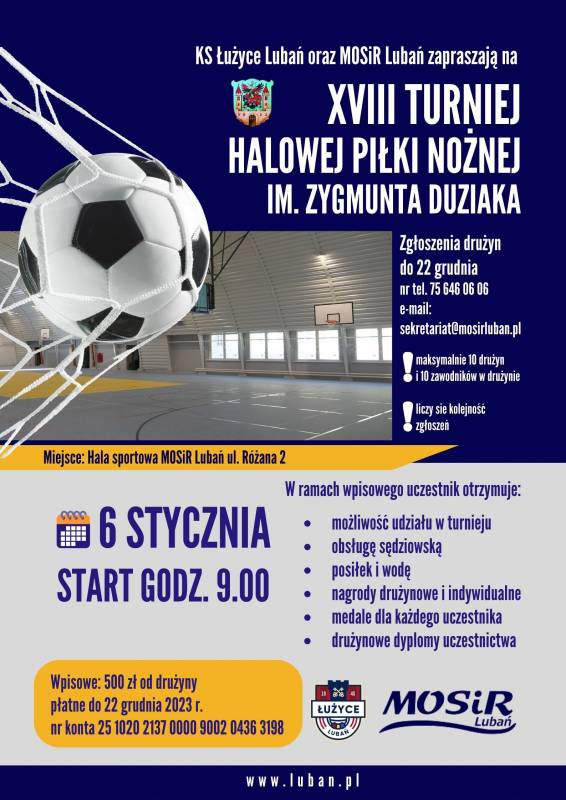 Zgłoszenia drużyn przyjmowane są do 22.12.2023 r. w MOSiR Lubań pod nr tel. 75 646 06 06 e-mail: sekretariat@mosirluban.pl