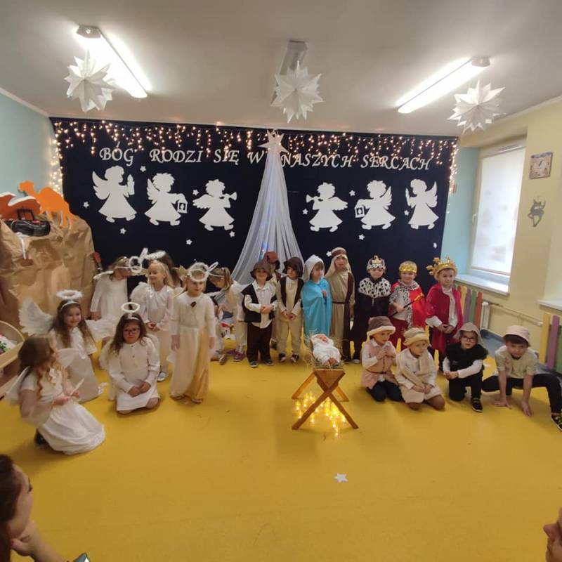 Wigilia Bożego Narodzenia to jeden z najpiękniejszych dni w roku. Tradycyjnie w naszym przedszkolu dzieci przygotowały przedstawienie jasełkowe. W tym roku to dzieci z gr. 4 wprowadziły całą społeczność przedszkolną w świąteczny i magiczny czas. Piękne stroje, scenografia oraz występ podczas którego dzieci z wielkim zaangażowaniem i radością śpiewały kolędy i pastorałki wprowadziły ciepłą, świąteczną atmosferę. Po występie dzieliliśmy się opłatkiem i składaliśmy sobie życzenia. Takie podniosłe chwile nie tylko utrwalają dzieciom znajomość tradycji i świątecznych zwyczajów lecz również wzmacniają serdeczne relacje między sobą.