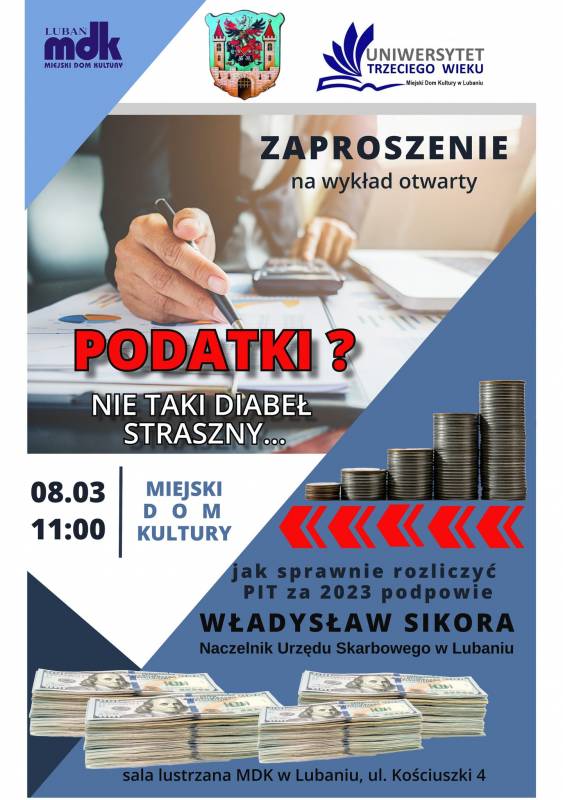 Zapraszamy na wykład otwarty - PODATKI nie taki diabeł straszny..., który 8 marca 2024 poprowadzi Naczelnik Urzędu Skarbowego w Lubaniu Władysław Sikora.