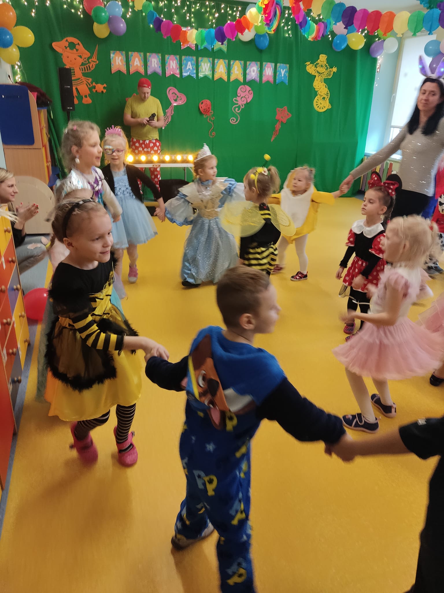 Zabawę taneczną prowadził Wodzirej, który zapraszał dzieci do uczestnictwa w tańcach, konkursach i wspólnych pląsach. Na parkiecie królowały stare i lubiane utrowy naszych przedszkolaków. Zabawa była wspaniała!