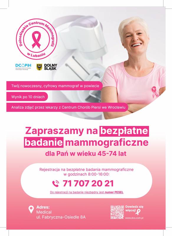 Dolnośląskie Centrum Onkologii, Pulmonologii i Hematologii, wychodząc naprzeciw potrzebom kobiet, otworzyło Dolnośląskie Centrum Mammografii w Lubaniu. Znajduje się ono na terenie Przychodni CHROMEX ul. Fabryczna-Osiedle 8A. Można tam zrobić bezpłatne badanie mammograficzne przesiewowe, na które nie trzeba mieć skierowania. W Polsce mammografia w ramach badań przesiewowych adresowana jest do kobiet w przedziale wiekowym 45-74 lata.