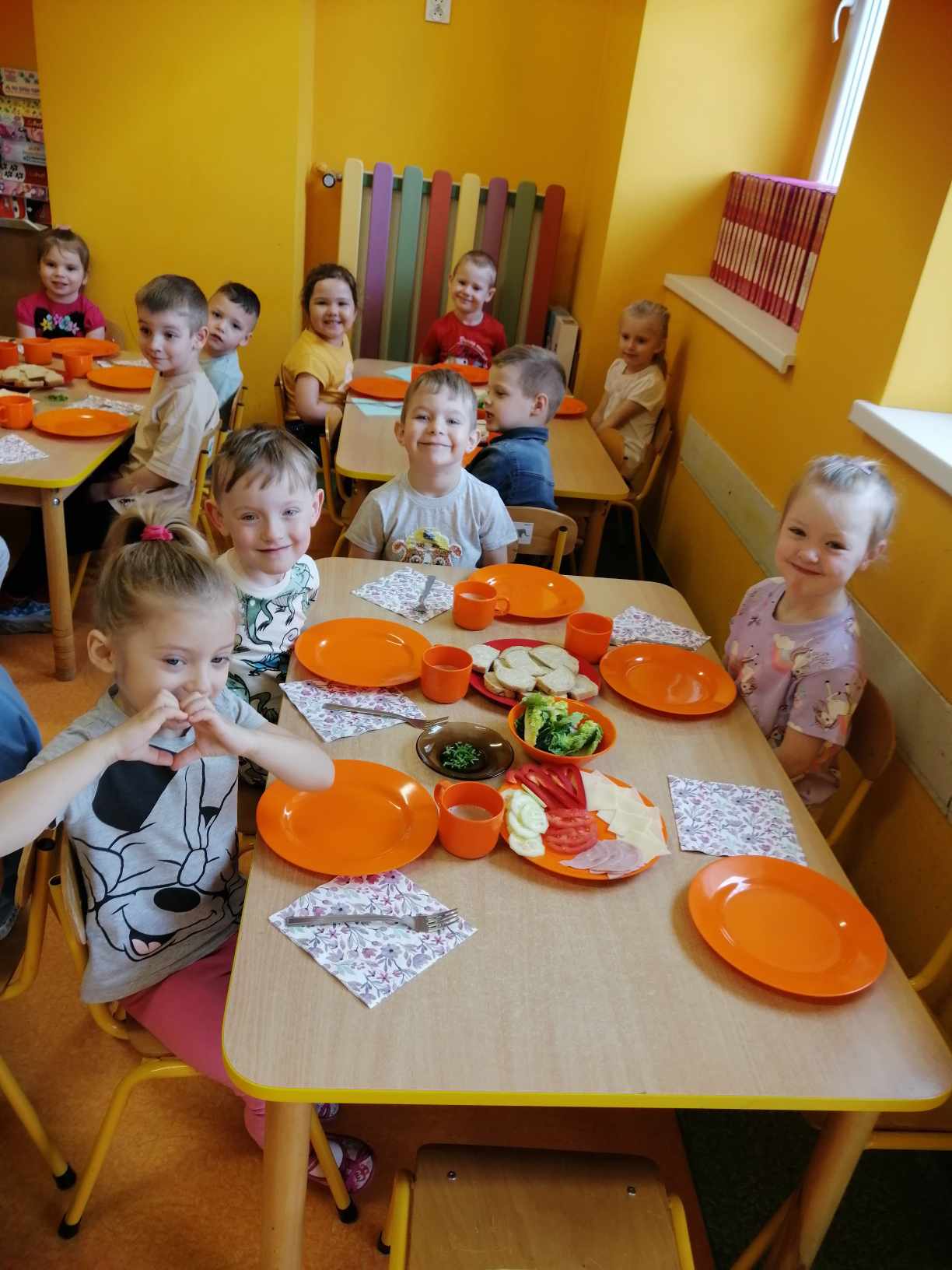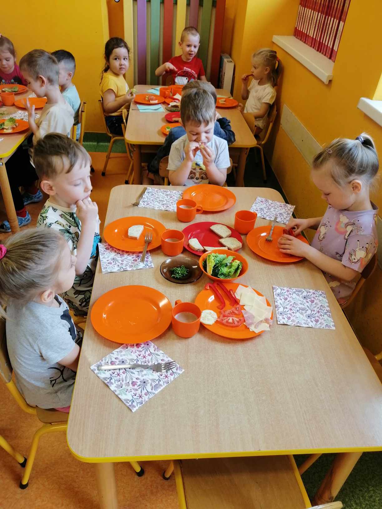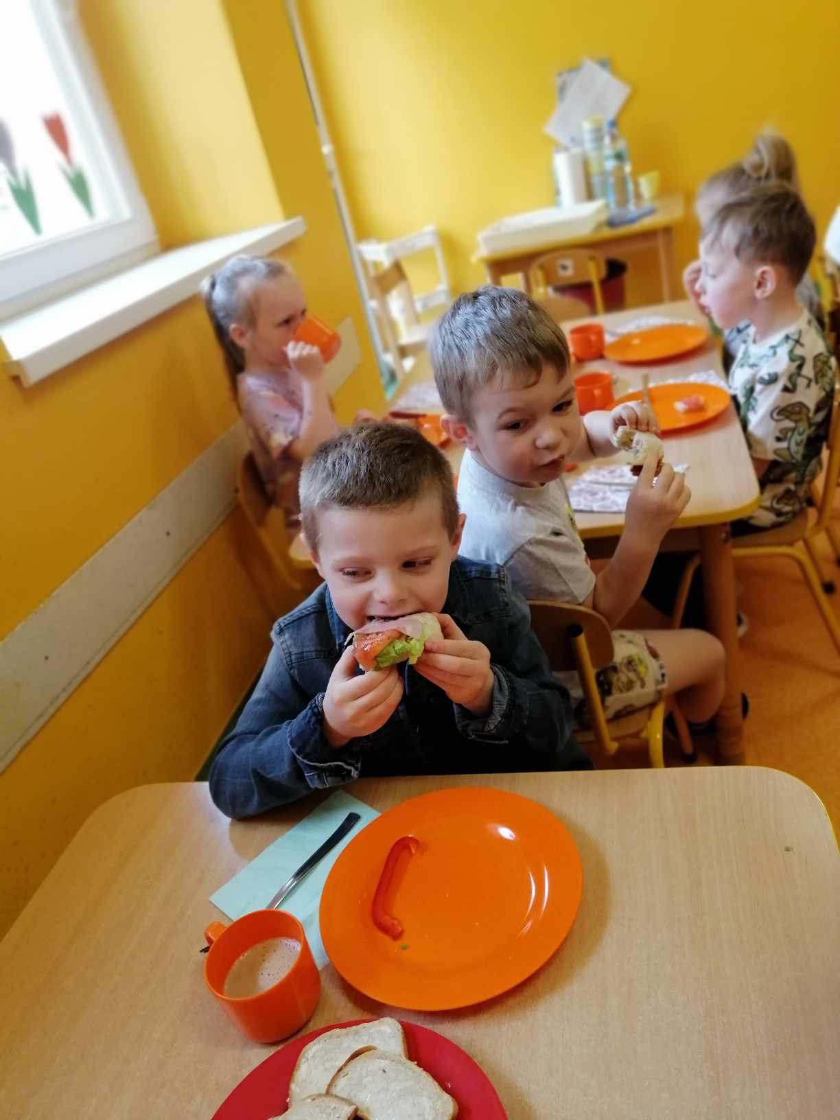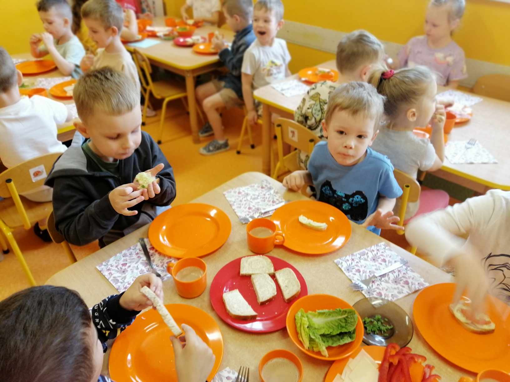 o higienę. Następnie odbyła się degustacja kanapek. Okazało się, że naszym milusińskim najlepiej smakowały te zrobione własnoręcznie, które wyglądały pięknie, kolorowo i zawierały mnóstwo witamin. Nawet największe niejadki zjadły swoje porcje z wielkim apetytem. Było bardzo, bardzo zdrowo, kolorowo, ale przede wszystkim smacznie!