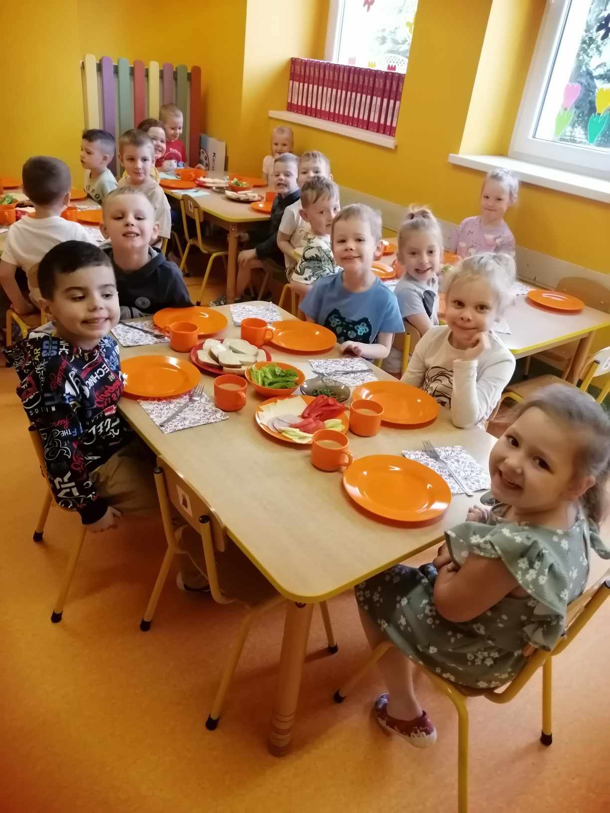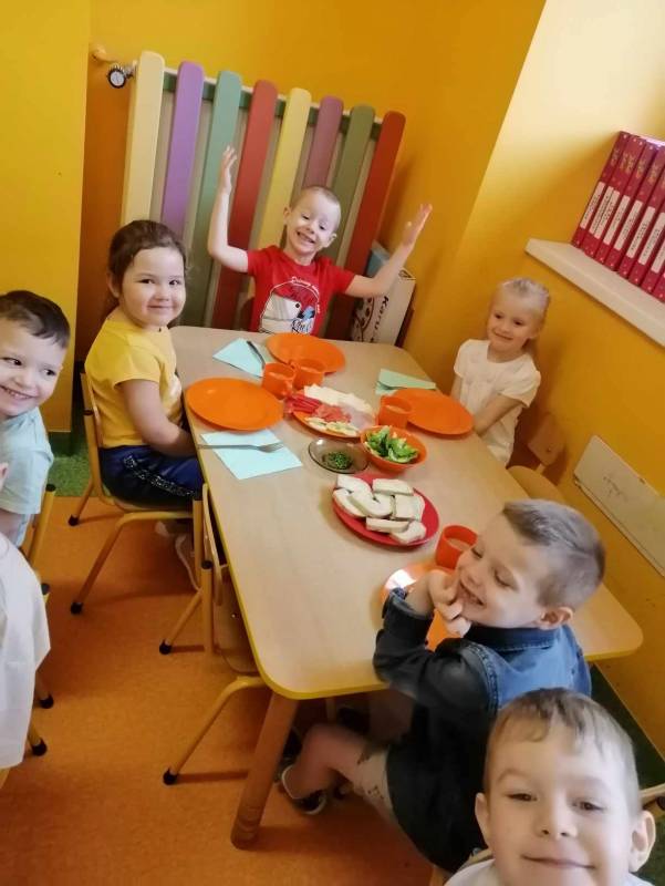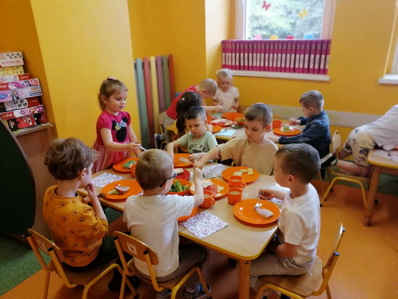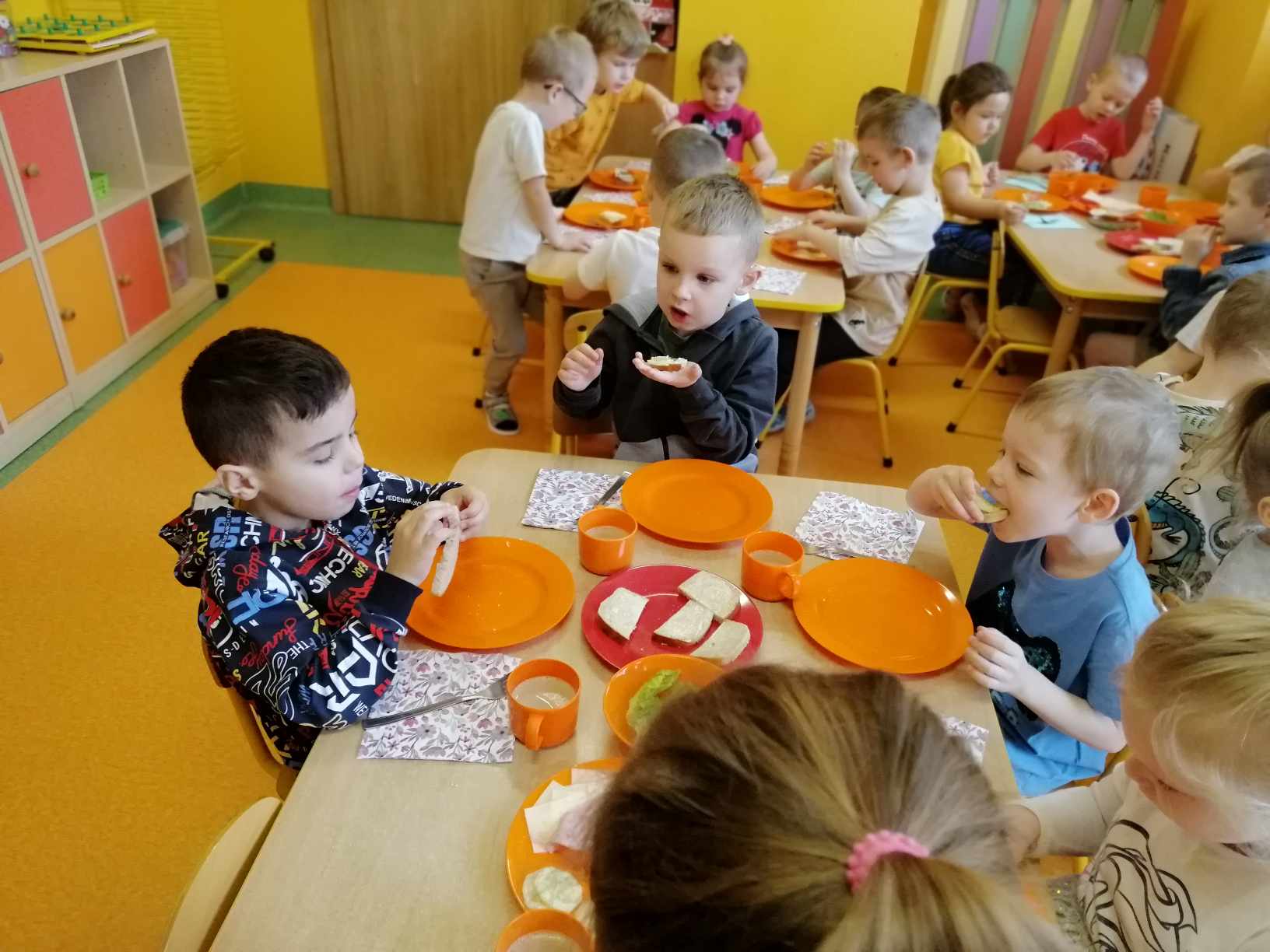 o higienę. Następnie odbyła się degustacja kanapek. Okazało się, że naszym milusińskim najlepiej smakowały te zrobione własnoręcznie, które wyglądały pięknie, kolorowo i zawierały mnóstwo witamin. Nawet największe niejadki zjadły swoje porcje z wielkim apetytem. Było bardzo, bardzo zdrowo, kolorowo, ale przede wszystkim smacznie!