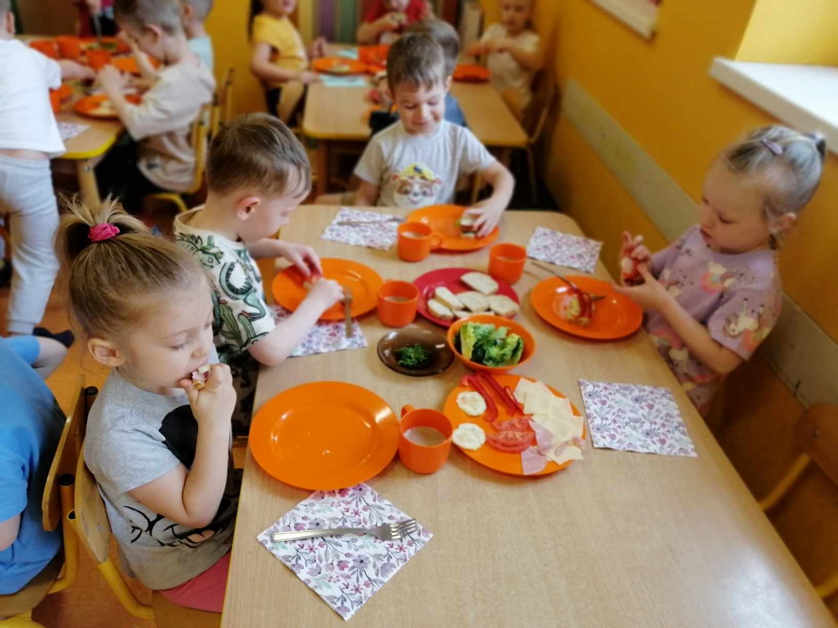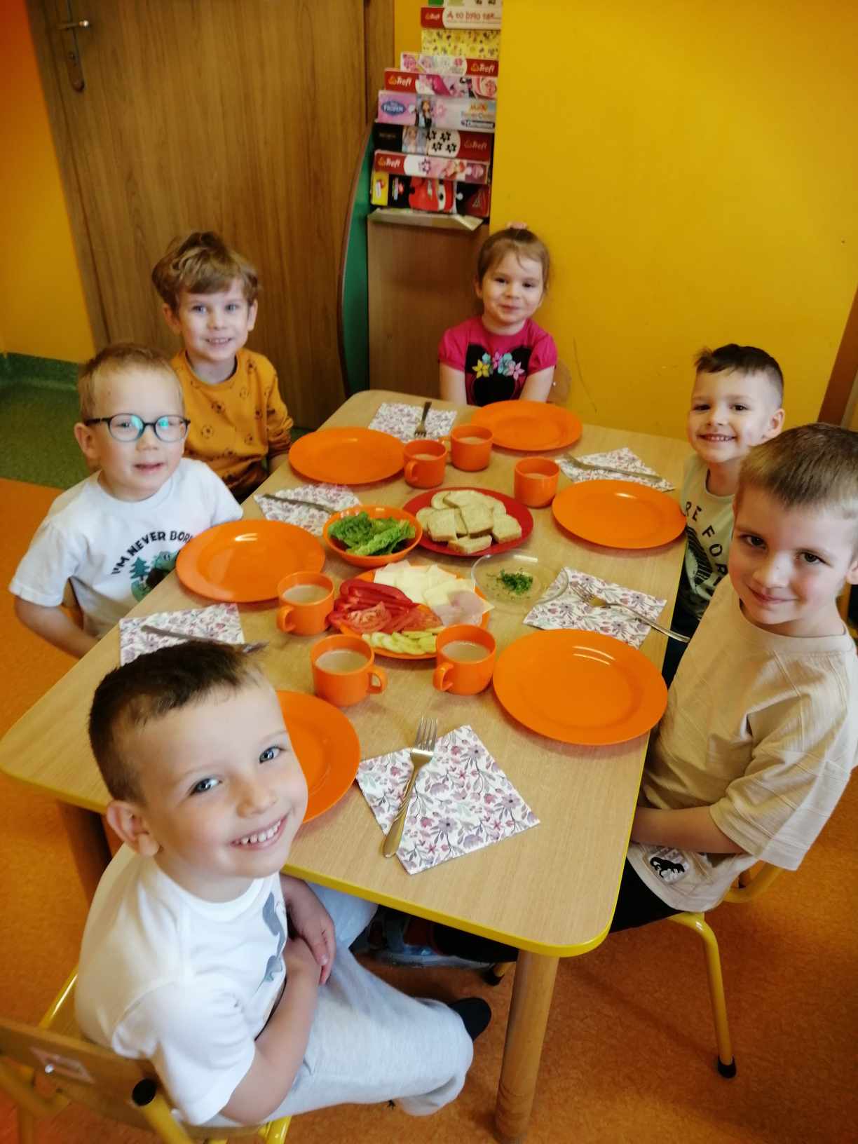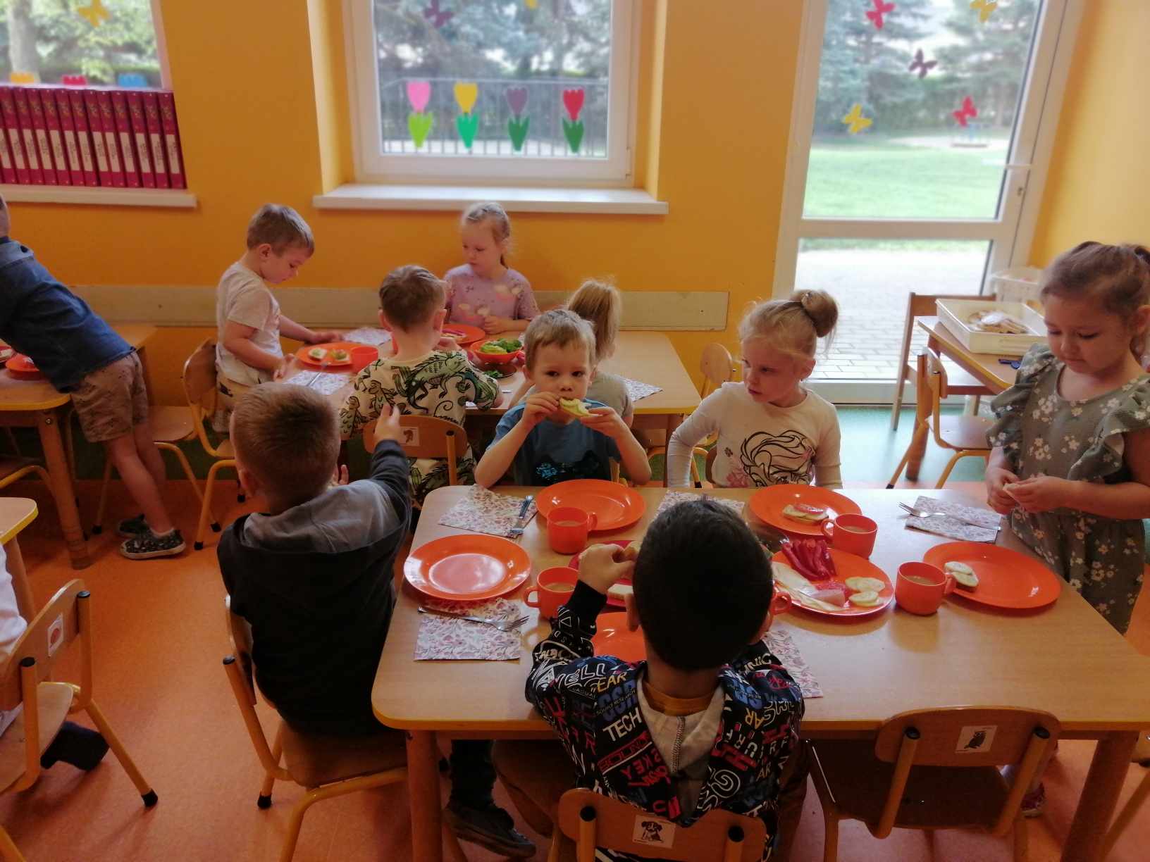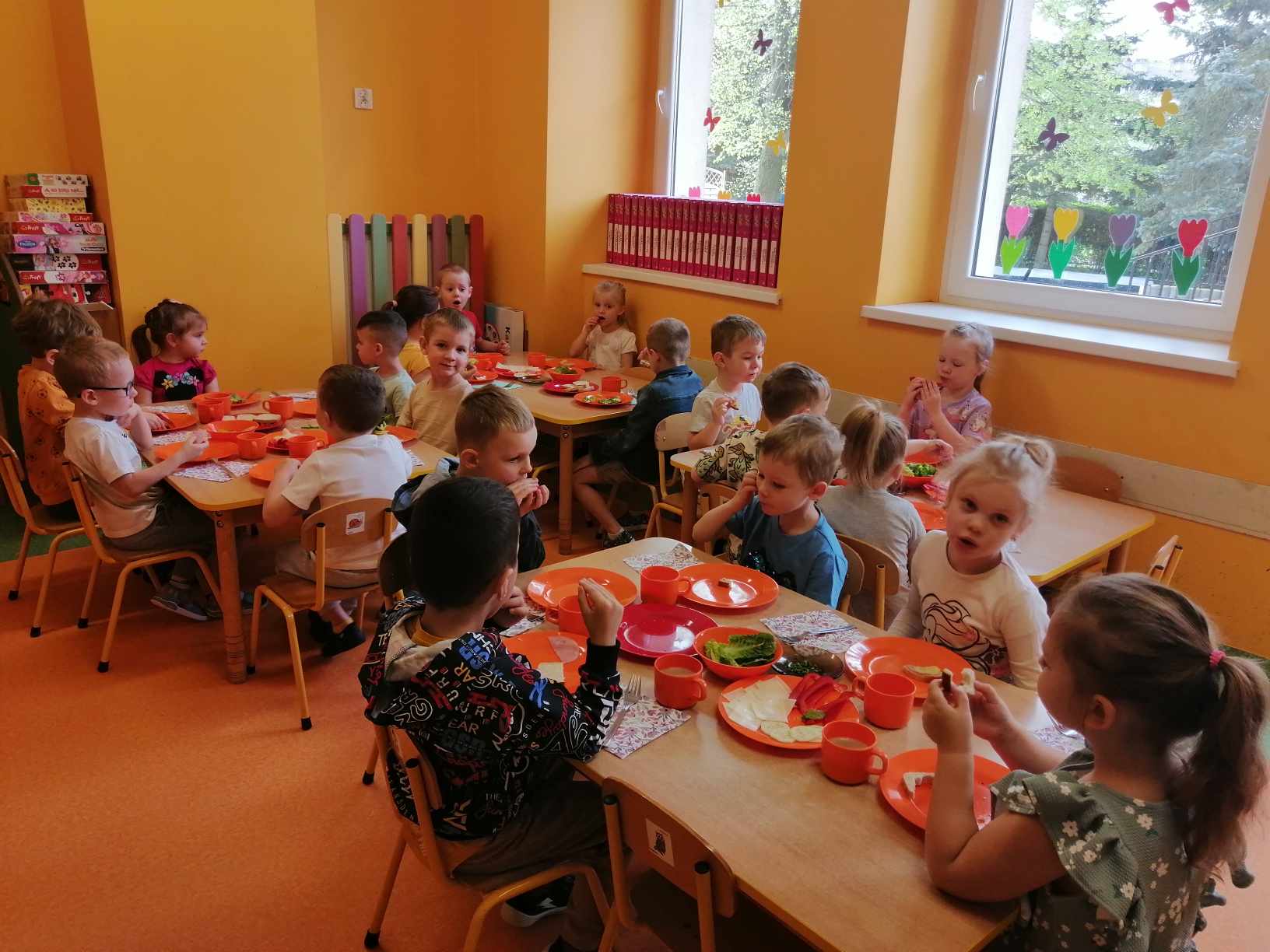 o higienę. Następnie odbyła się degustacja kanapek. Okazało się, że naszym milusińskim najlepiej smakowały te zrobione własnoręcznie, które wyglądały pięknie, kolorowo i zawierały mnóstwo witamin. Nawet największe niejadki zjadły swoje porcje z wielkim apetytem. Było bardzo, bardzo zdrowo, kolorowo, ale przede wszystkim smacznie!