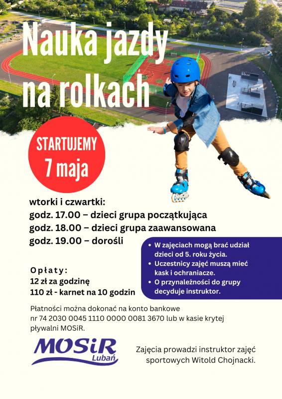 Wielbicieli jazdy na rolkach, tych zaawansowanych jak i początkujących, dzieci i dorosłych zapraszamy na zajęcia, które będa odbywały się w każdy wtorek i czwartek na obiekcie sportowo-rekreacyjnym "kartingi" przy ul. Działkowej w Lubaniu. Pierwsze zajęcia ruszają już 7 maja 2024r. o godzinie 17:00.