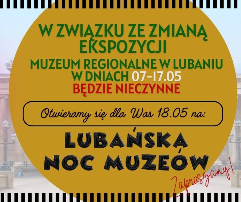 W związku ze zmianą ekspozycji i przygotowaniami do Lubańskiej Nocy Muzeów i Historycznych Smaków, uprzejmie informujemy, że Muzeum Regionalne w Lubaniu będzie nieczynne do 17.05.