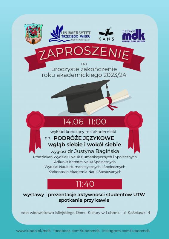 Zapraszamy 14.06.204 r. godz. 11:00 na salę widowiskowa Miejskiego Domu Kultury w Lubaniu, na wykład kończący rok akademicki pn. "PODRÓŻE JĘZYKOWE wgłęb siebie i wokół siebie".