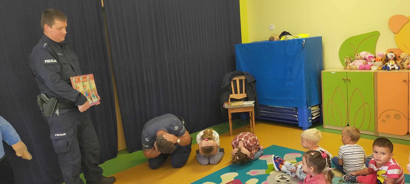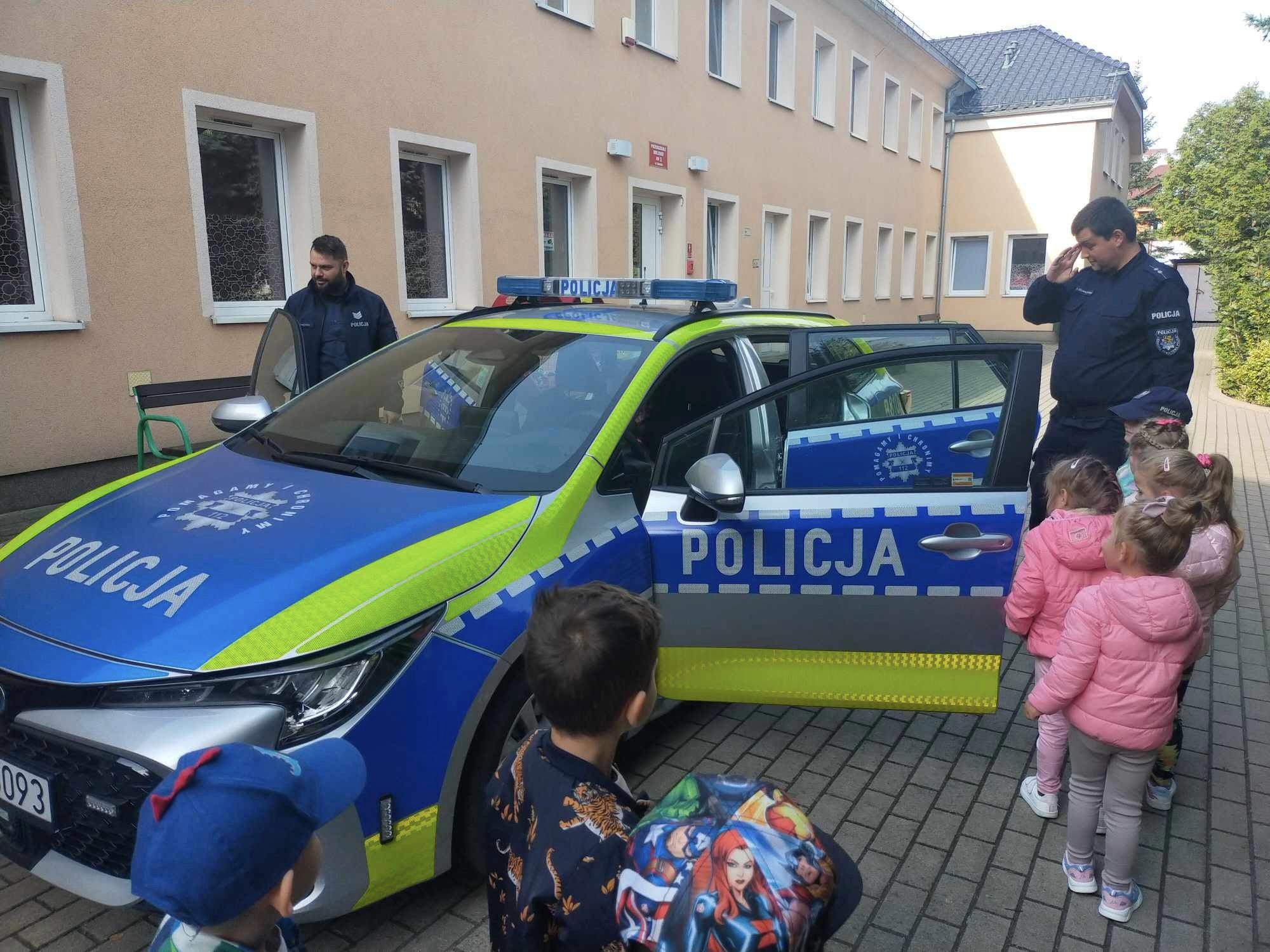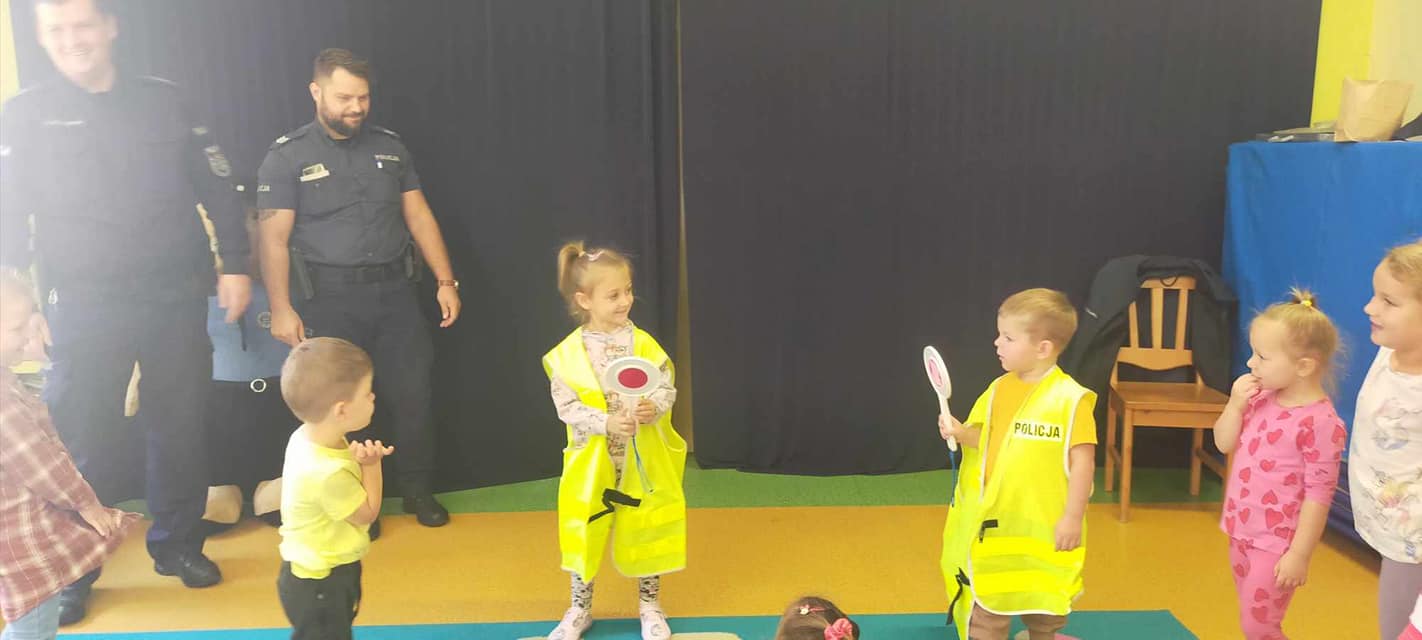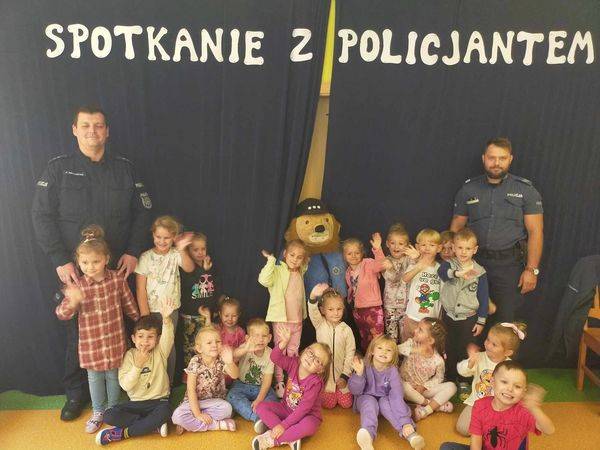 24 września 2024r. w naszym przedszkolu odbyło się spotkanie z policjantami Panem Kamilem i Panem Maćkiem z Komendy Powiatowej Policji w Lubaniu. Tematem spotkania było utrwalenie z dziećmi zasad ruchu drogowego oraz przypomnienie zagadnień dotyczących bezpieczeństwa dzieci w przedszkolu i w domu. Panowie policjanci, w formie praktycznej, przypomnieli podstawowe zasady zachowania się podczas przechodzenia przez jezdnię. Następnie wytłumaczyli, jak należy zachować się w kontaktach z obcymi ludźmi, jak dbać o bezpieczeństwo własne i innych oraz do kogo zwracać się o pomoc w sytuacji zagrożenia. Policjanci poinformowali i zademonstrowali dzieciom również, w jaki sposób należy się zachowywać podczas ataku psa. Dzieci z dużym zainteresowaniem słuchały rad i wskazówek zaproszonych gości. Wiele radości sprawiło również dzieciom obejrzenie radiowozu z bliska. Na zakończenie wizyty przedszkolaki wręczyły panu policjantowi podziękowanie.