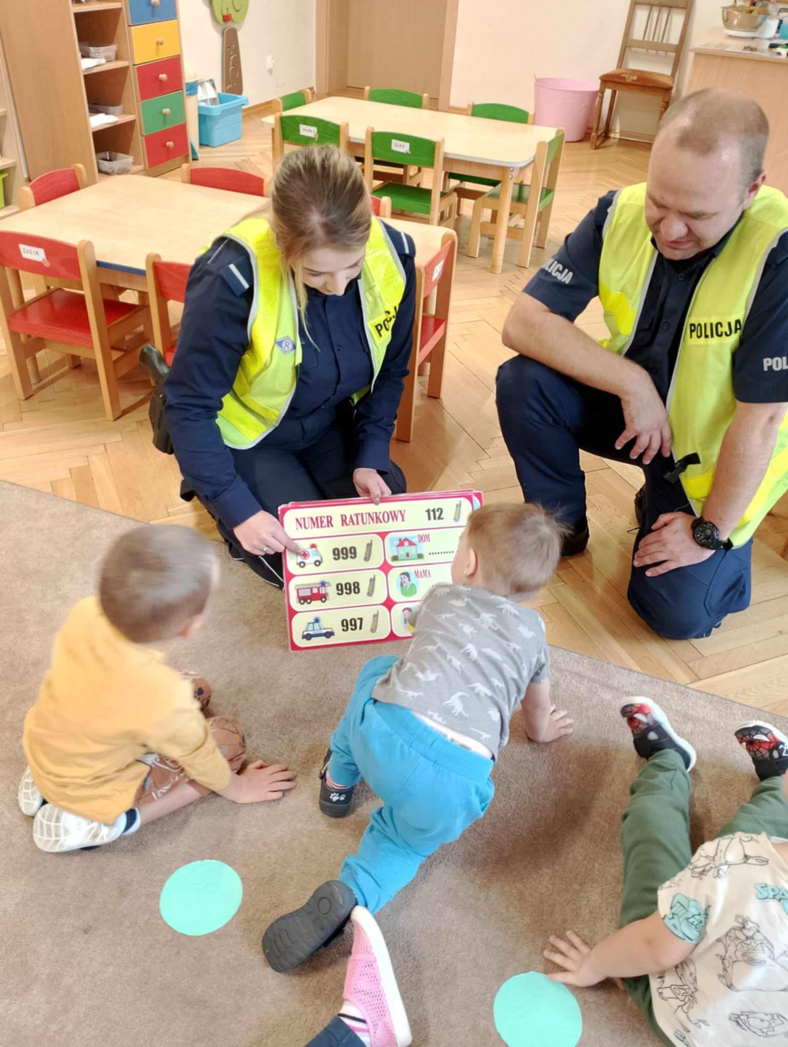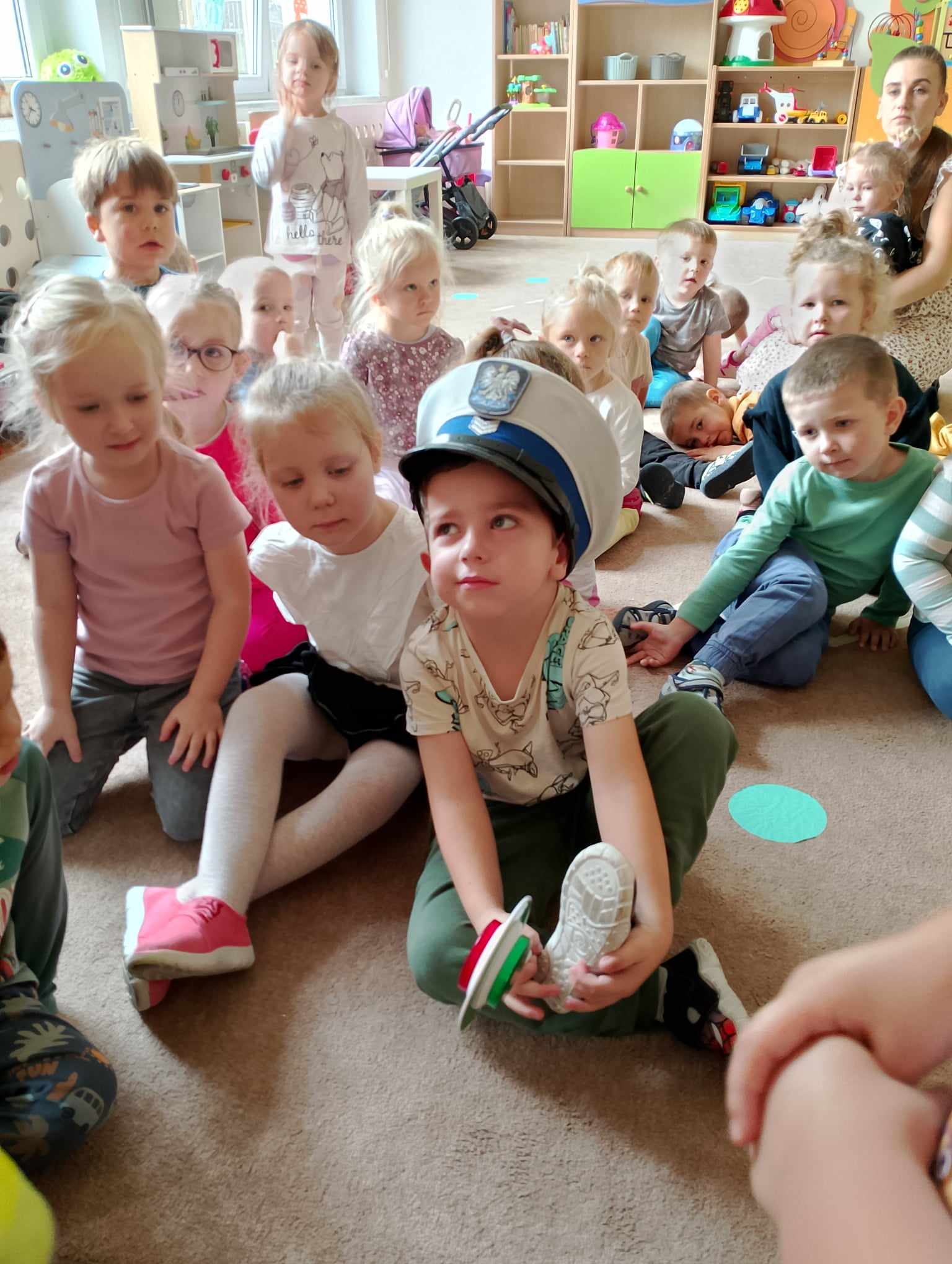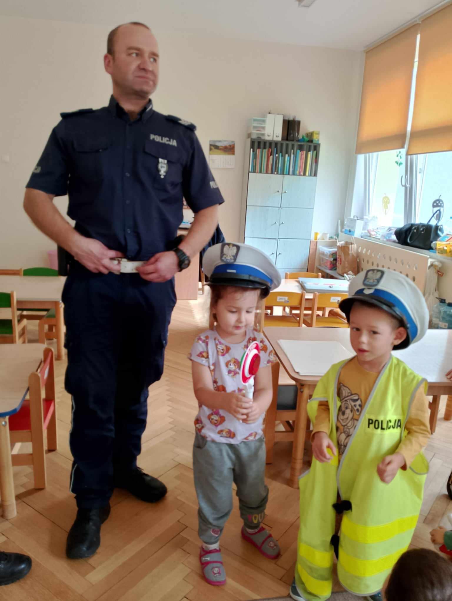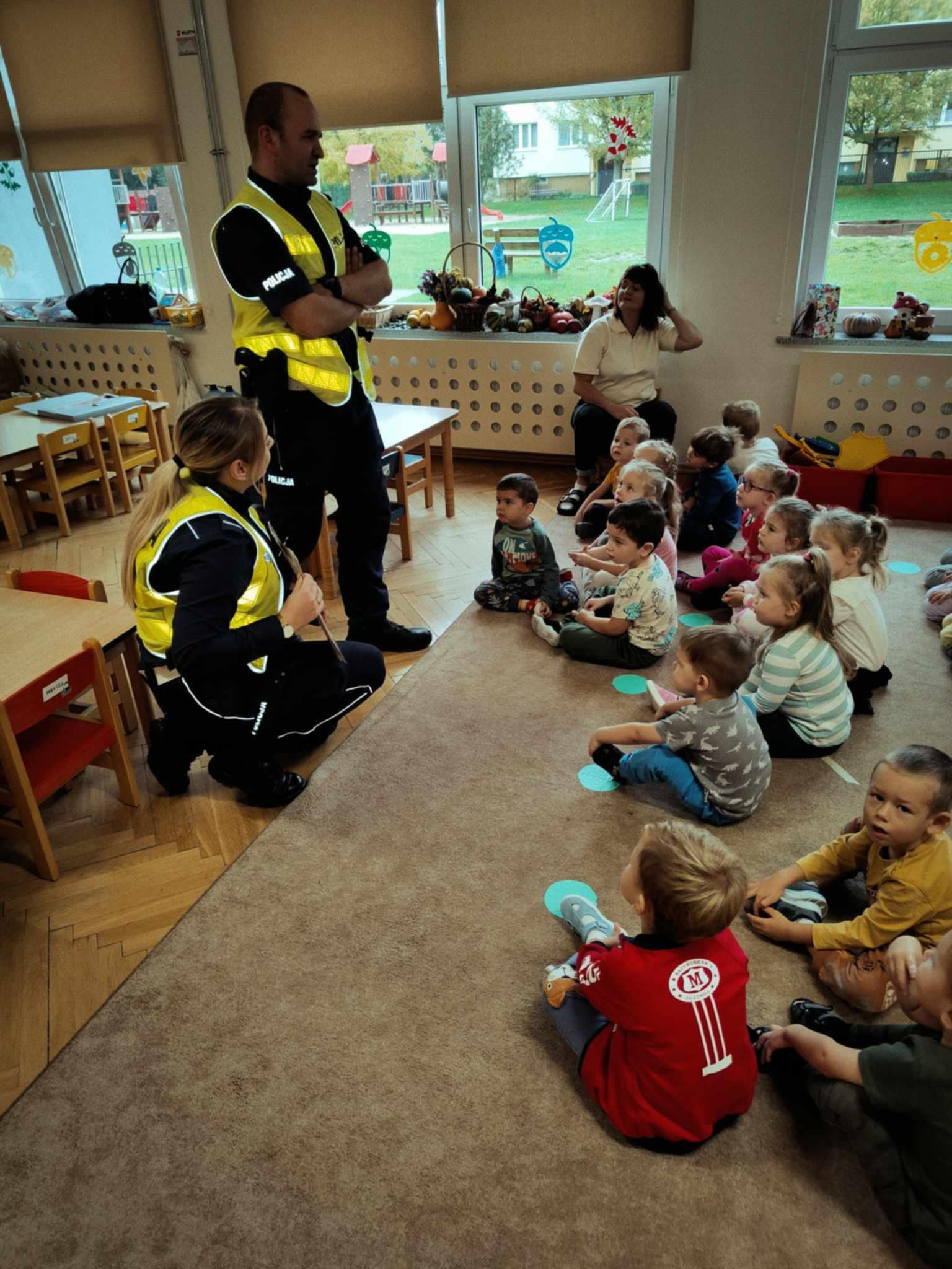 Policjanci wykorzystali plansze demonstracyjne zapoznając dzieci z włściwymi zasadami zachowania się pieszych i pojazdów na drodze. Ponadto pan policjant przypomniał jak należy zachować się w kontaktach z obcymi ludżmi, jak dbać o bezpieczeństwo własnei innychoraz do kogo zwracać się o pomoc w sytuacji zagrożenia. Podany został numer alarmowy - 112 . Dzieci z dużym zainteresowaniem słuchały rad i wskazówek zaproszonych gości. Każde dziecko mogło zapoznać się z wyposażeniem policyjnym niezbędnym podczas wykonywania pracy. Dziękujemy za wspaniałe przeżycia i przybliżenie tak odpowiedzialnego zawodu, jakim jest zawód policjanta.