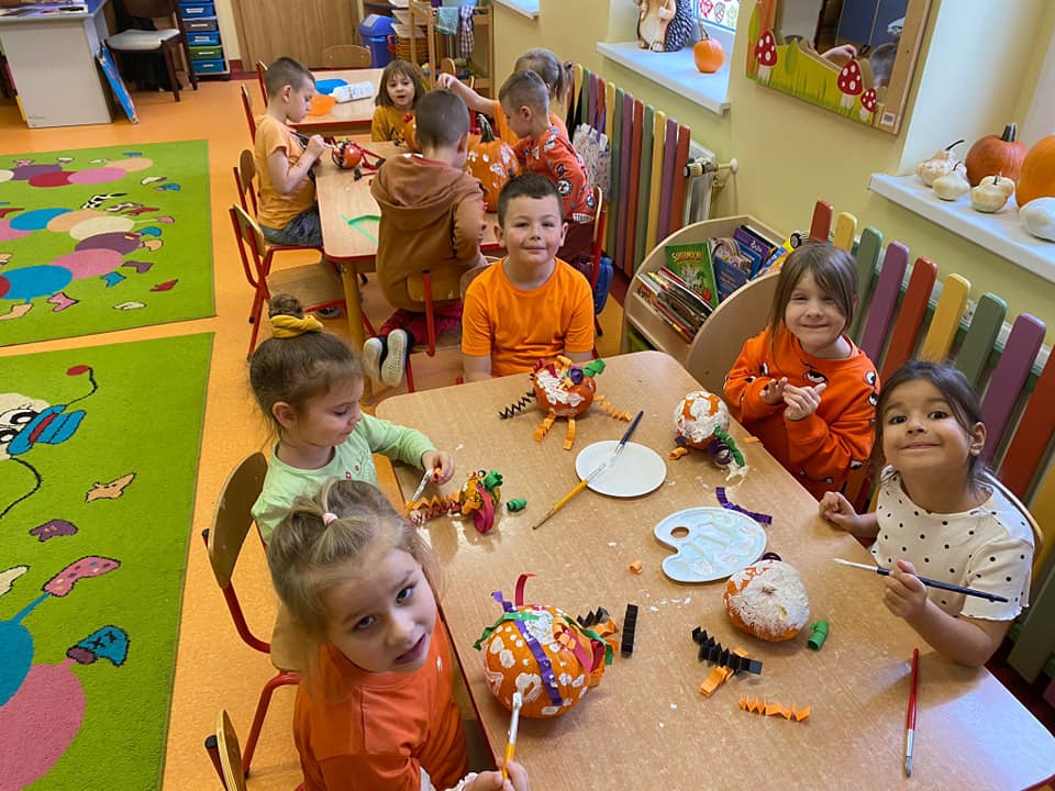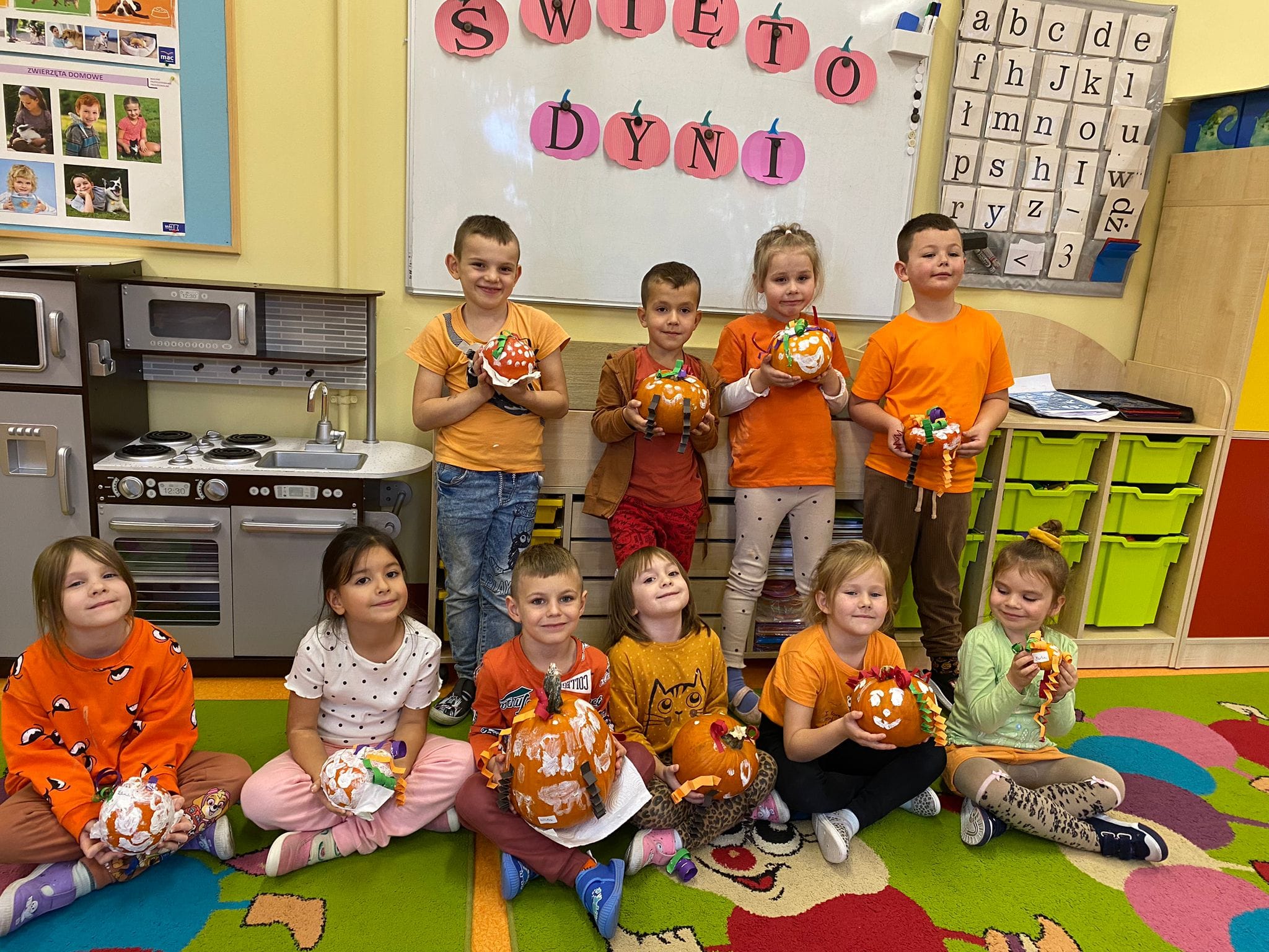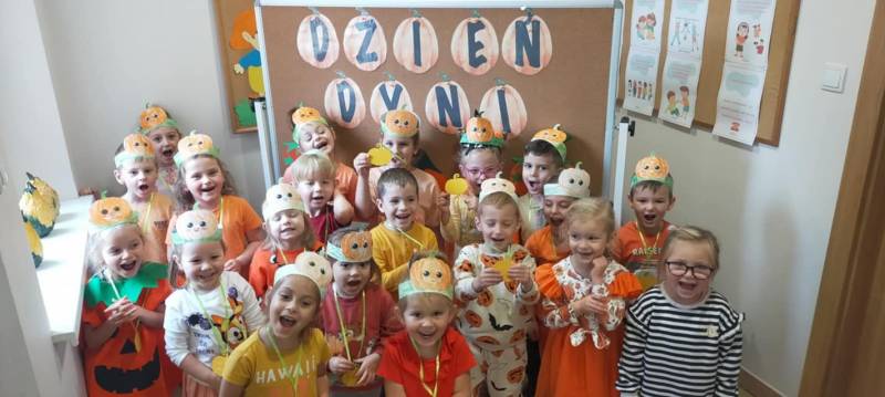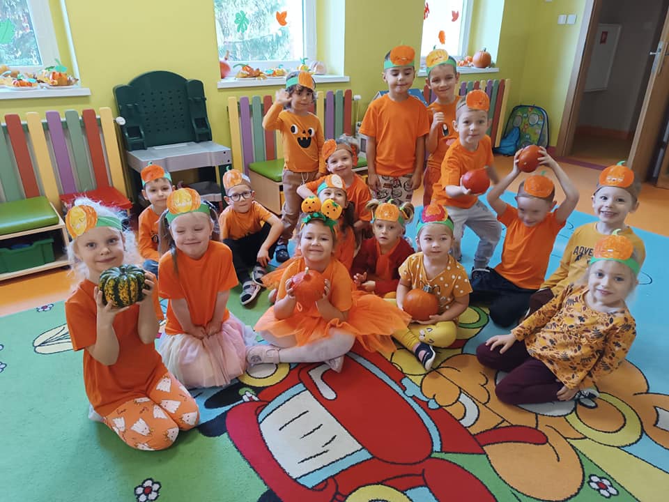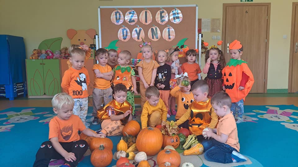 W czwartek 31 października obchodziliśmy w naszym przedszkolu Dzień Dyni, który był fantastyczną okazją do wspólnej zabawy, przepełnioną pięknym jesiennym kolorem pomarańczowym. W świętowaniu wzięły udział wszystkie przedszkolaki, które tego dnia przyniosły do przedszkola dynie o różnych kształtach, kolorach i gabarytach. Dzieci zobaczyły, co kryje się w środku dyni oraz co można z niej przyrządzić. Każda z grup przygotowała piękne prace plastyczne, które stały się ozdobą naszego przedszkola.  Nie zabrakło zawodów sportowych z wykorzystaniem dyni oraz dyniowych tańców. Niemałą atrakcją okazała się fotobudka, która zwieńczyła ten pełen atrakcji dzień.