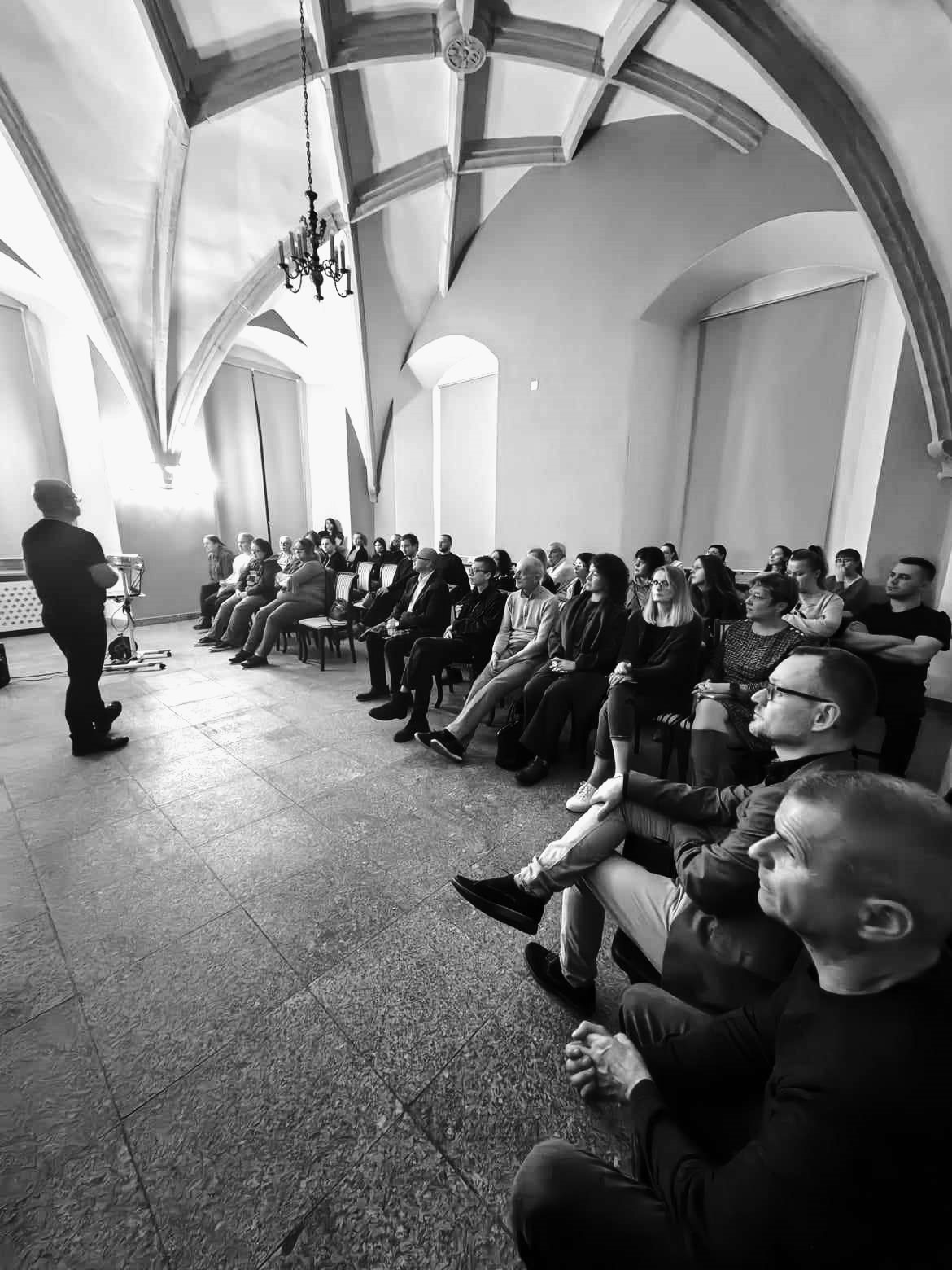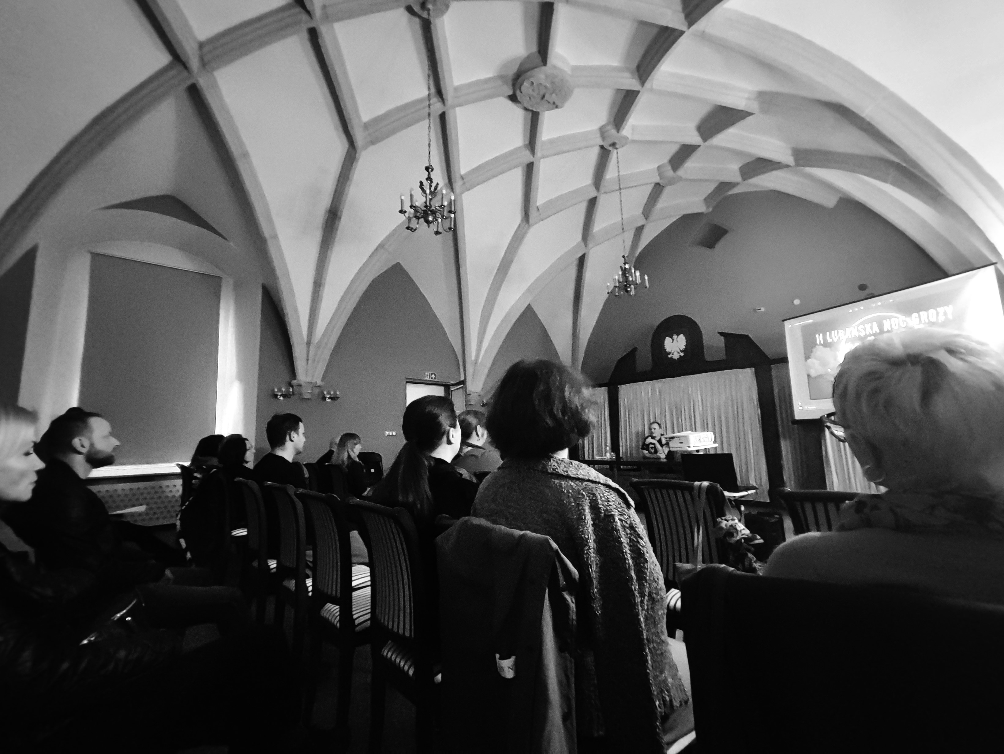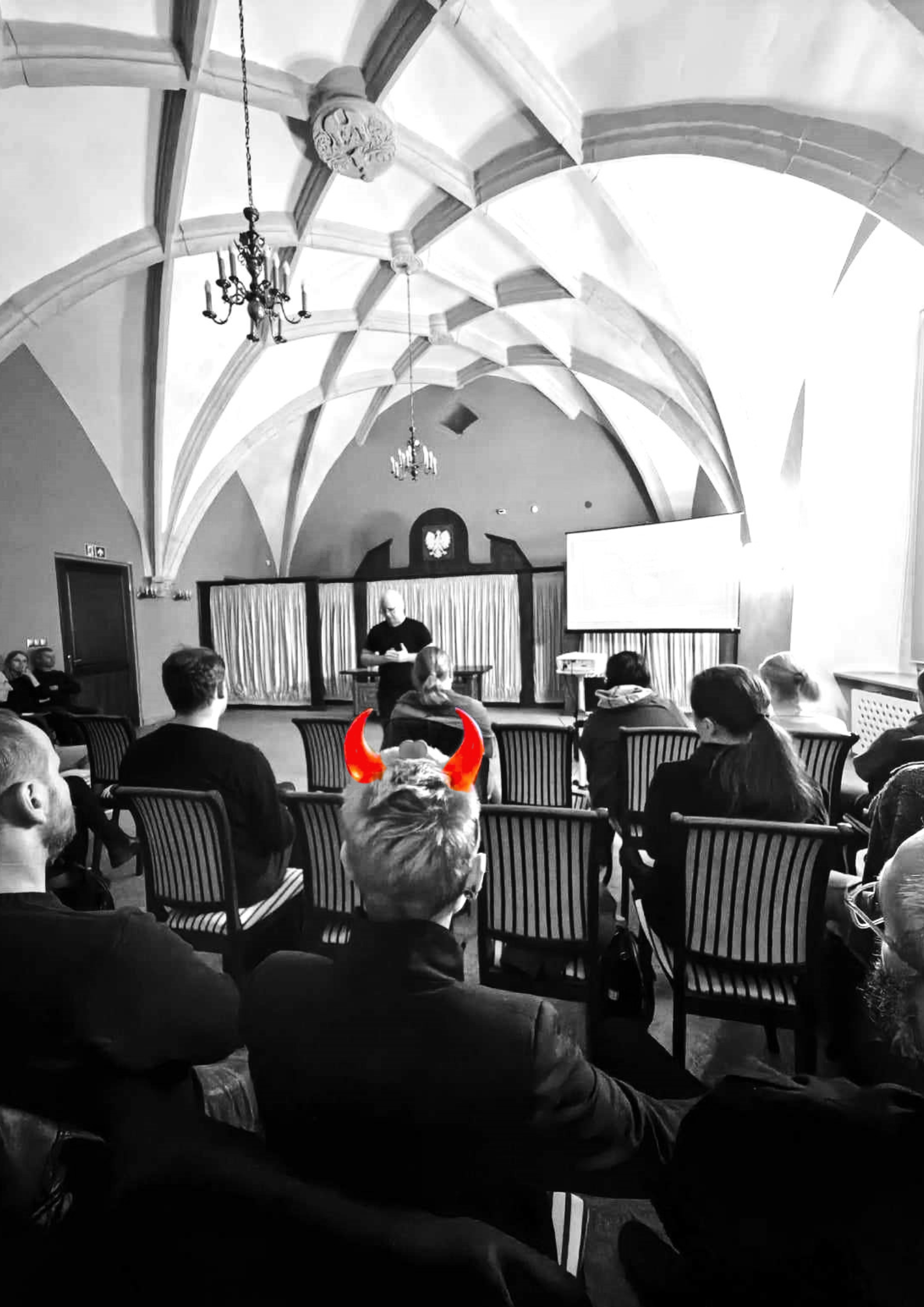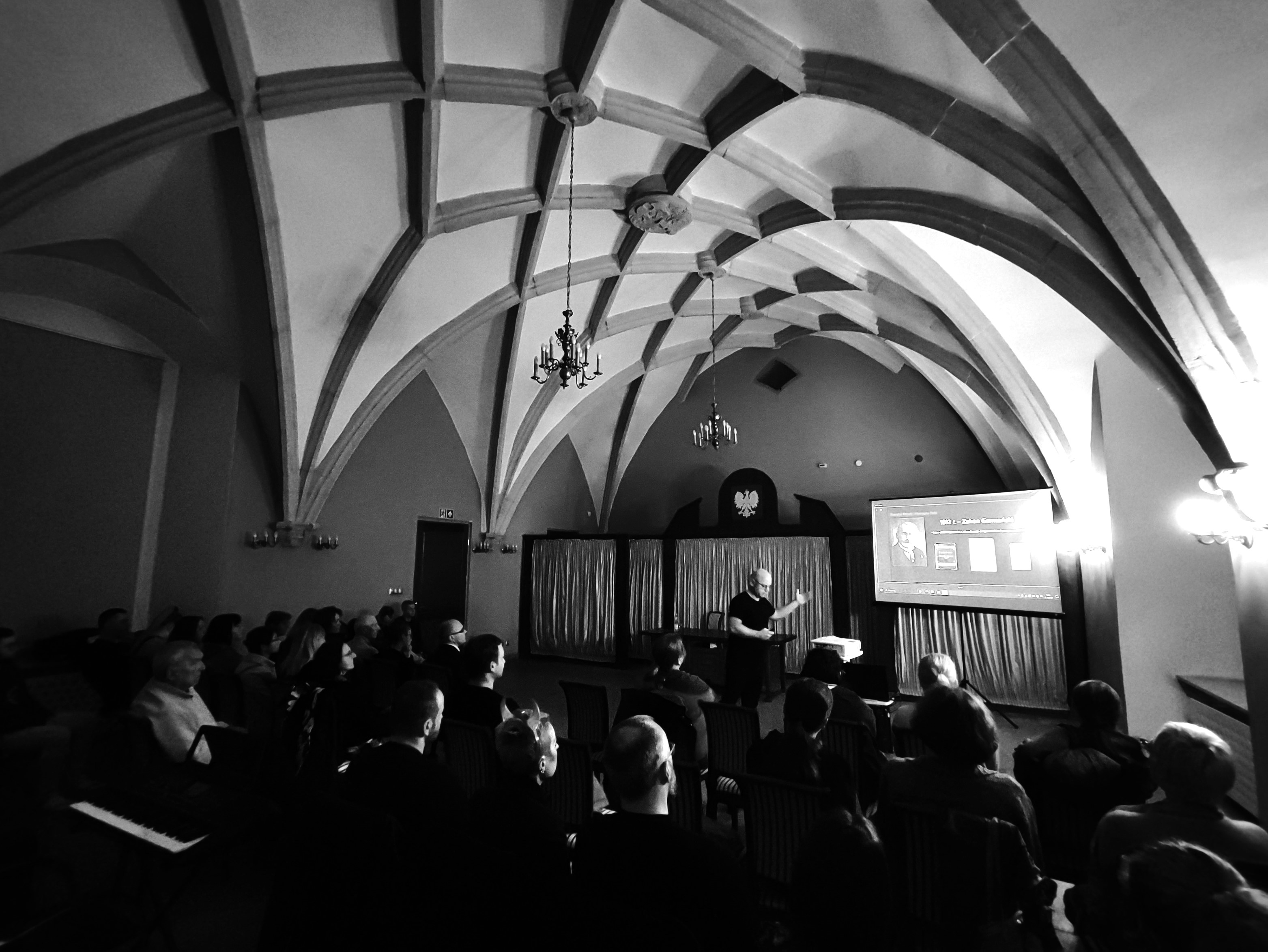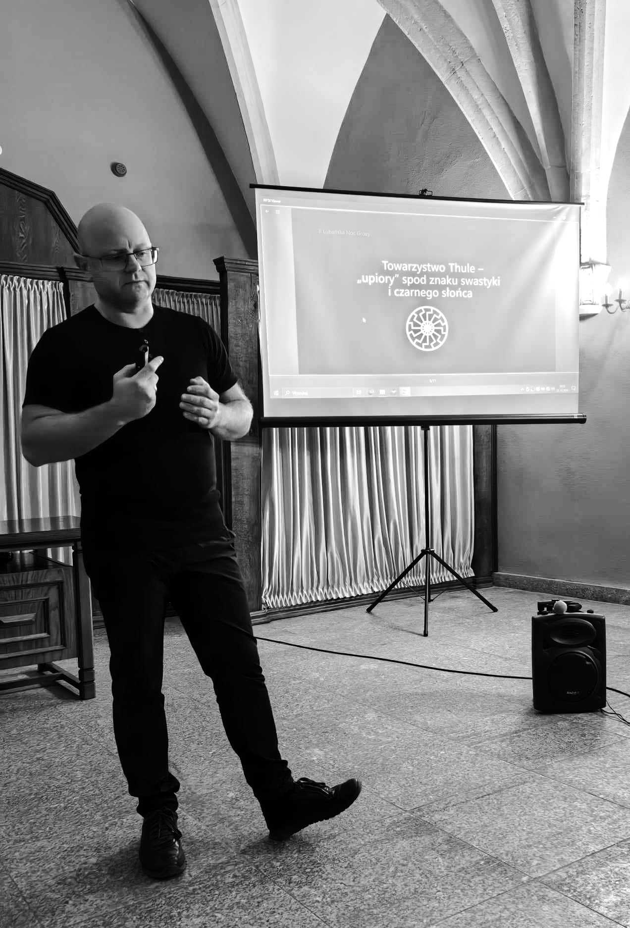 Kolejnym mówcą był Pan Łukasz Tekieli, Dyrektor Muzeum Regionalnego. Opowiadał o Towarzystie Thule w kontekście swastyki i czarnego słońca. Najbardziej przerażające w całej historii były współczesne ruchy tej organizacji, do której może zapisać się każdy pod warunkiem, że… potwierdzi swoją aryjskość…