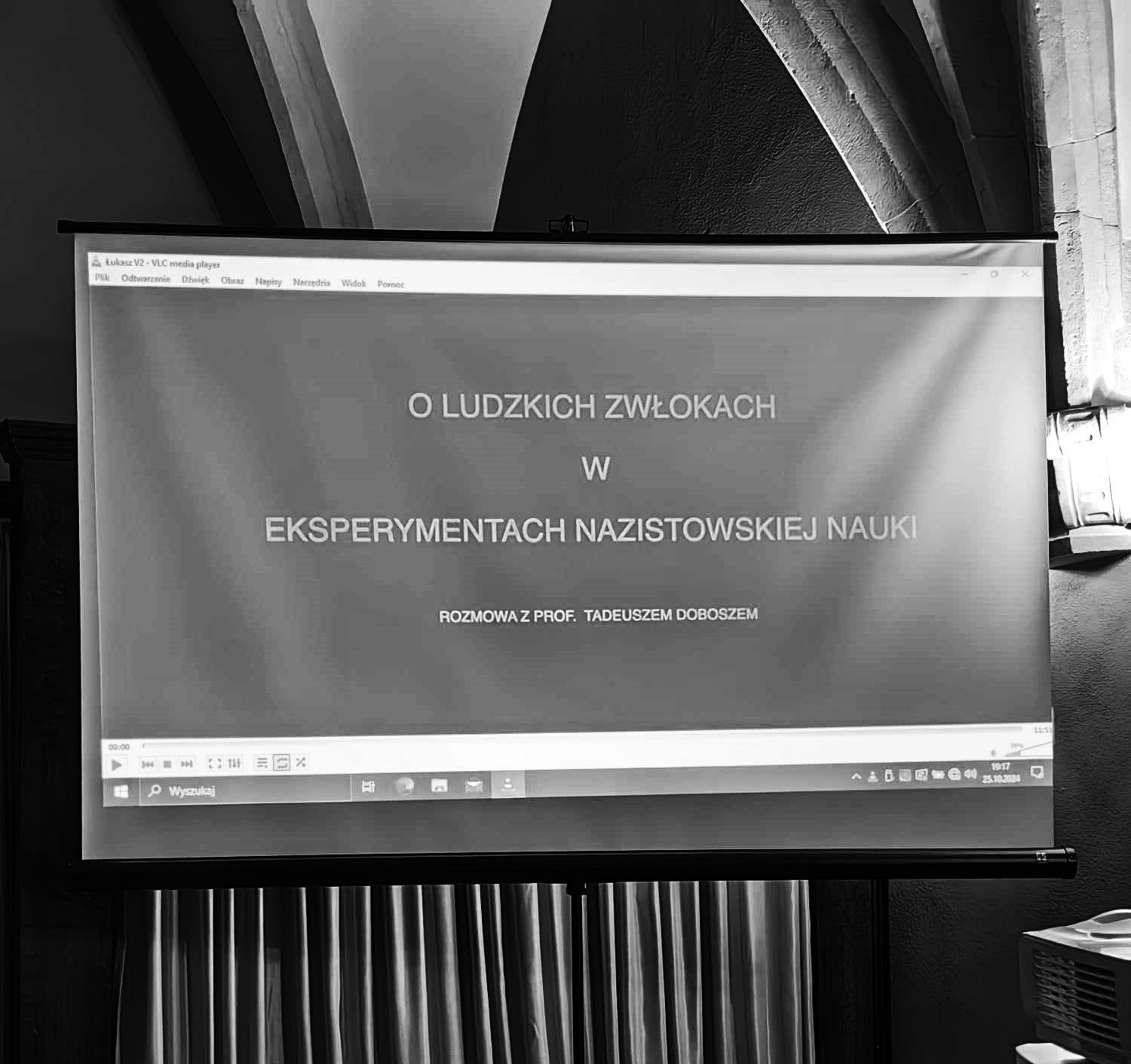Spotkanie zakończył film-wywiad z prof. Tadeuszem Doboszem z Muzeum Medycyny Sądowej we Wrocławiu, który opowiadał wstrząsające historie o ludzkich zwłokach w eksperymentach nazistowskiej nauki.
