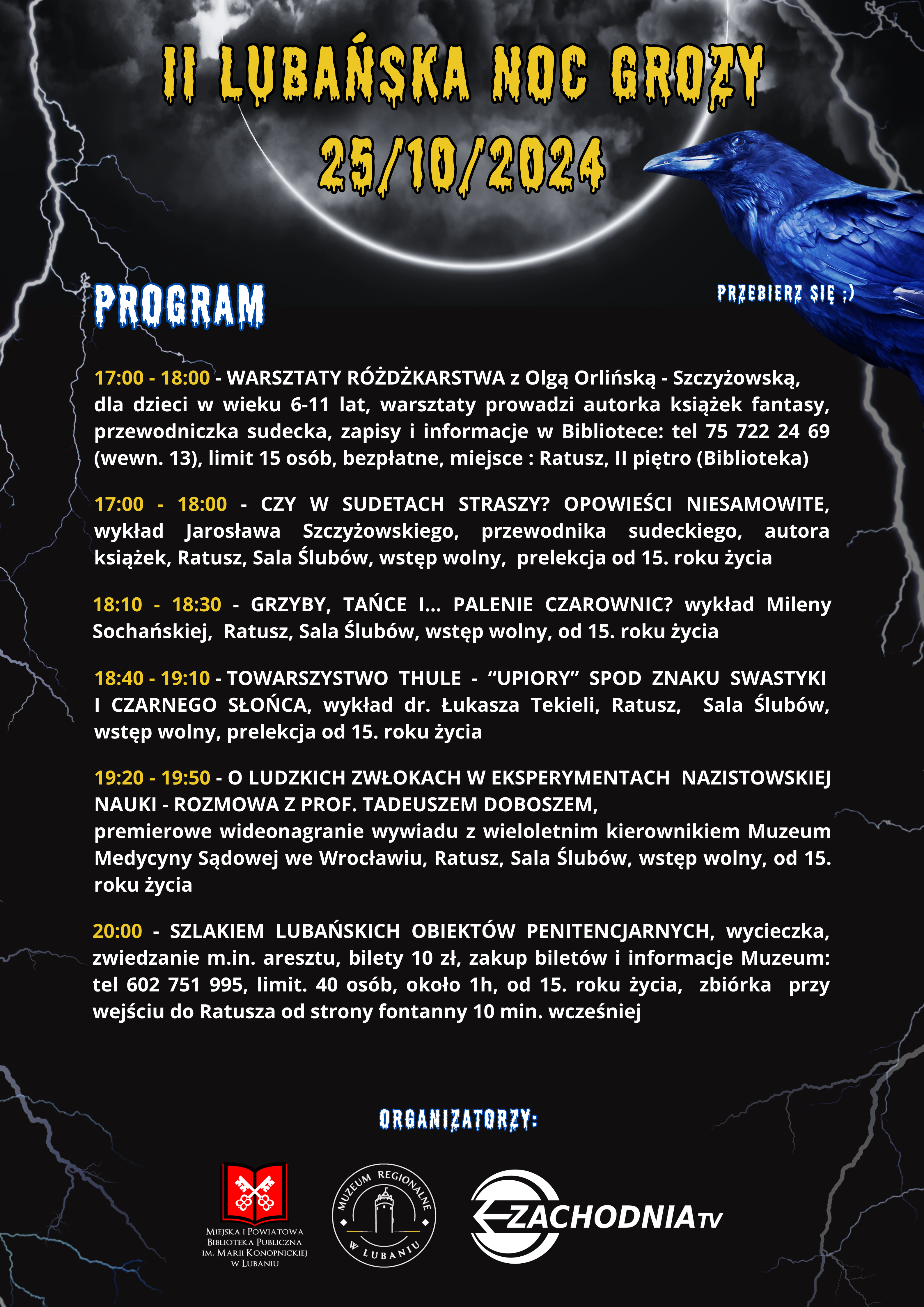 Lubańska Noc Grozy na stałe zadomowiła się w naszym kalendarzu. Po raz drugi Miejska i Powiatowa Biblioteka Publiczna im. Marii Konopnickiej w Lubaniu połączyliśmy siły wraz z Muzeum Regionalnym w Lubaniu, by zaprezentować mieszkańcom historię najbliższych „strasznych” miejsc, przedstawić mroczne tajemnice z okolicy oraz pokazać kawał historii, która nie jest łatwa do słuchania.