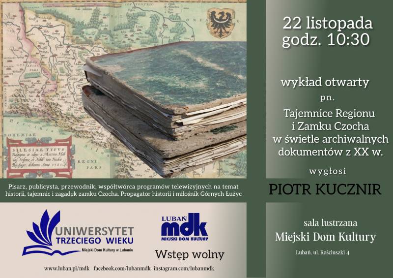 Wykład wygłosi Piotr Kucznir - pisarz, publicysta, przewodnik, współtwórca programów telewizyjnych na temat historii, tajemnic i zagadek Zamku Czocha. Propagator historii i miłośnik Górnych Łużyc.