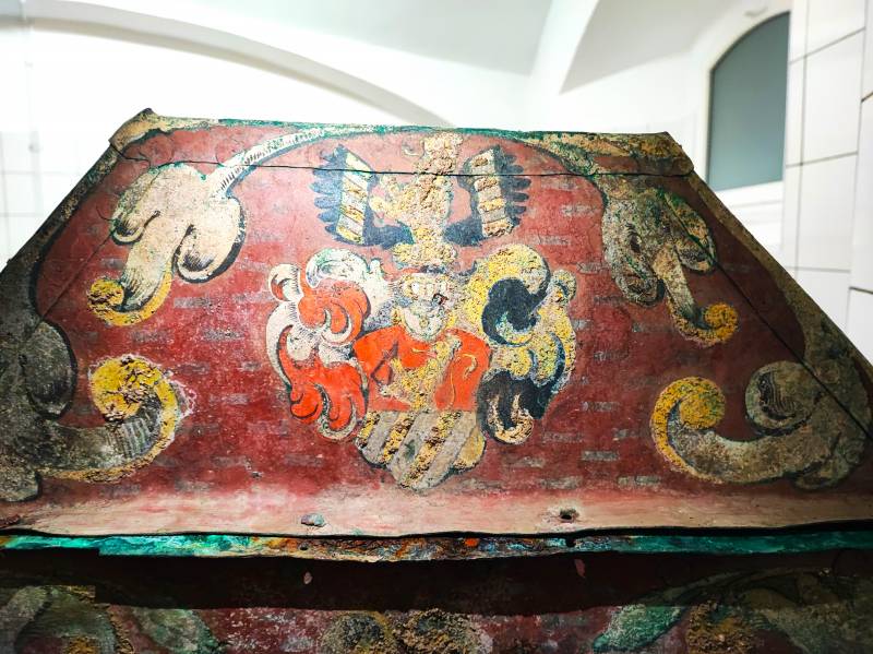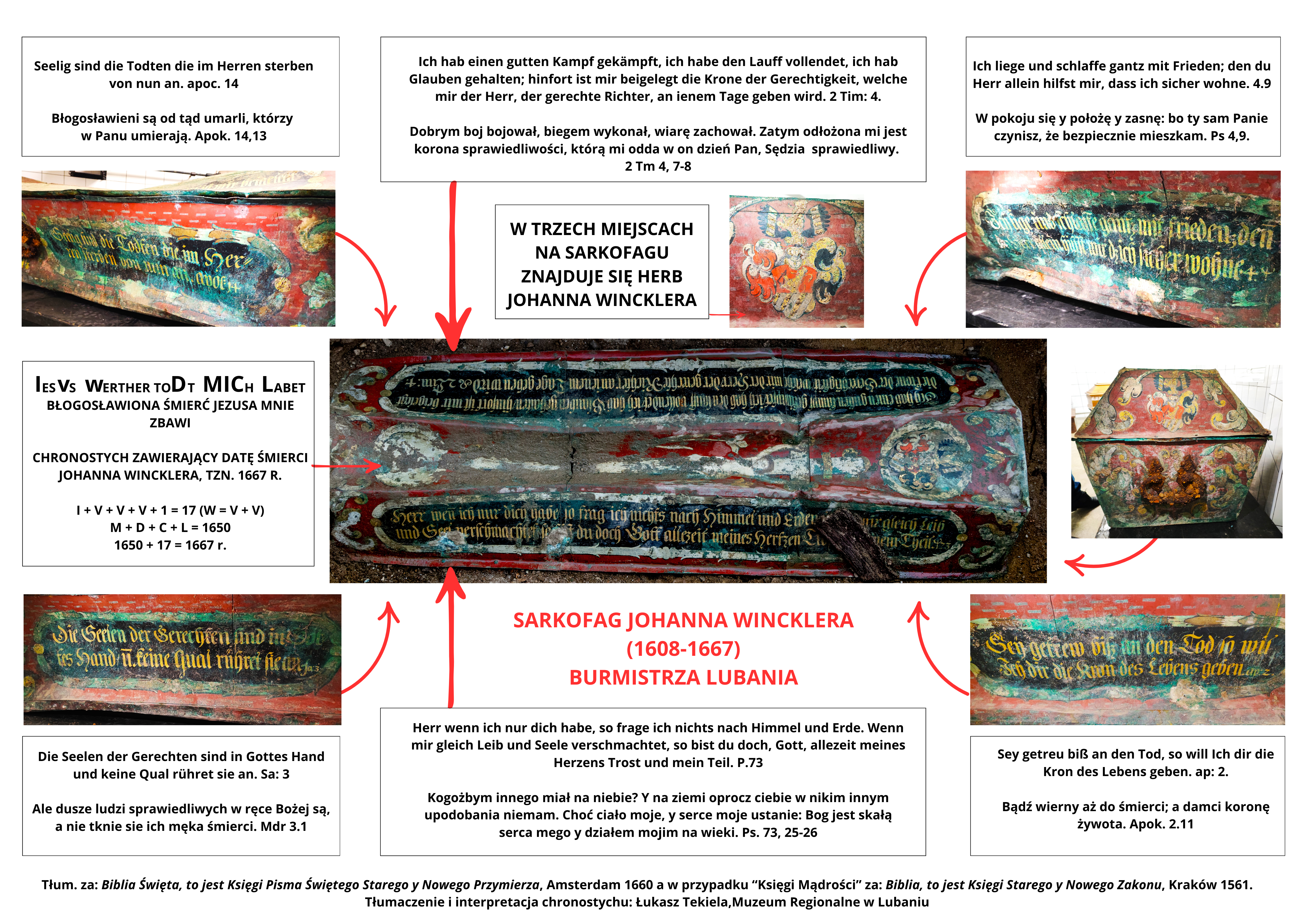 Sarkofag burmistrza Johanna Wincklera został bogato zdobiony i inskrypcje na nim namalowane wzbudziły ciekawość wielu ludzi, w tym naszą. Poniżej prezentujemy oryginalne inskrypcje w języku niemieckim oraz polskie tłumaczenie wraz z wyszczególnieniem miejsca, w którym owe inskrypcje się znajdują. Polskie tłumaczenie pochodzi z czasów nowożytnych, wykorzystaliśmy je aby oddać ducha historii. Zachęcamy do zapoznania się.