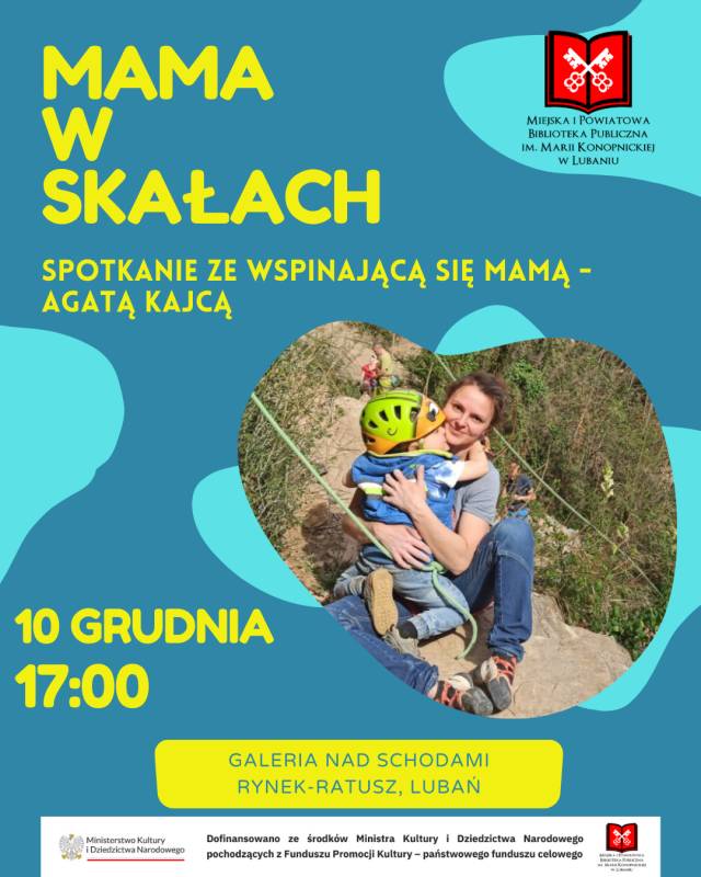 Lubimy zapraszać do nas inspirujące osoby, które nie idą utartą ścieżką. Które mają pasje i swoją osobą potrafią nią zarazić. Taką osobą jest na pewno Pani Agata Kajca – znana szerzej jako Mama w Skałach. Będziemy mieli okazję porozmawiać z nią już 10 grudnia o godzinie 17:00 w Galerii nad Schodami w naszej Bibliotece.