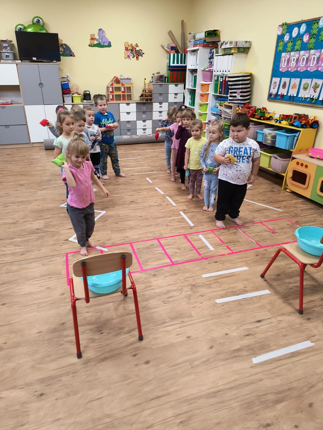 Do ćwiczeń często używamy niekonwencjonalnych przyborów (przedmiotów codziennego użytku),co jeszcze bardziej zachęca dzieci do udziału w zajęciach.