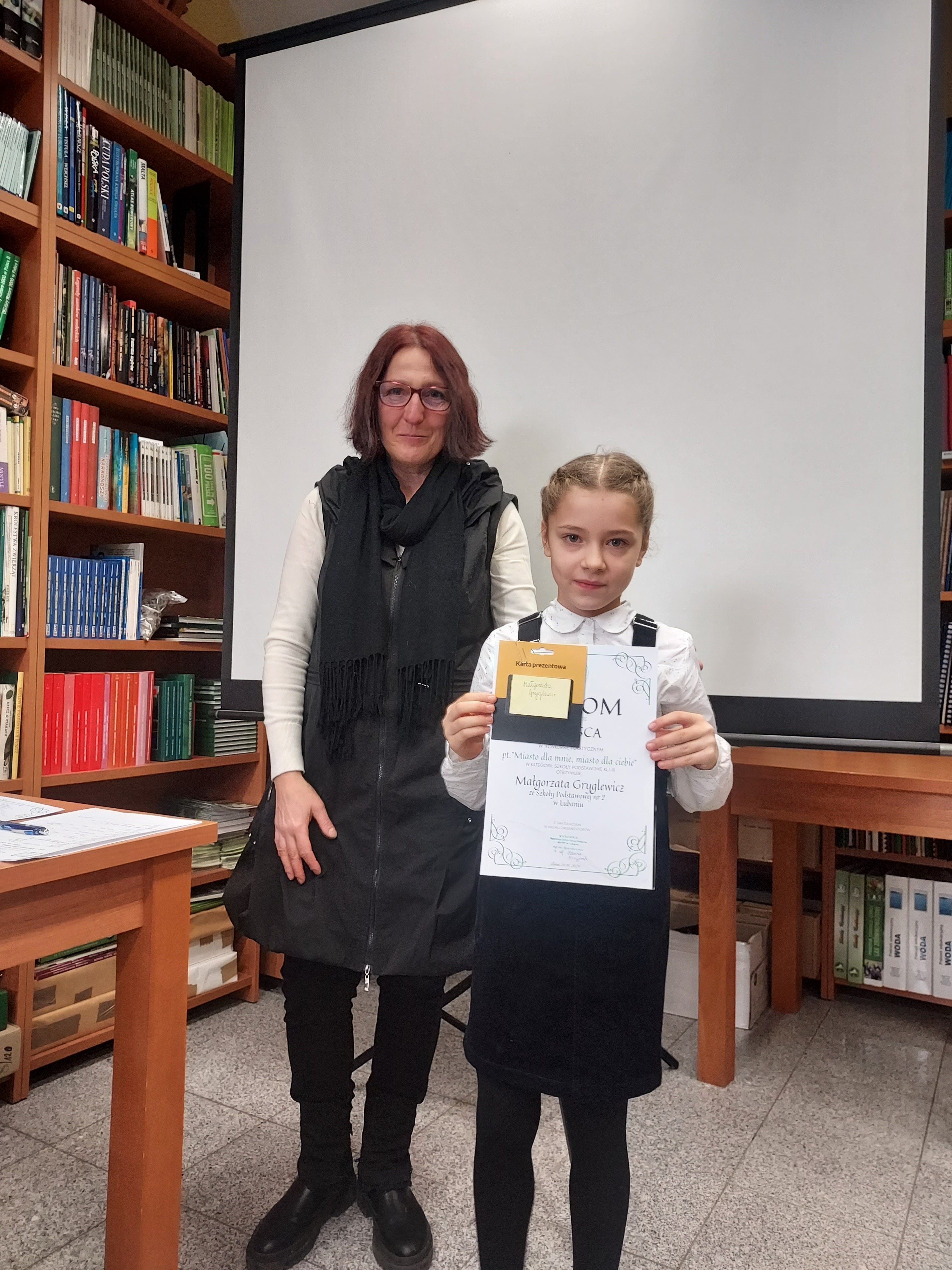 Z radością informujemy, że dziś nasza uczennica klasy II B, Małgorzata Gryglewicz, odebrała nagrodę za zajęcie ex aequo pierwszego miejsca w konkursie plastycznym "Miasto dla mnie, miasto dla ciebie", organizowanym przez Regionalne Centrum Edukacji Ekologicznej w Lubaniu. Konkurs cieszył się dużym zainteresowaniem – swoje prace zgłosiło aż 53 autorów. Tym bardziej jesteśmy dumni z sukcesu Małgosi, której talent i zaangażowanie zostały docenione. Serdecznie gratulujemy Małgosi i życzymy jej dalszych sukcesów w rozwijaniu pasji artystycznych!
