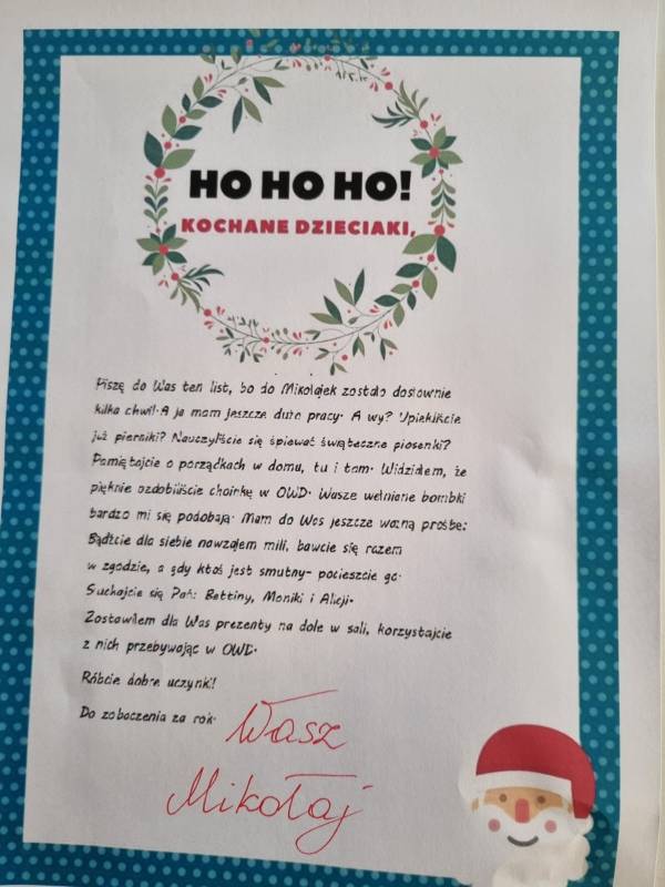 Po powrocie do zabawy okazało się, że na dzieci czekał list od św. Mikołaja. A w nim wiele informacji świadczących o tym, że Mikołaj przyglądał się nam od pewnego czasu. Z listu dowiedzieliśmy się, że spodobały mu się nasze wełniane ozdoby choinkowe. To nie był koniec…