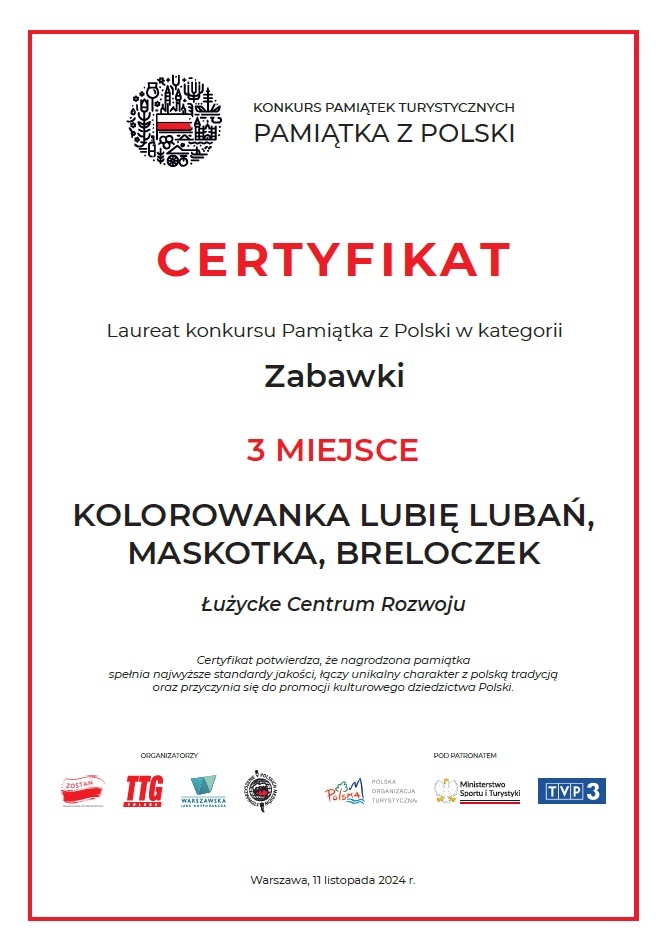 Kolorowanka Lubię Lubań oraz maskotka i breloczek w kształcie Wieży Brackiej zostały laureatami konkursu „Pamiątka z Polski – Polish Souvenirs”. Nasze pamiątki zajęły 3. miejsce w kategorii „Zabawki”