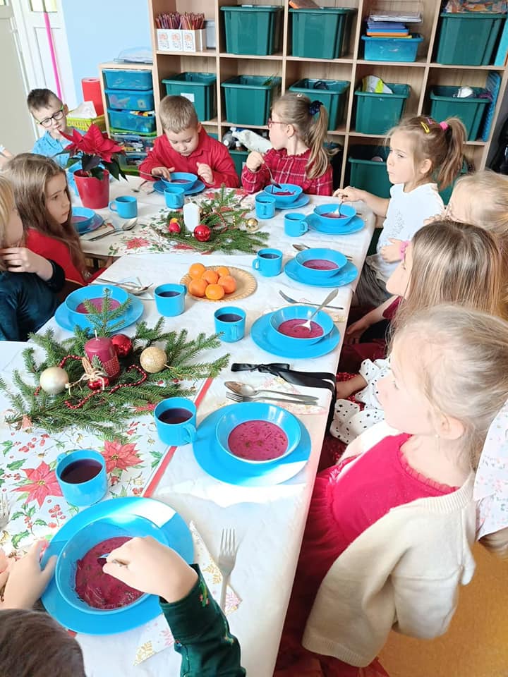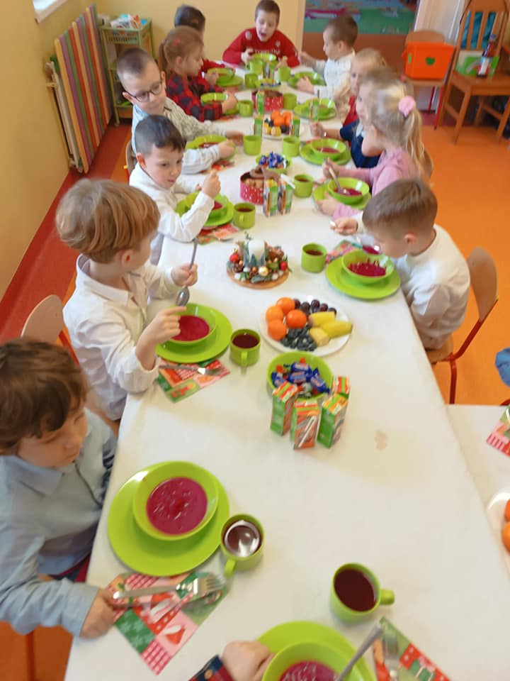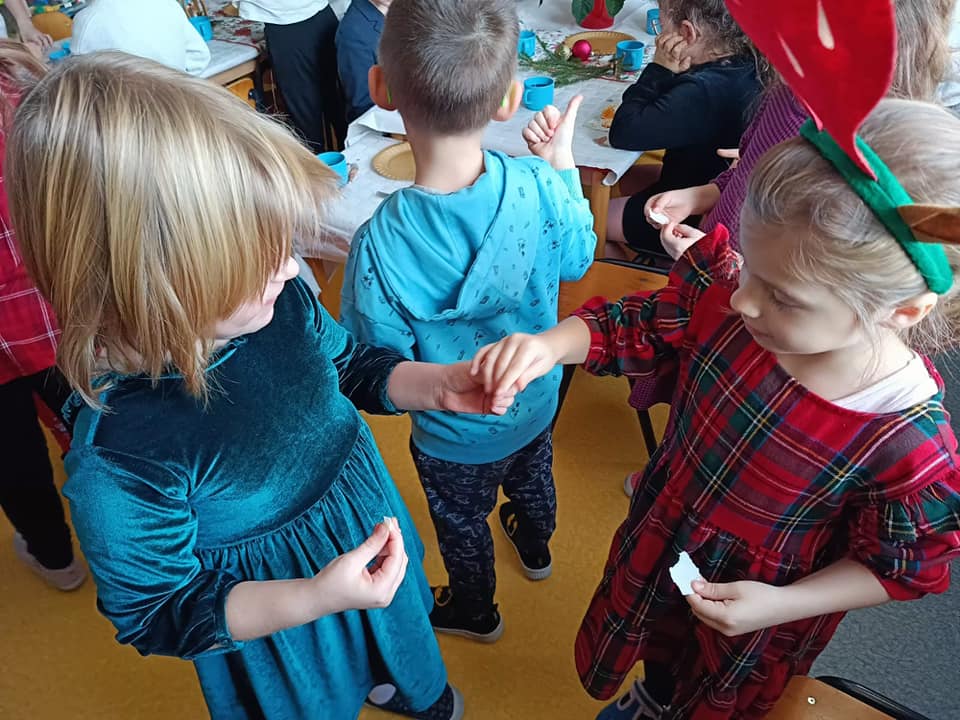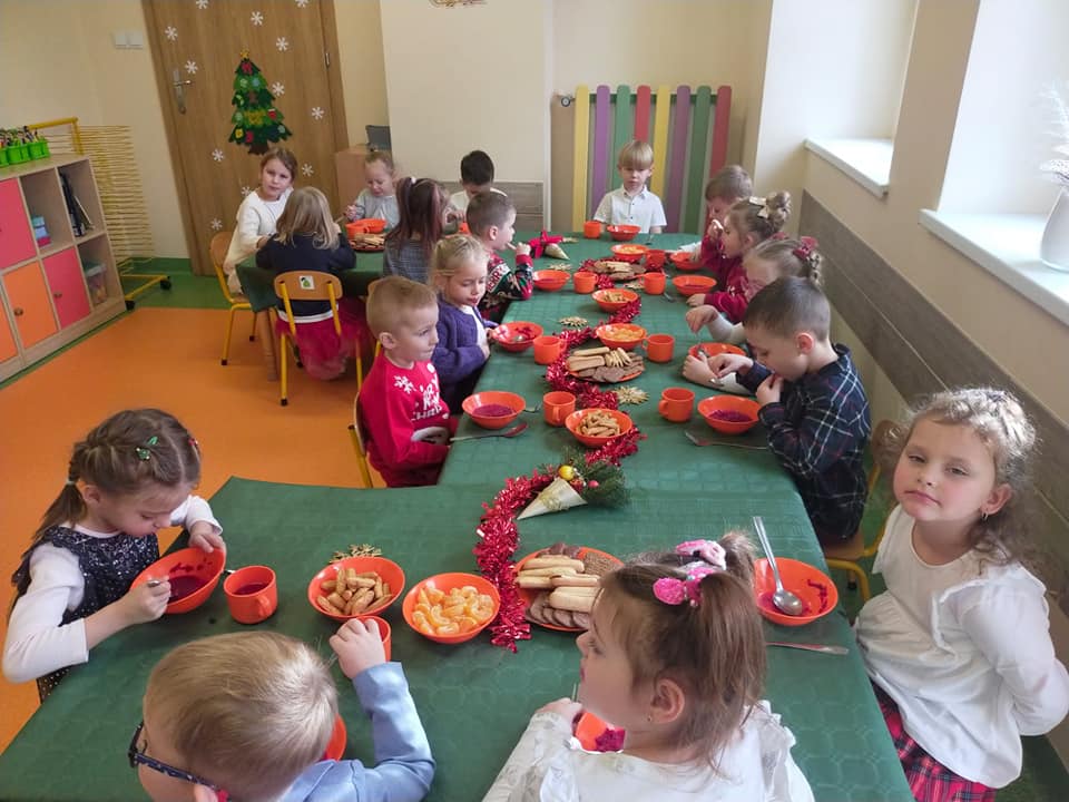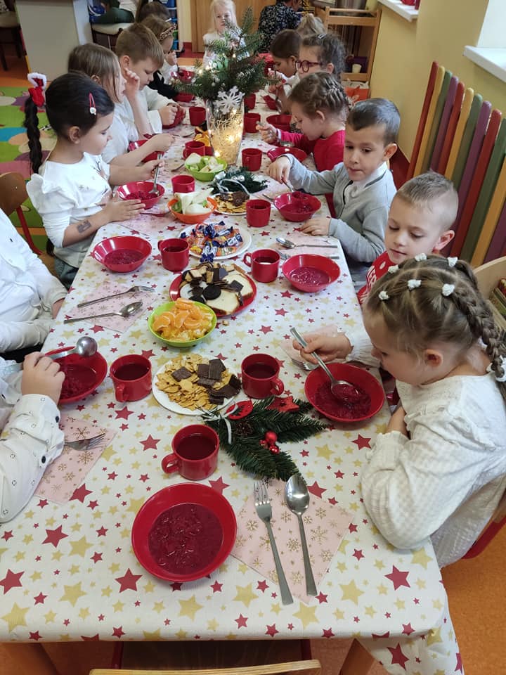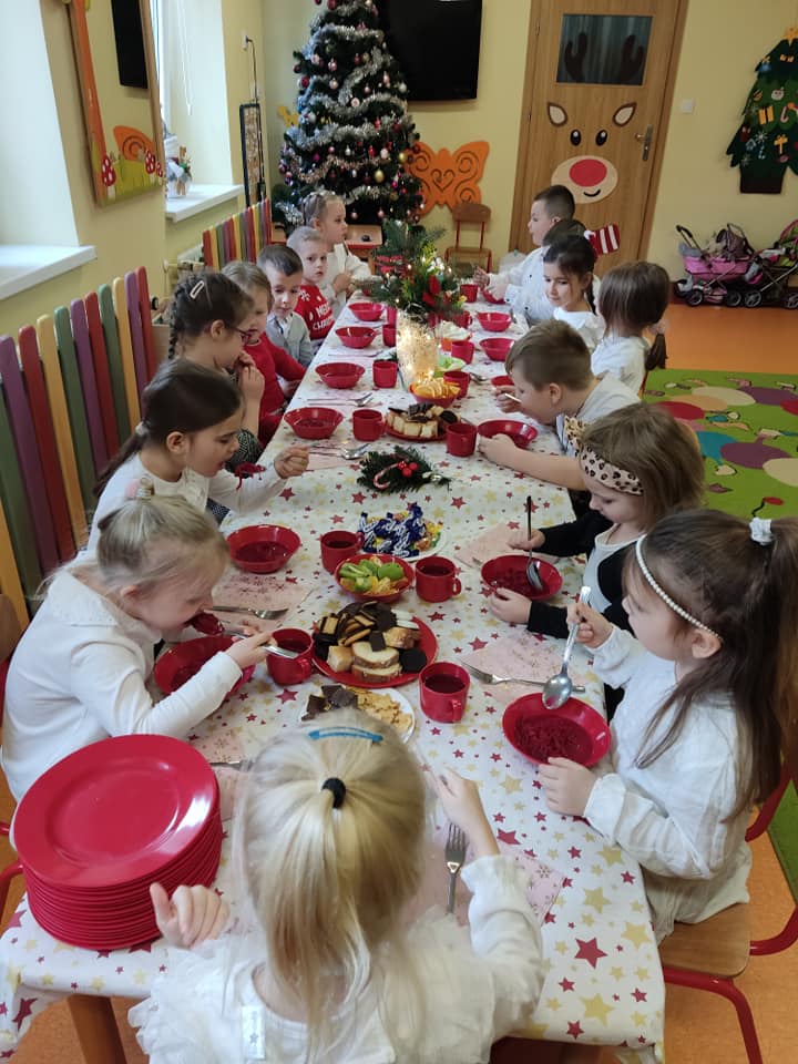 18 grudnia w naszym przedszkolu obchodziliśmy jeden z najpiękniejszych dni w roku – Wigilię Bożego Narodzenia. W salach przedszkolnych dzieci dzieliły się opłatkiem, składały sobie życzenia, a następnie zasiadły do pięknie przystrojonych stołów, na których czekał świąteczny obiad. Nie zabrakło również wspólnego kolędowania. Czas upłynął w bardzo miłej, serdecznej atmosferze. Wszystkie dzieci czuły zbliżające się wielkimi krokami Święta Bożego Narodzenia.