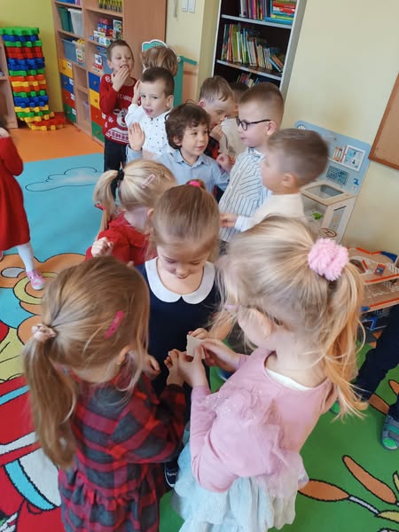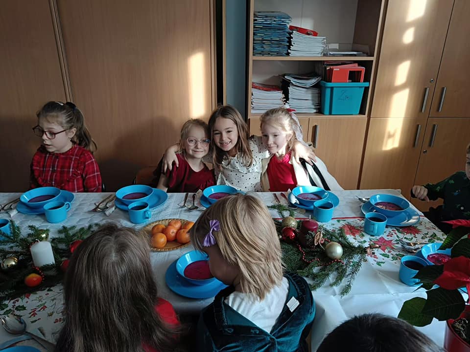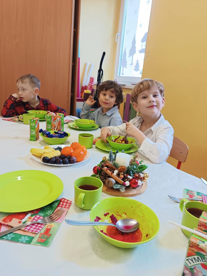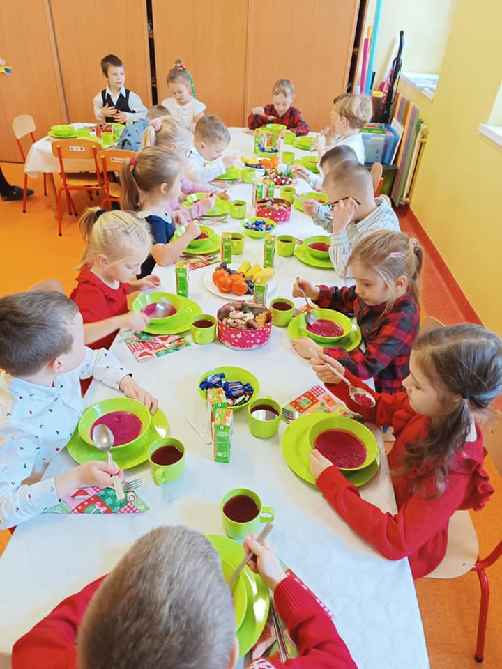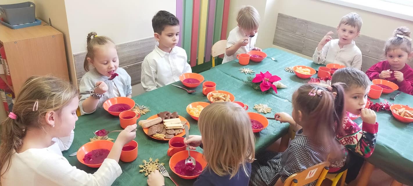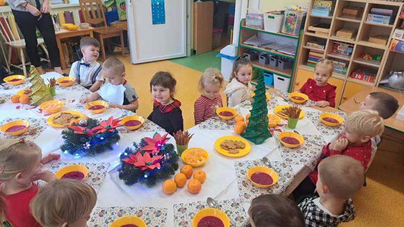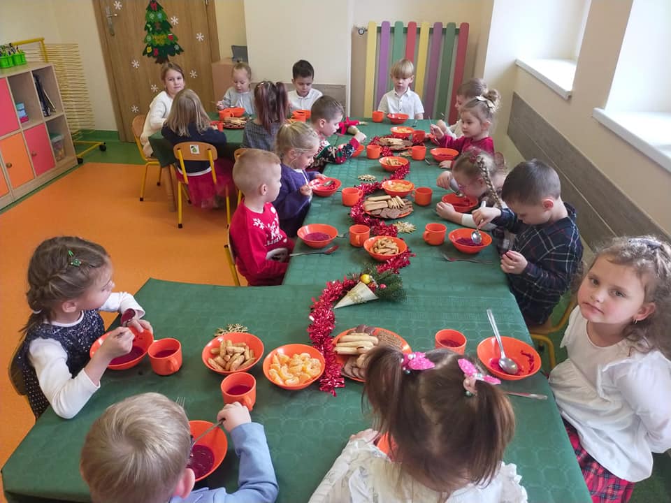 18 grudnia w naszym przedszkolu obchodziliśmy jeden z najpiękniejszych dni w roku – Wigilię Bożego Narodzenia. W salach przedszkolnych dzieci dzieliły się opłatkiem, składały sobie życzenia, a następnie zasiadły do pięknie przystrojonych stołów, na których czekał świąteczny obiad. Nie zabrakło również wspólnego kolędowania. Czas upłynął w bardzo miłej, serdecznej atmosferze. Wszystkie dzieci czuły zbliżające się wielkimi krokami Święta Bożego Narodzenia.