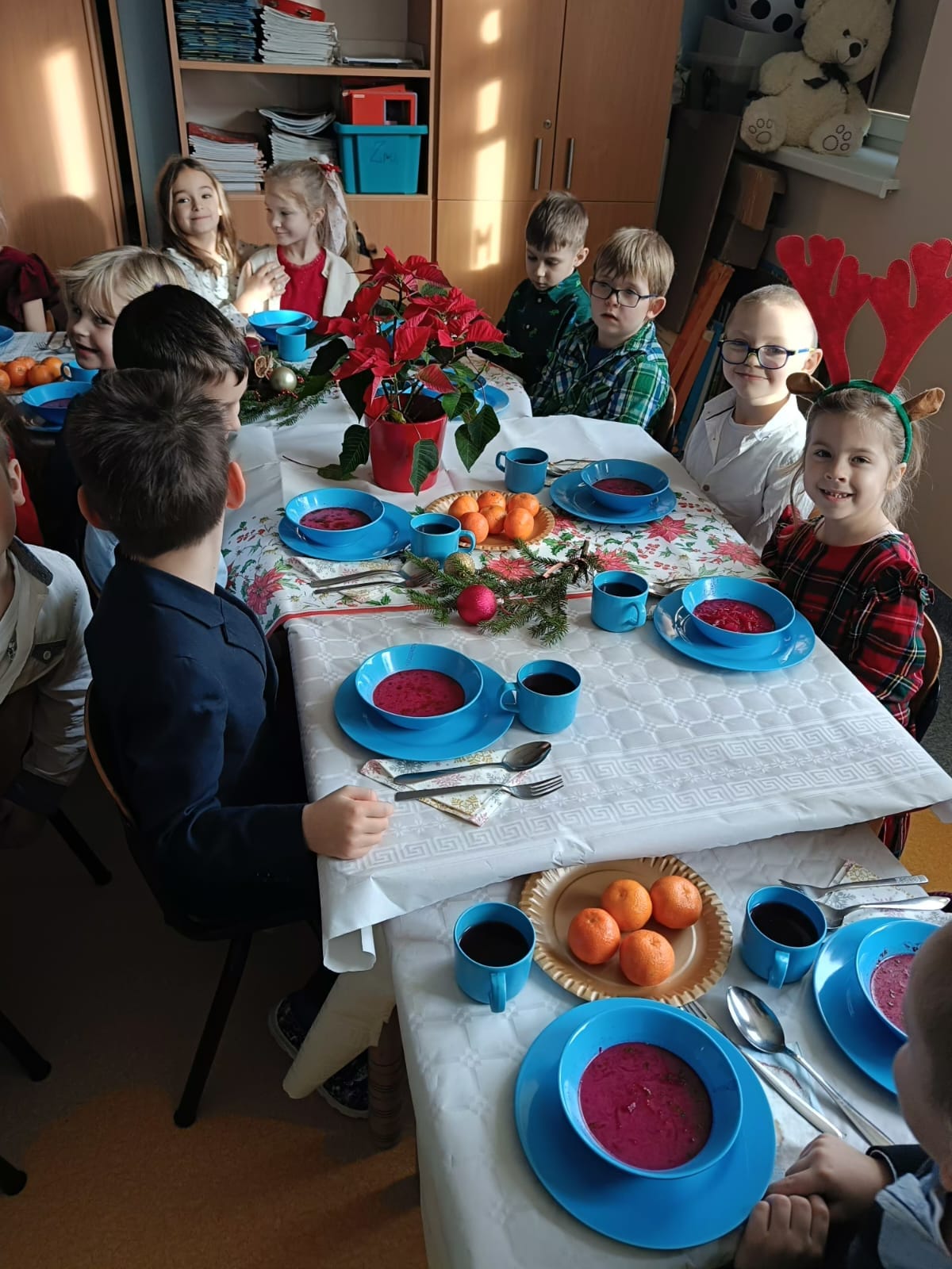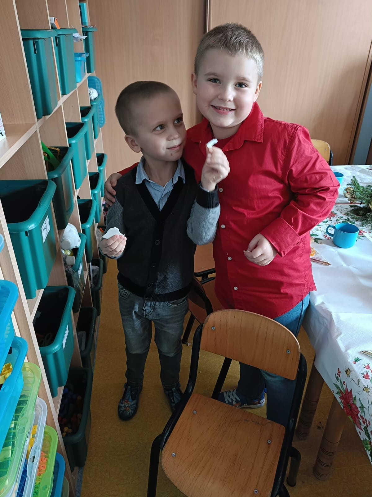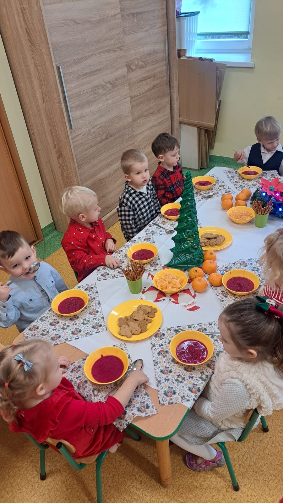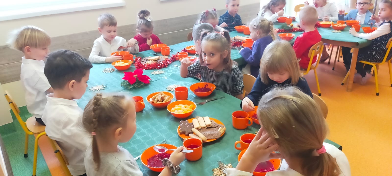 18 grudnia w naszym przedszkolu obchodziliśmy jeden z najpiękniejszych dni w roku – Wigilię Bożego Narodzenia. W salach przedszkolnych dzieci dzieliły się opłatkiem, składały sobie życzenia, a następnie zasiadły do pięknie przystrojonych stołów, na których czekał świąteczny obiad. Nie zabrakło również wspólnego kolędowania. Czas upłynął w bardzo miłej, serdecznej atmosferze. Wszystkie dzieci czuły zbliżające się wielkimi krokami Święta Bożego Narodzenia.