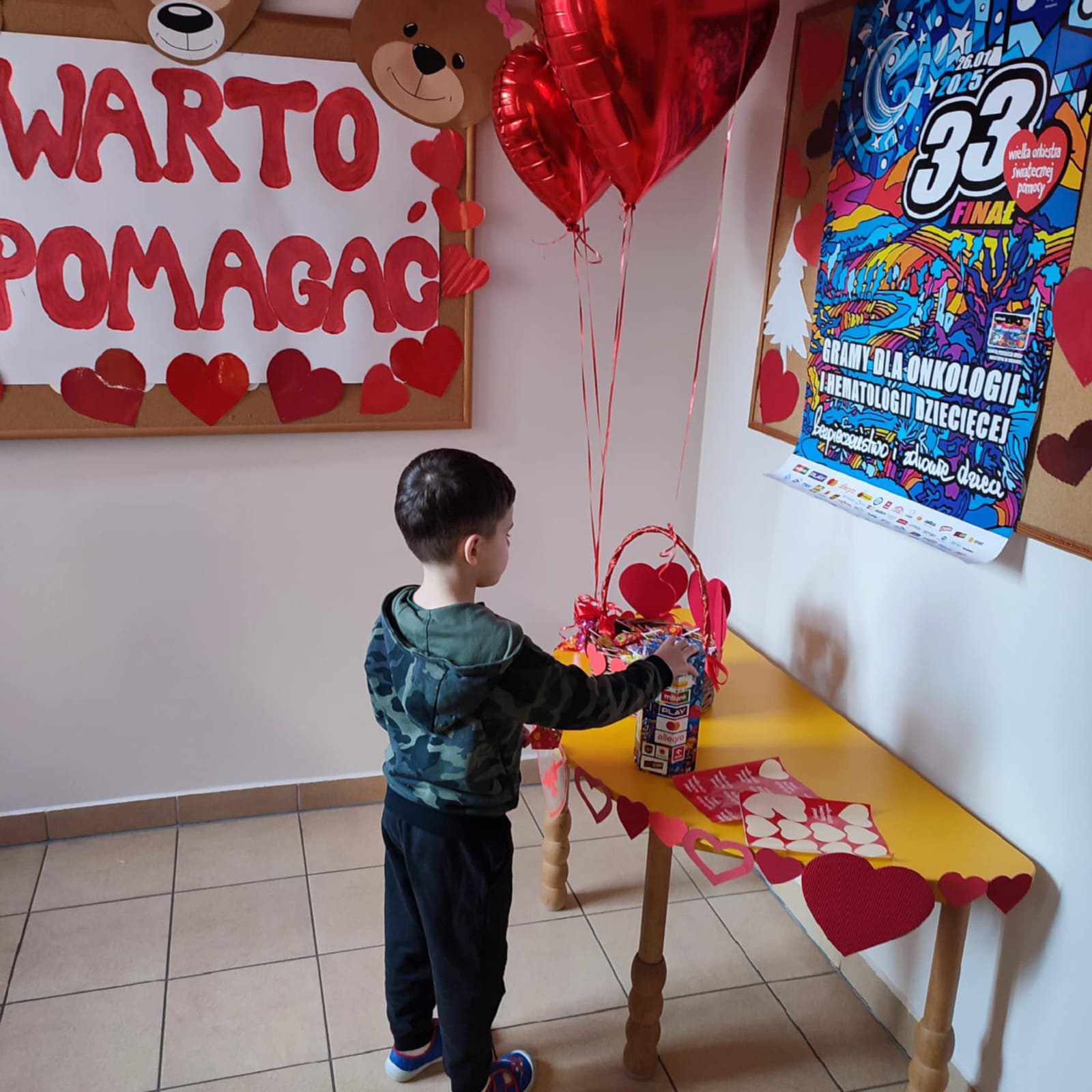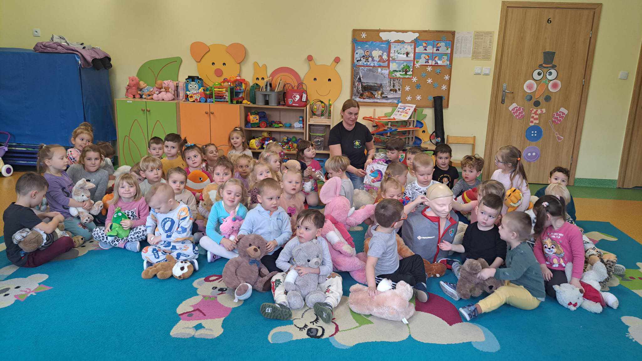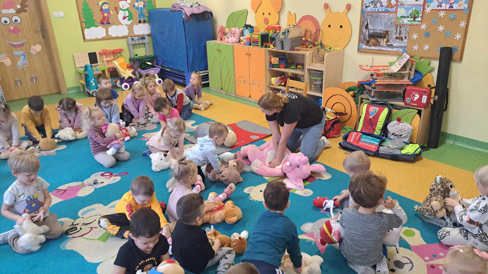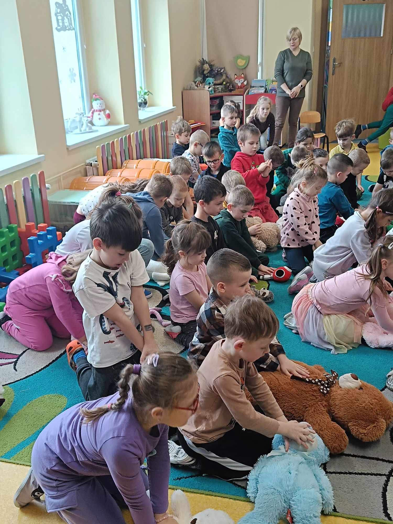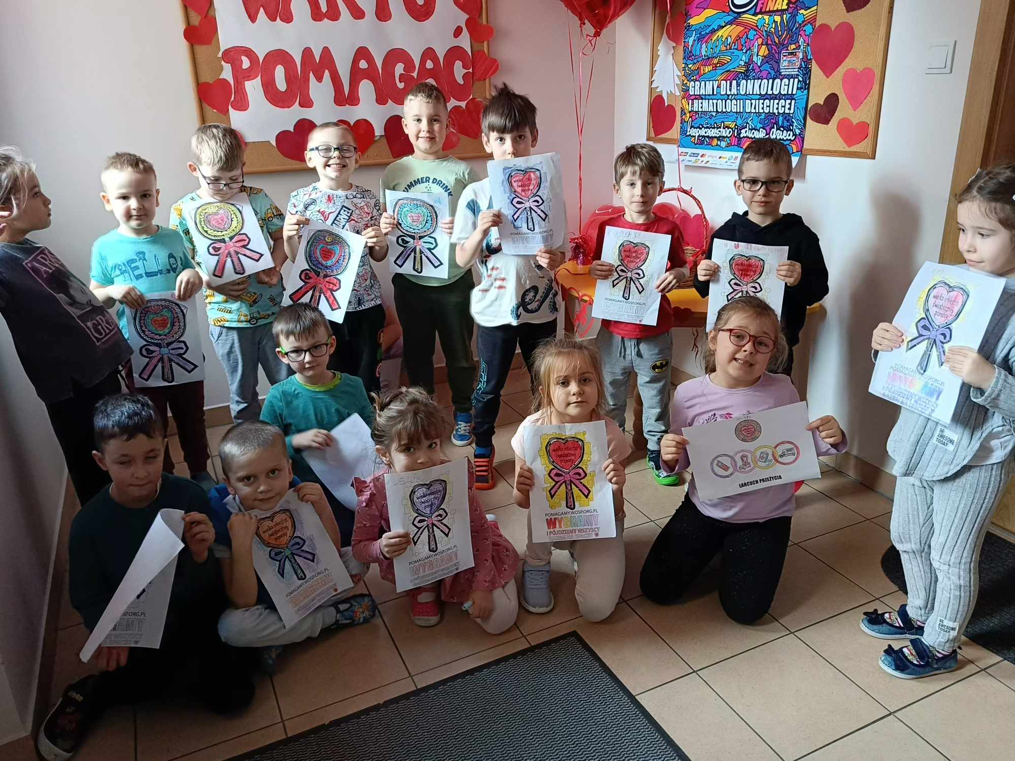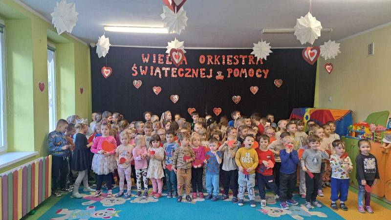 Nasze przedszkole, w tym roku, wzięło po raz pierwszy udział w spieraniu działań na rzecz akcji Wielka Orkiestra Świątecznej Pomocy. W ramach podjętych inicjatyw zorganizowano spotkanie z Ratownikiem Kwalifikowanej Pierwszej Pomocy. Podczas spotkania dzieci mogły zobaczyć jak zareagować w sytuacjach nagłego zagrożenia życia. Pierwsza pomoc wiąże się również z koniecznością znajomości numeru alarmowego i sposobem wykorzystania go do zawiadomienia odpowiednich służb celem ratowania życia. Ta lekcja była dla dzieci już dobrze znana i opanowana. Praktycznie działania skupione zostały na akcji masażu serca i pomocy związanej z opatrunkiem. Kolejnym podjętym działaniem była oczywiście zbiórka pieniędzy na rzecz WOŚP pod hasłem „WARTO POMAGAĆ”. Nasza puszka wypełniła się po brzegi. Pełne zaangażowanie rodziców, dziadków i opiekunów pokazało solidarność ludzkich postaw w tak szczytnym celu dla ratowania życia ludzkiego. Nie zabrakło również takich działań jak festiwal piosenki z okazji Dnia Babci i Dziadka oraz wspólne zaśpiewanie przez społeczność całego przedszkola utworu : „Piosenka o pomaganiu ludziom”, którego wykonawcą jest Mała Orkiestra Dni Naszych. Zakończeniem działań było spotkanie podczas finału WOŚP w MDK, na którym zostały komisyjnie przeliczone datki zebrane w trakcie całego tygodnia w naszym przedszkolu.