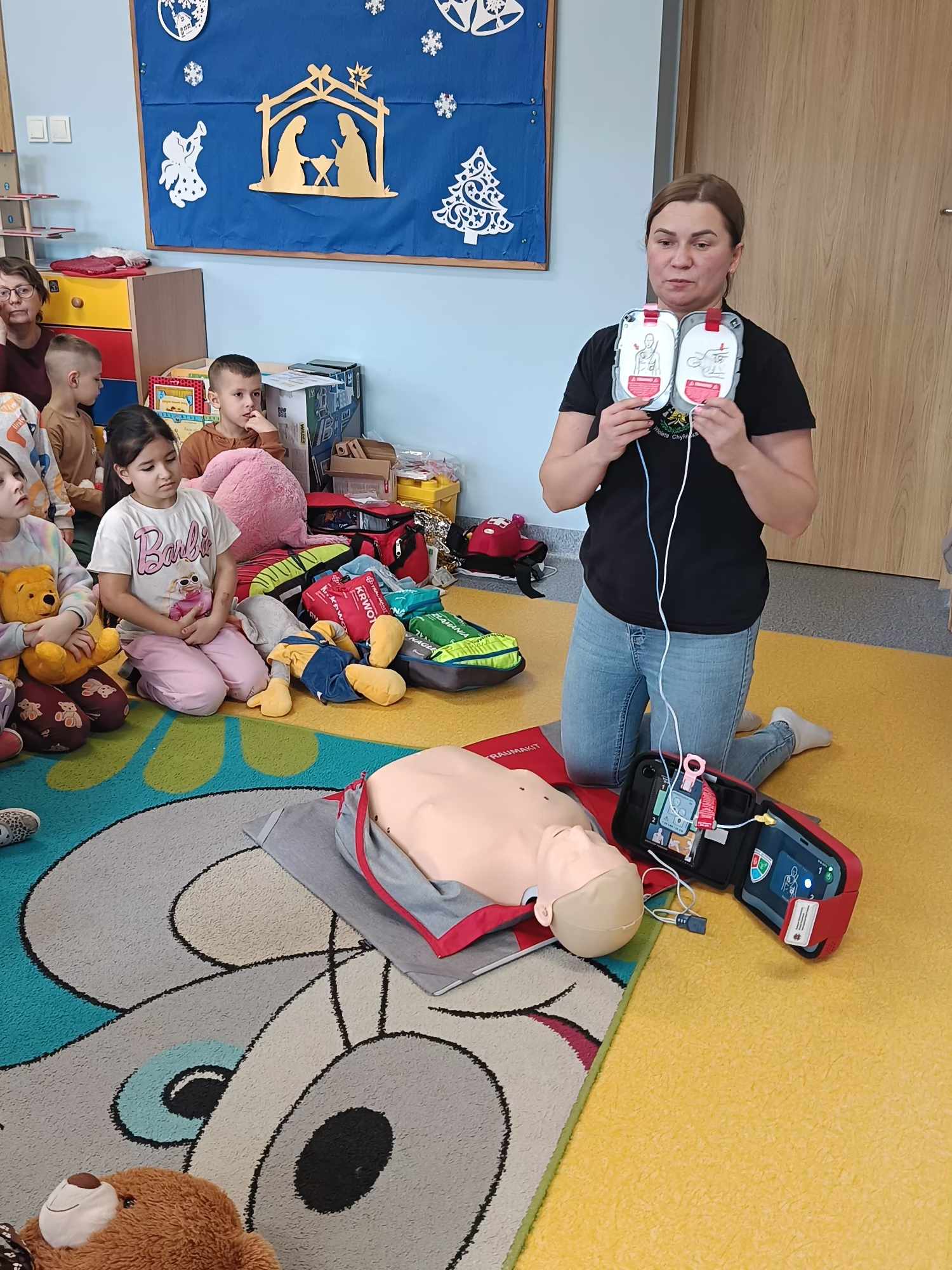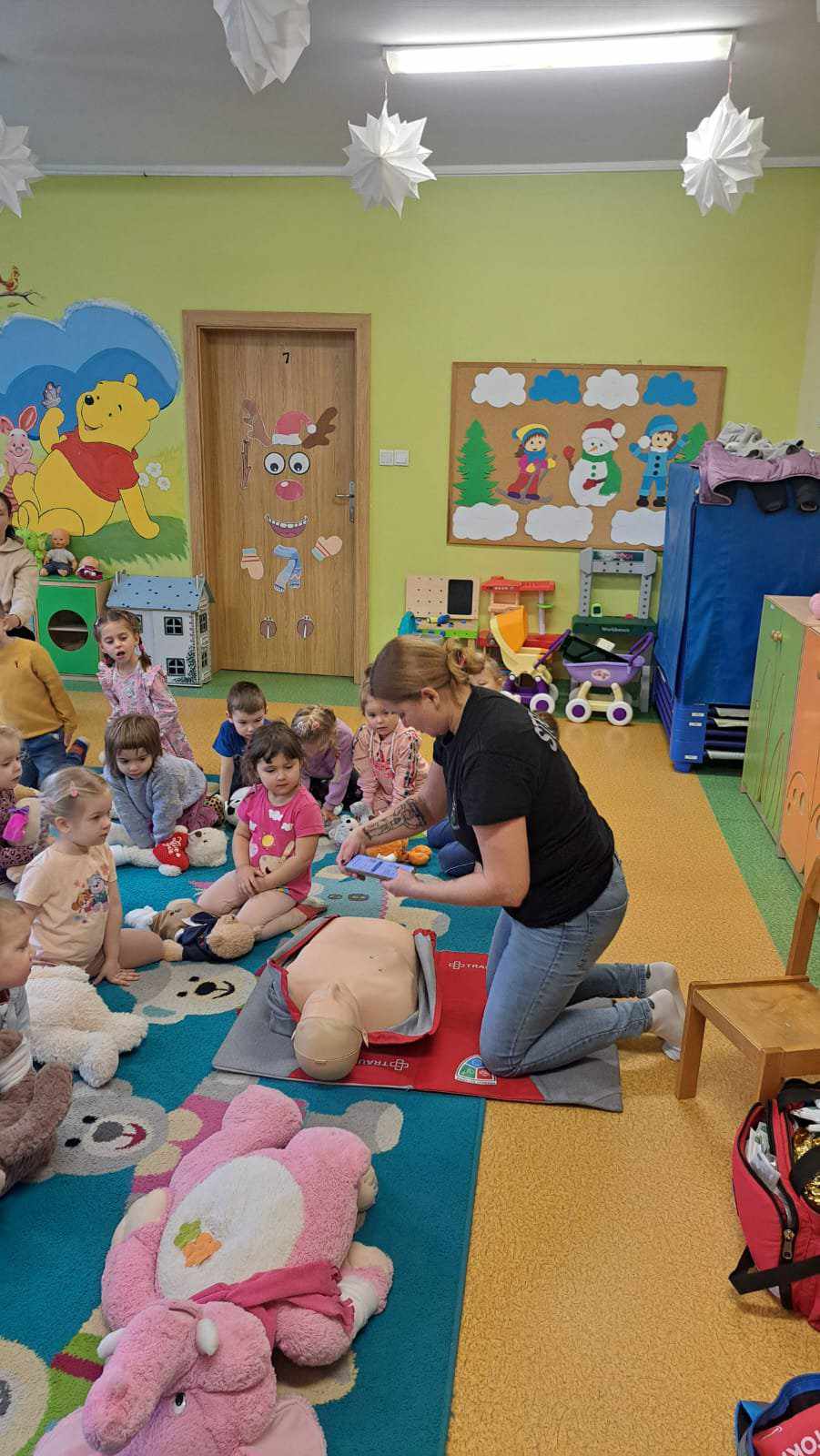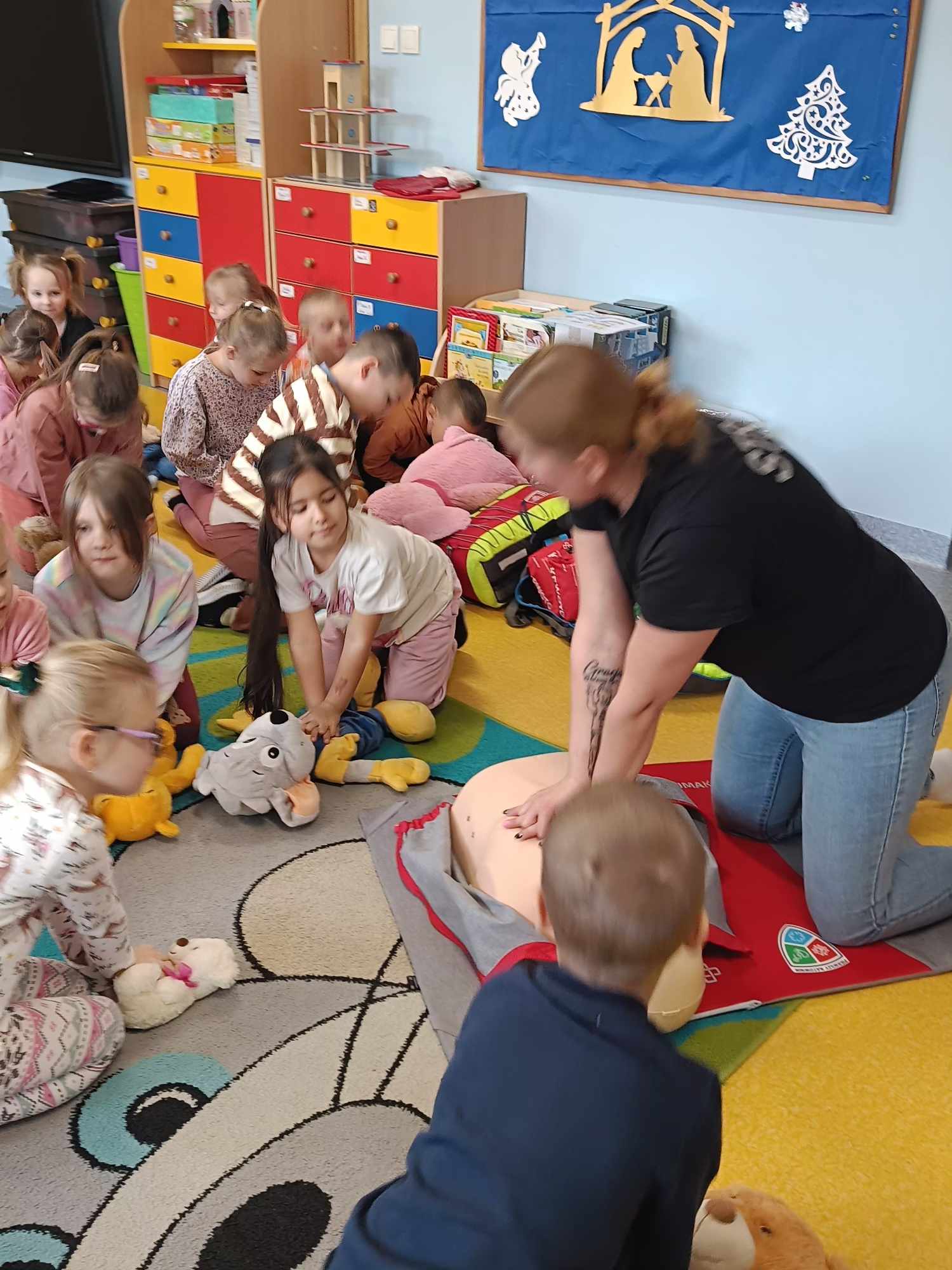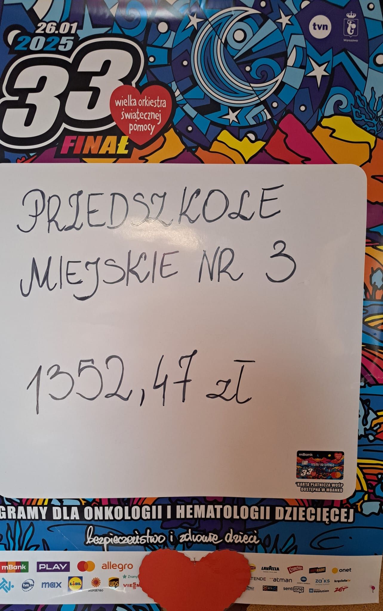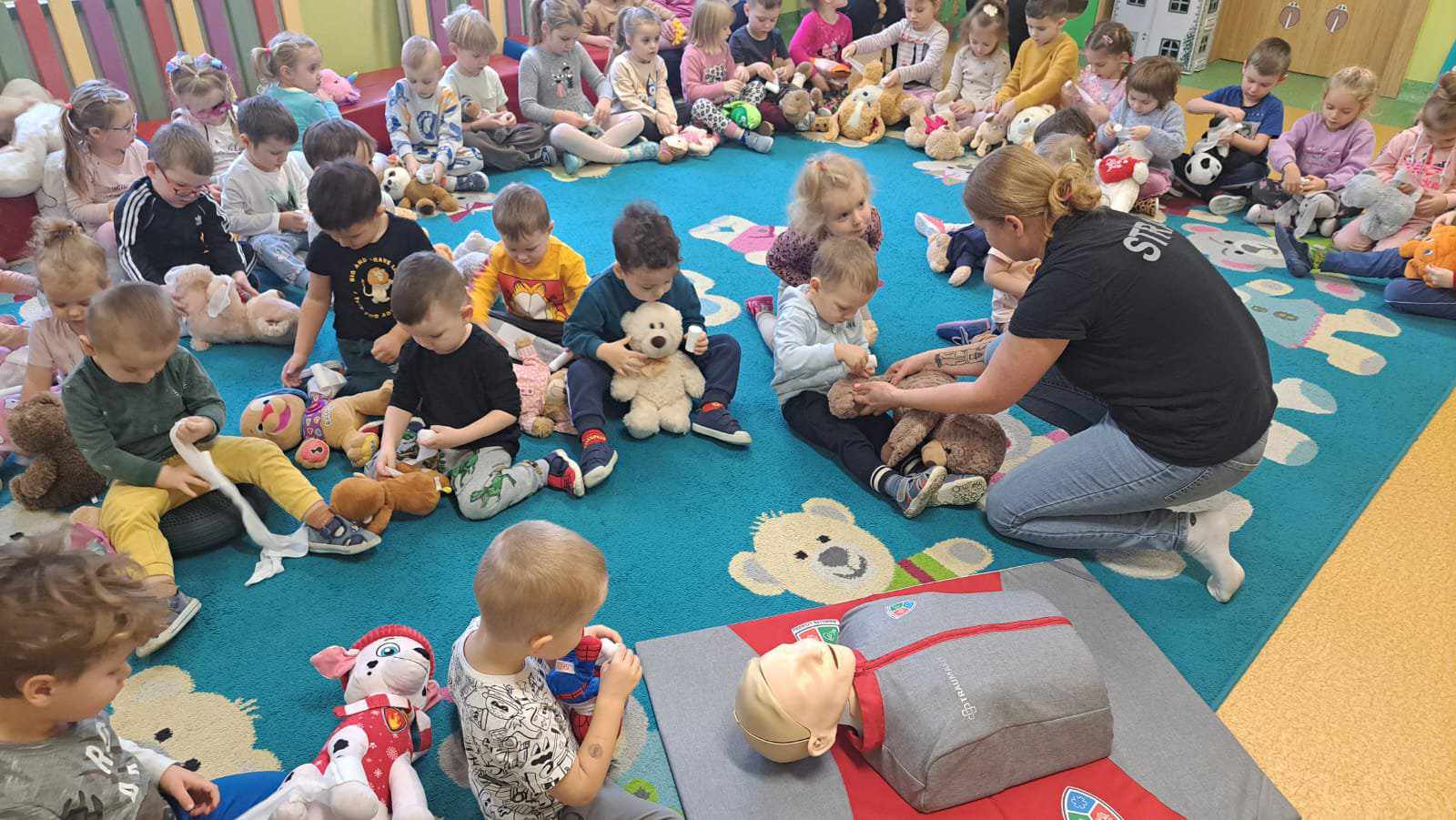 Nasze przedszkole, w tym roku, wzięło po raz pierwszy udział w spieraniu działań na rzecz akcji Wielka Orkiestra Świątecznej Pomocy. W ramach podjętych inicjatyw zorganizowano spotkanie z Ratownikiem Kwalifikowanej Pierwszej Pomocy. Podczas spotkania dzieci mogły zobaczyć jak zareagować w sytuacjach nagłego zagrożenia życia. Pierwsza pomoc wiąże się również z koniecznością znajomości numeru alarmowego i sposobem wykorzystania go do zawiadomienia odpowiednich służb celem ratowania życia. Ta lekcja była dla dzieci już dobrze znana i opanowana. Praktycznie działania skupione zostały na akcji masażu serca i pomocy związanej z opatrunkiem. Kolejnym podjętym działaniem była oczywiście zbiórka pieniędzy na rzecz WOŚP pod hasłem „WARTO POMAGAĆ”. Nasza puszka wypełniła się po brzegi. Pełne zaangażowanie rodziców, dziadków i opiekunów pokazało solidarność ludzkich postaw w tak szczytnym celu dla ratowania życia ludzkiego. Nie zabrakło również takich działań jak festiwal piosenki z okazji Dnia Babci i Dziadka oraz wspólne zaśpiewanie przez społeczność całego przedszkola utworu : „Piosenka o pomaganiu ludziom”, którego wykonawcą jest Mała Orkiestra Dni Naszych. Zakończeniem działań było spotkanie podczas finału WOŚP w MDK, na którym zostały komisyjnie przeliczone datki zebrane w trakcie całego tygodnia w naszym przedszkolu.