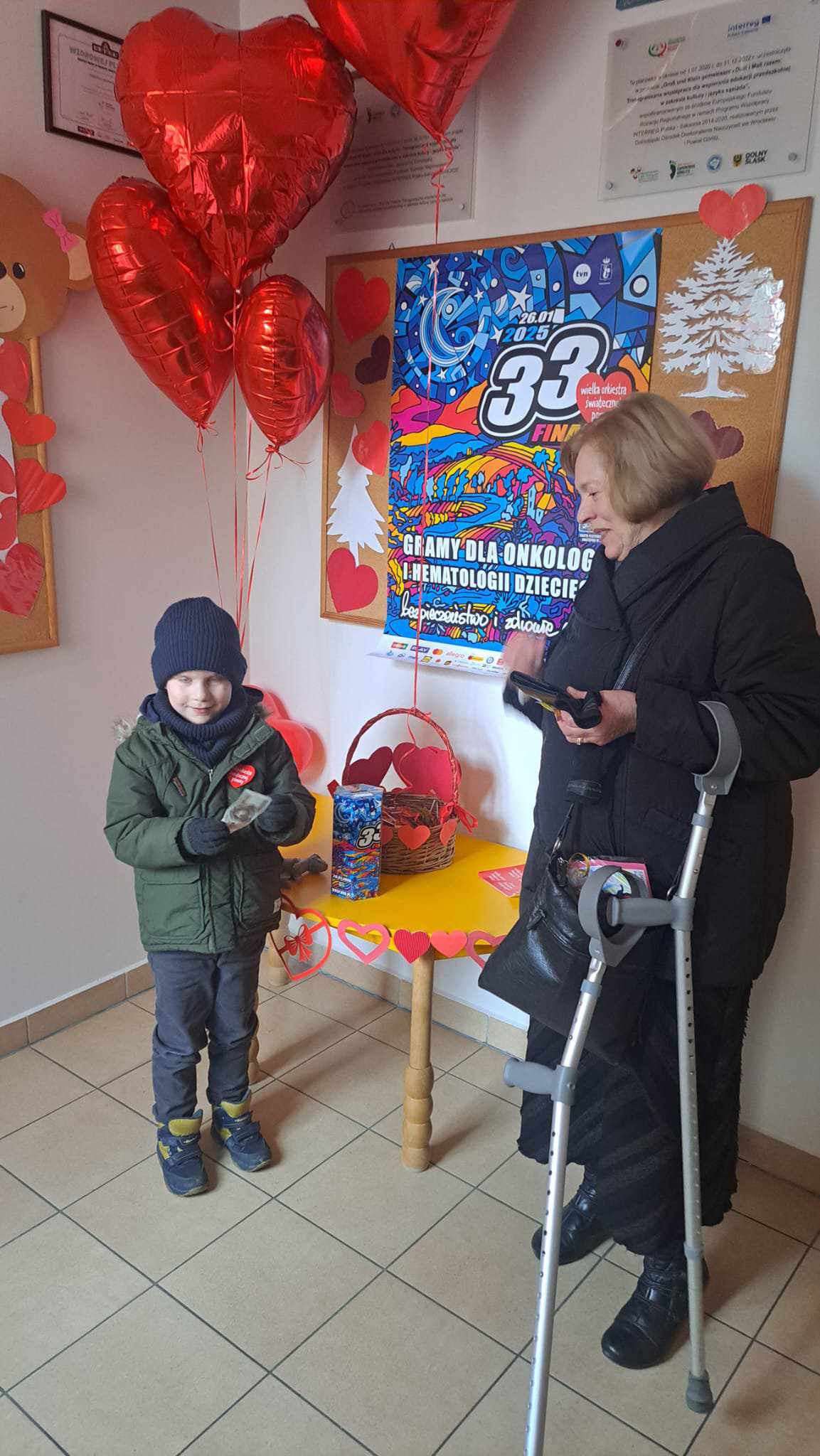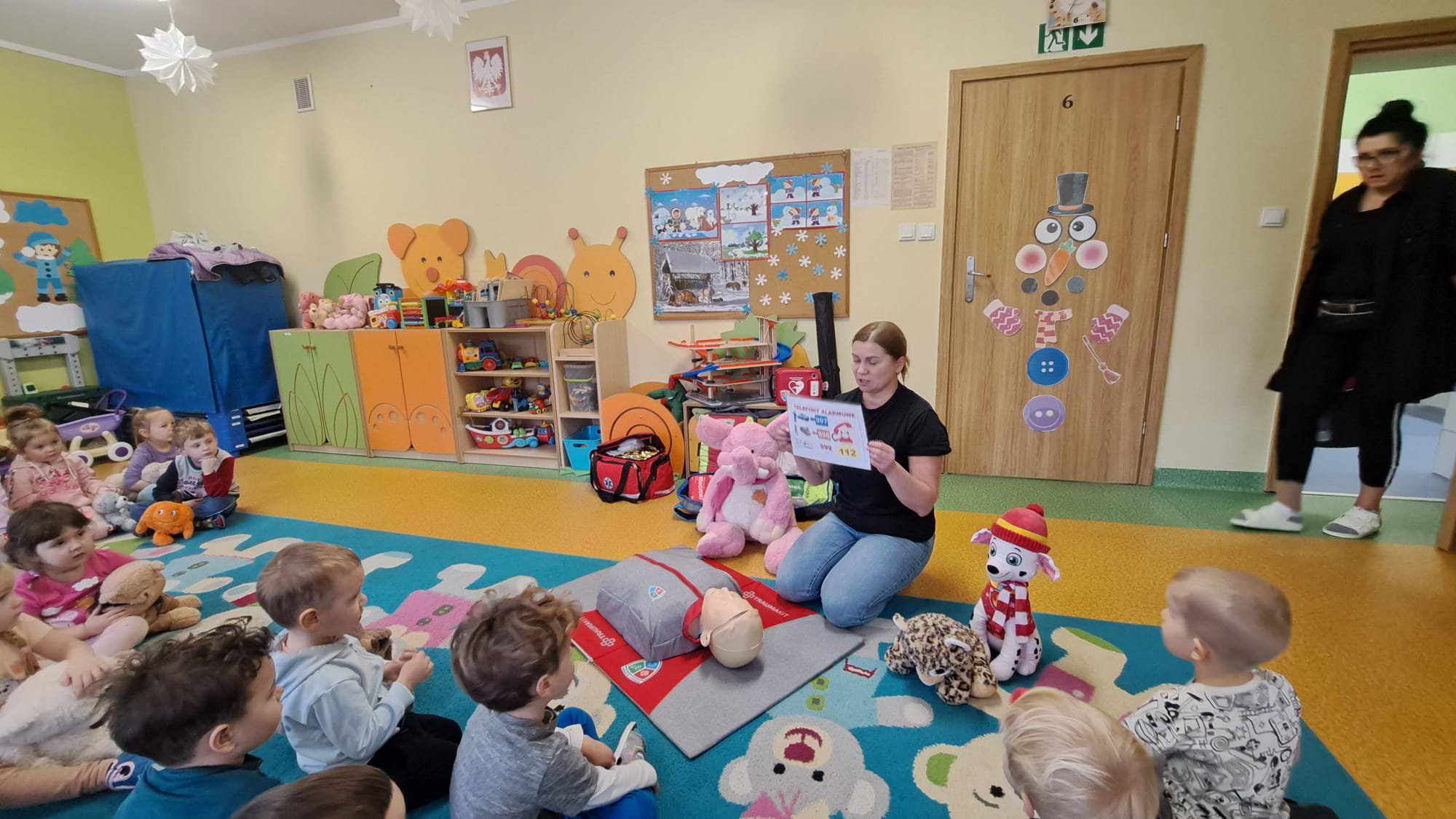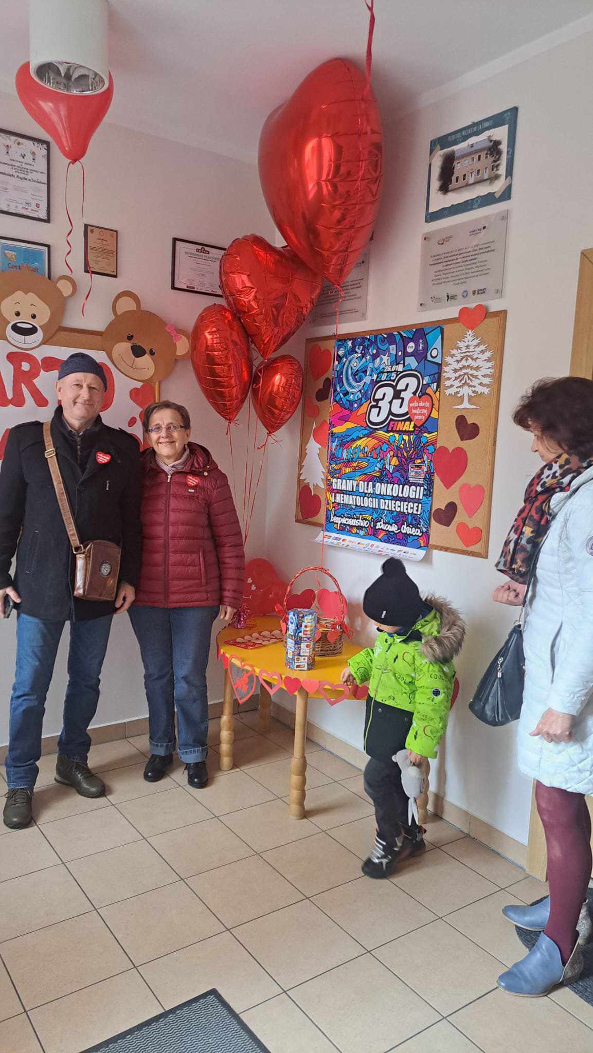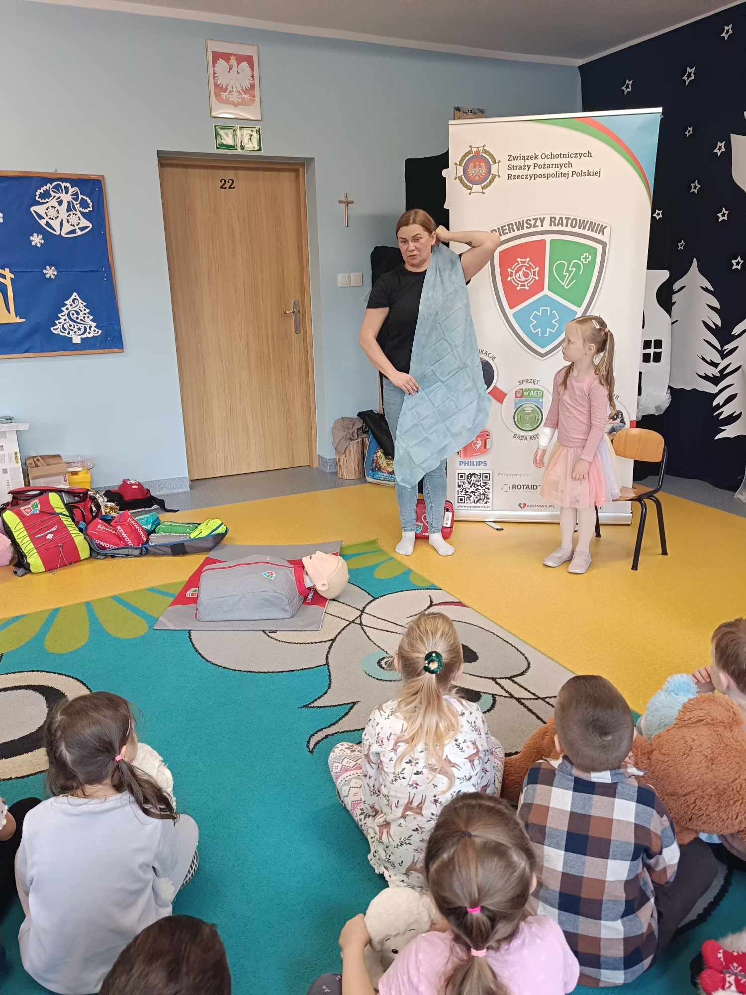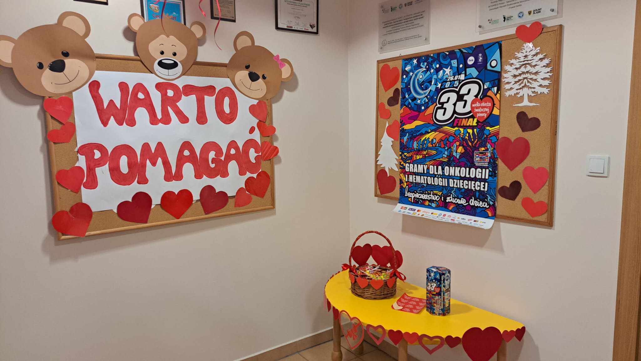 Nasze przedszkole, w tym roku, wzięło po raz pierwszy udział w spieraniu działań na rzecz akcji Wielka Orkiestra Świątecznej Pomocy. W ramach podjętych inicjatyw zorganizowano spotkanie z Ratownikiem Kwalifikowanej Pierwszej Pomocy. Podczas spotkania dzieci mogły zobaczyć jak zareagować w sytuacjach nagłego zagrożenia życia. Pierwsza pomoc wiąże się również z koniecznością znajomości numeru alarmowego i sposobem wykorzystania go do zawiadomienia odpowiednich służb celem ratowania życia. Ta lekcja była dla dzieci już dobrze znana i opanowana. Praktycznie działania skupione zostały na akcji masażu serca i pomocy związanej z opatrunkiem. Kolejnym podjętym działaniem była oczywiście zbiórka pieniędzy na rzecz WOŚP pod hasłem „WARTO POMAGAĆ”. Nasza puszka wypełniła się po brzegi. Pełne zaangażowanie rodziców, dziadków i opiekunów pokazało solidarność ludzkich postaw w tak szczytnym celu dla ratowania życia ludzkiego. Nie zabrakło również takich działań jak festiwal piosenki z okazji Dnia Babci i Dziadka oraz wspólne zaśpiewanie przez społeczność całego przedszkola utworu : „Piosenka o pomaganiu ludziom”, którego wykonawcą jest Mała Orkiestra Dni Naszych. Zakończeniem działań było spotkanie podczas finału WOŚP w MDK, na którym zostały komisyjnie przeliczone datki zebrane w trakcie całego tygodnia w naszym przedszkolu.