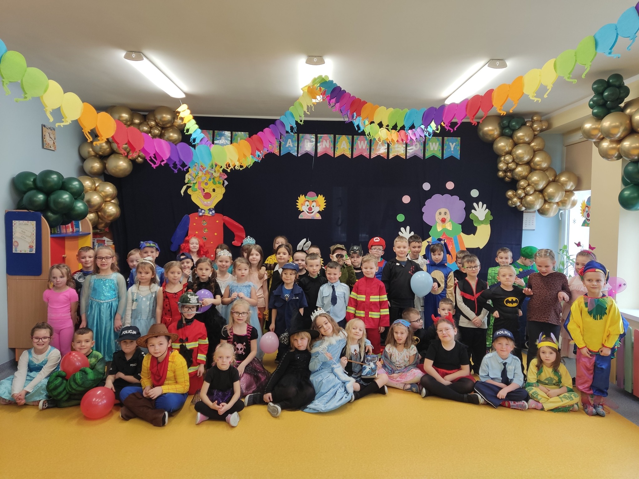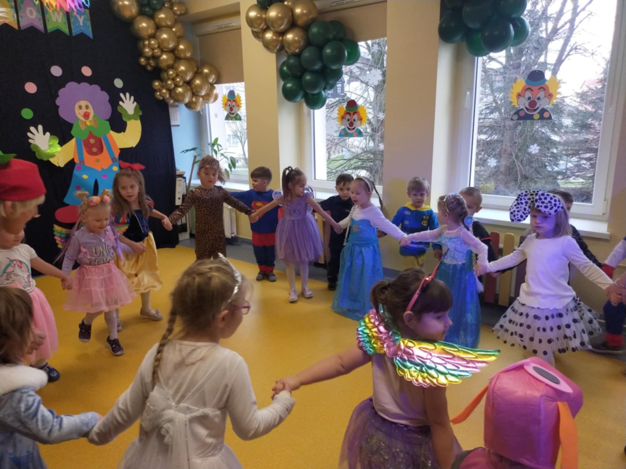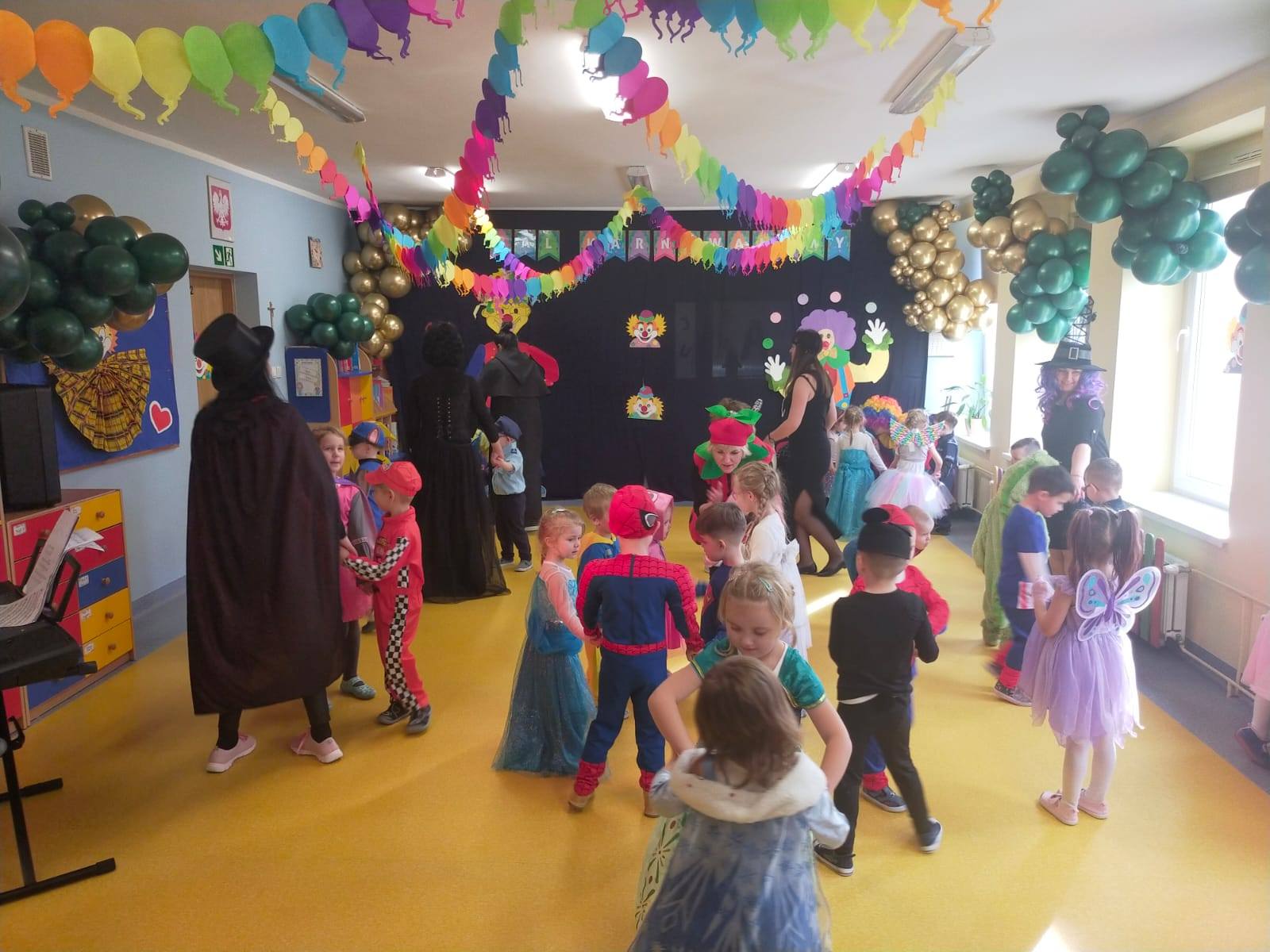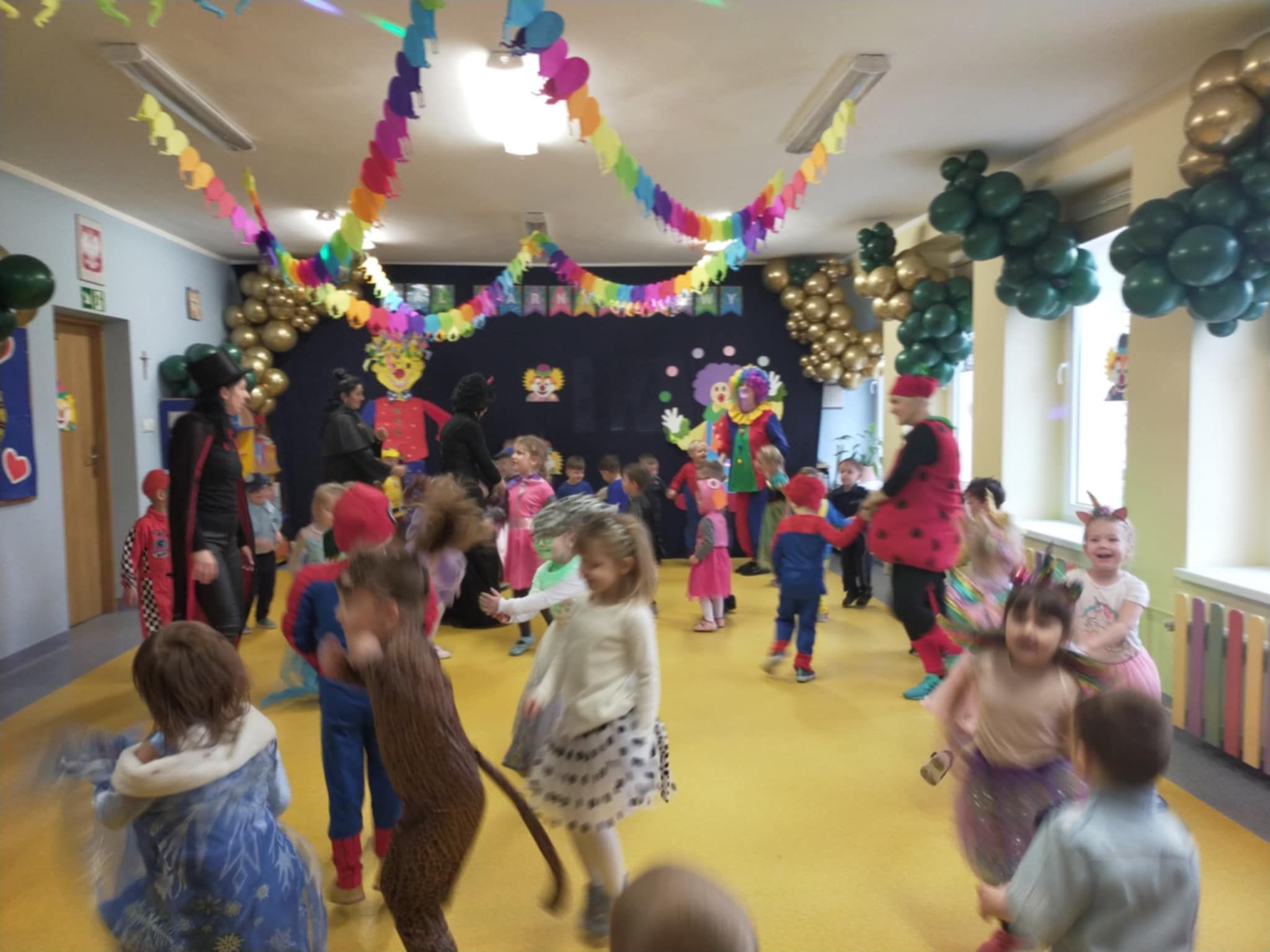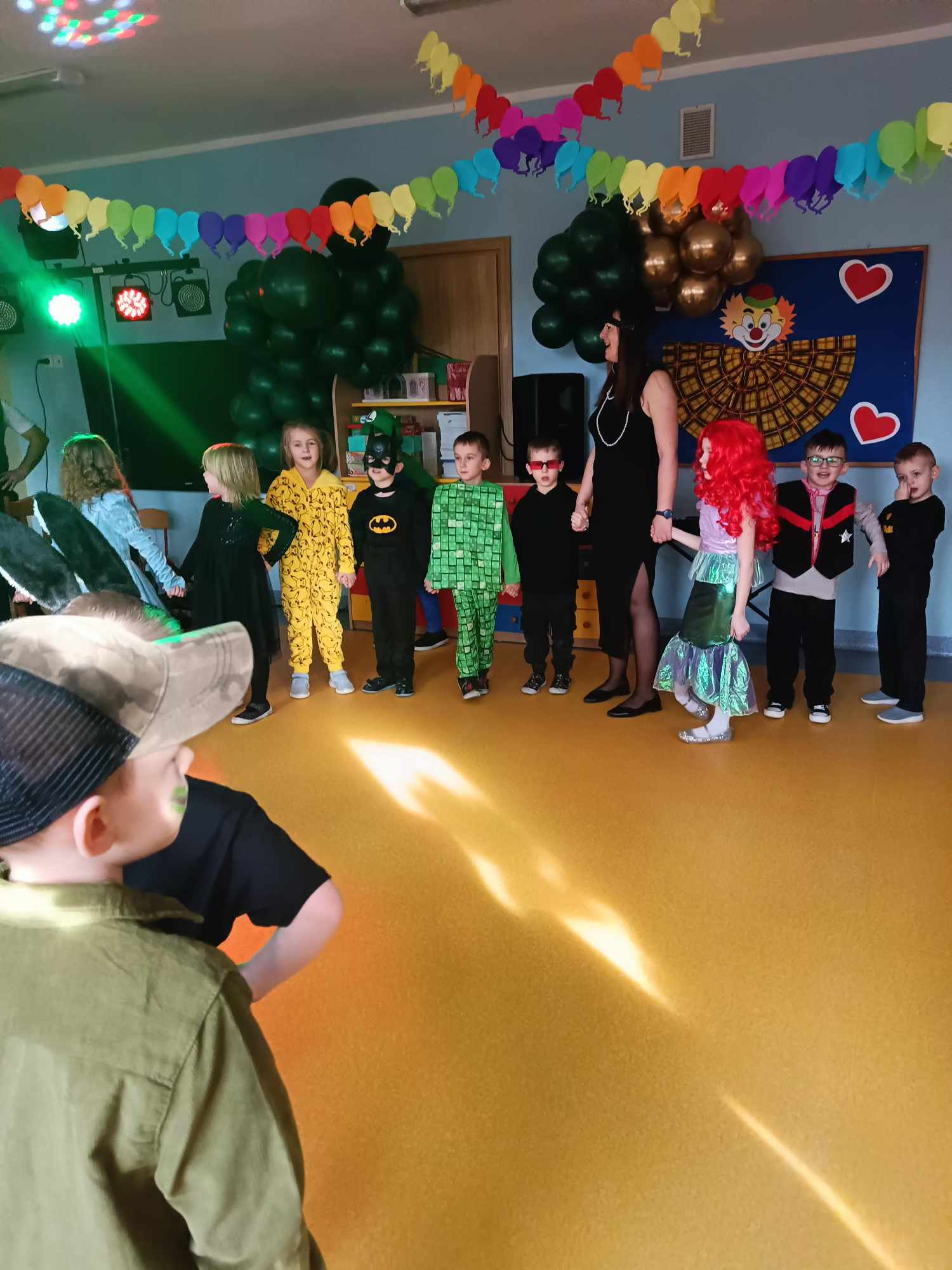 Całe wydarzenie odbyło się w radosnej atmosferze, wypełnionej tańcami, zabawami i konkursami prowadzonymi przez p. Marcina. Sala przedszkolna została pięknie udekorowana balonami, serpentynami i migoczącymi ozdobami, które wprowadzały prawdziwie karnawałowy nastrój. Wydarzenie dostarczyło dzieciom wiele uśmiechu i niezapomnianych wrażeń, a także było okazją do integracji i wspólnej zabawy.