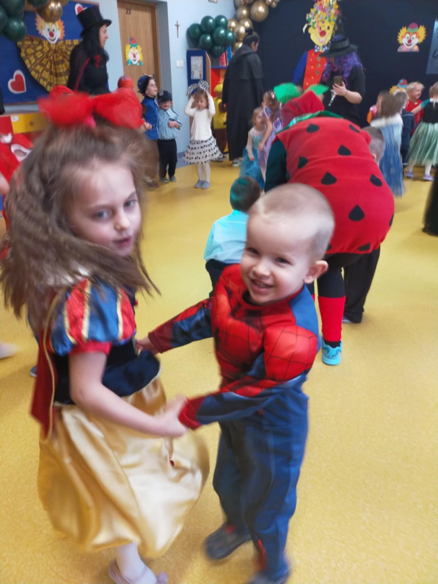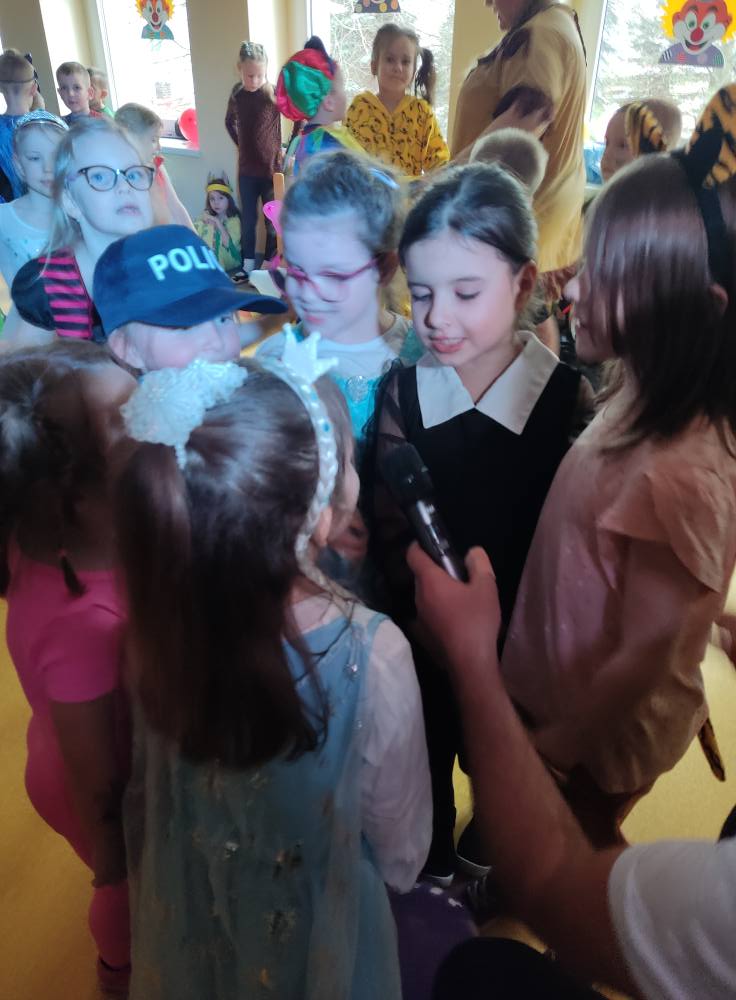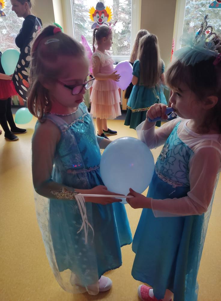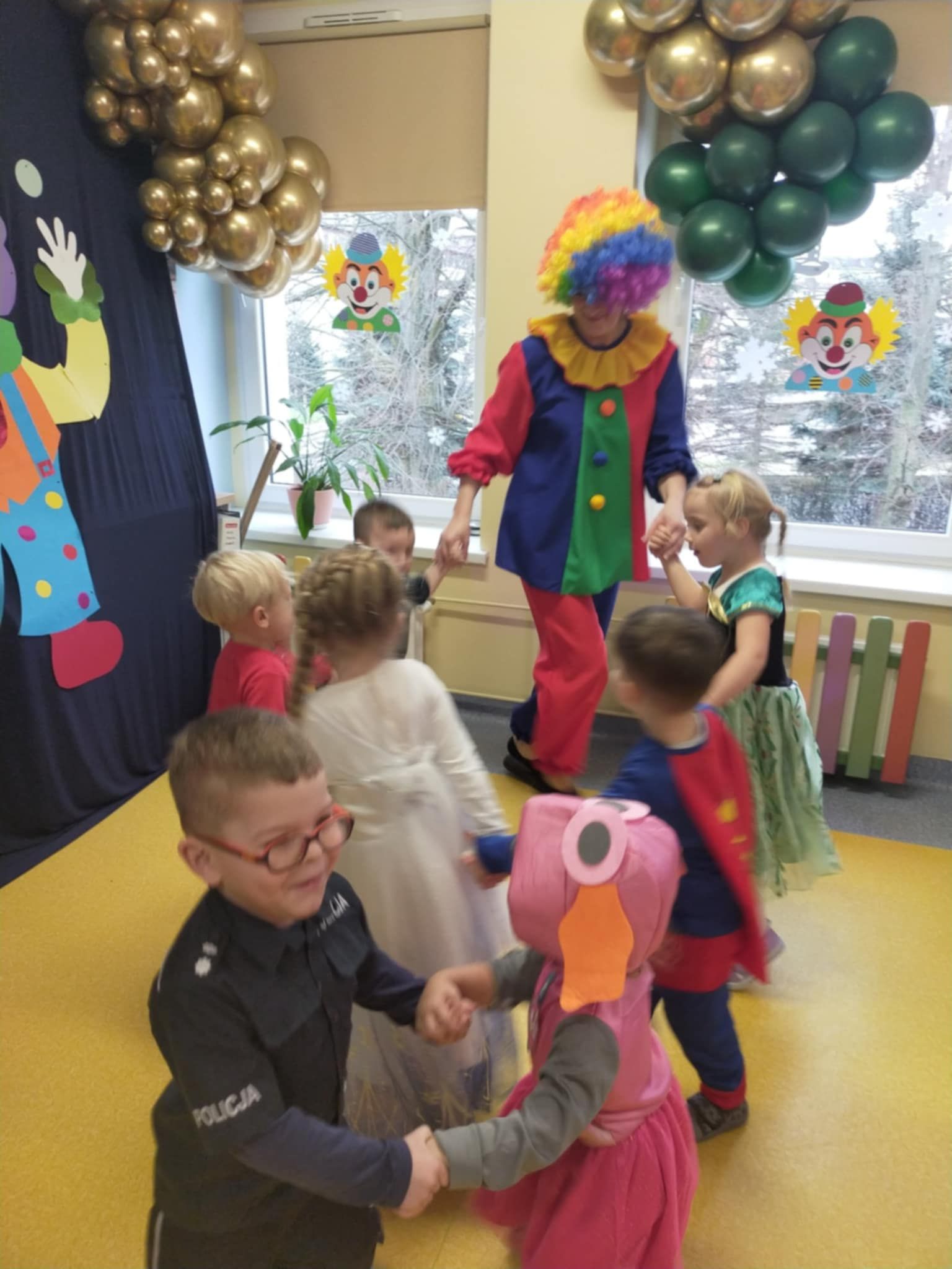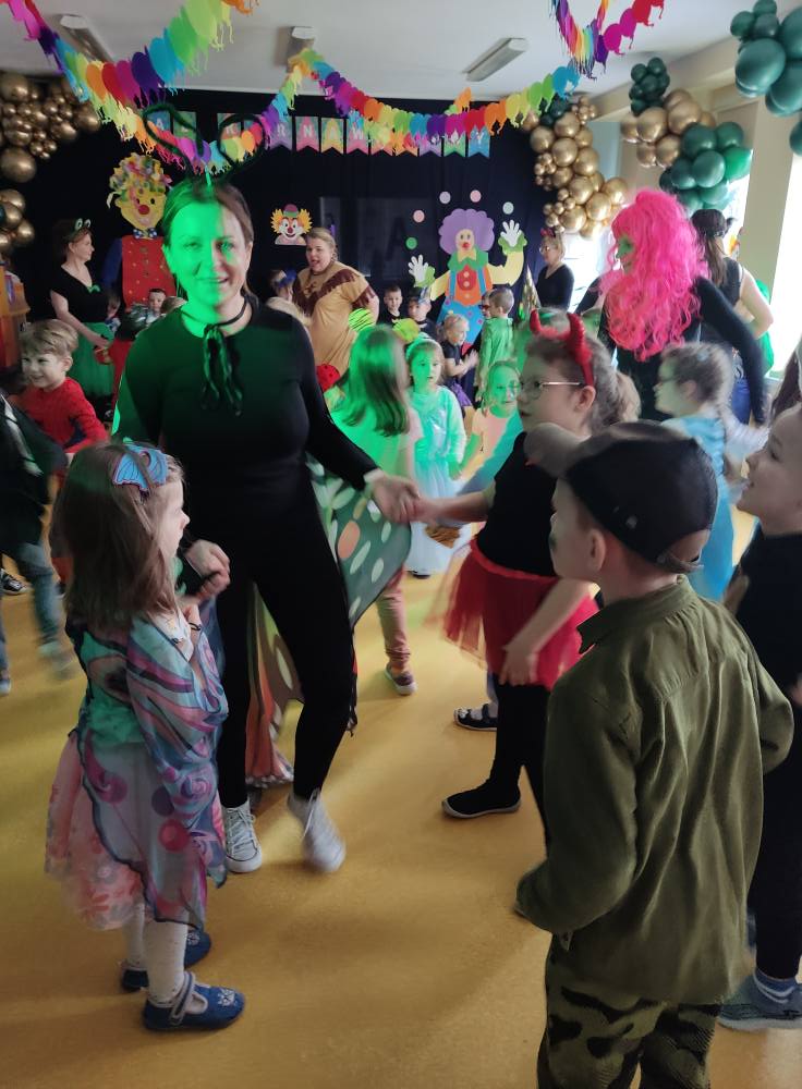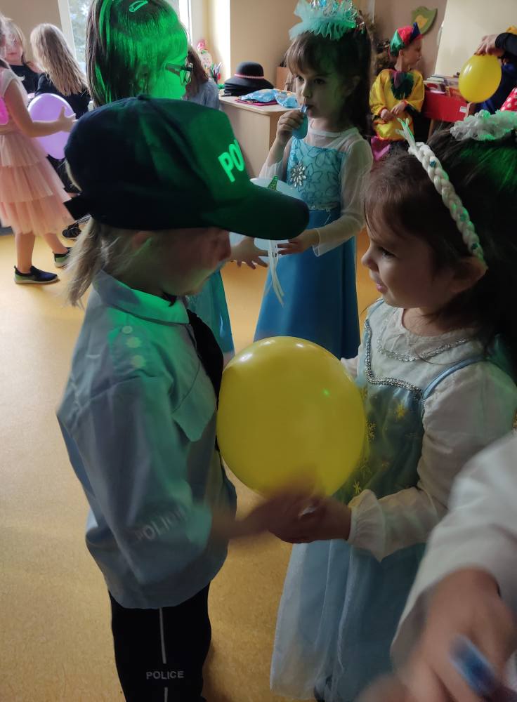 Całe wydarzenie odbyło się w radosnej atmosferze, wypełnionej tańcami, zabawami i konkursami prowadzonymi przez p. Marcina. Sala przedszkolna została pięknie udekorowana balonami, serpentynami i migoczącymi ozdobami, które wprowadzały prawdziwie karnawałowy nastrój. Wydarzenie dostarczyło dzieciom wiele uśmiechu i niezapomnianych wrażeń, a także było okazją do integracji i wspólnej zabawy.