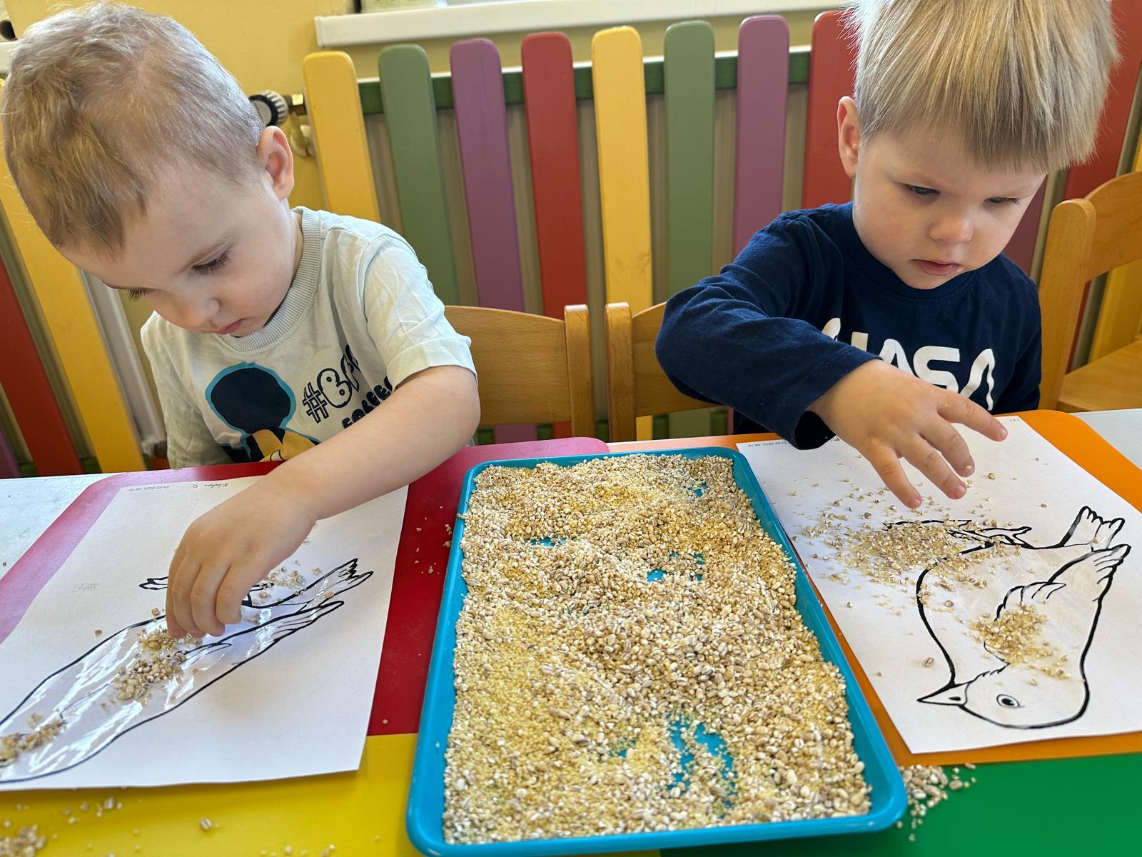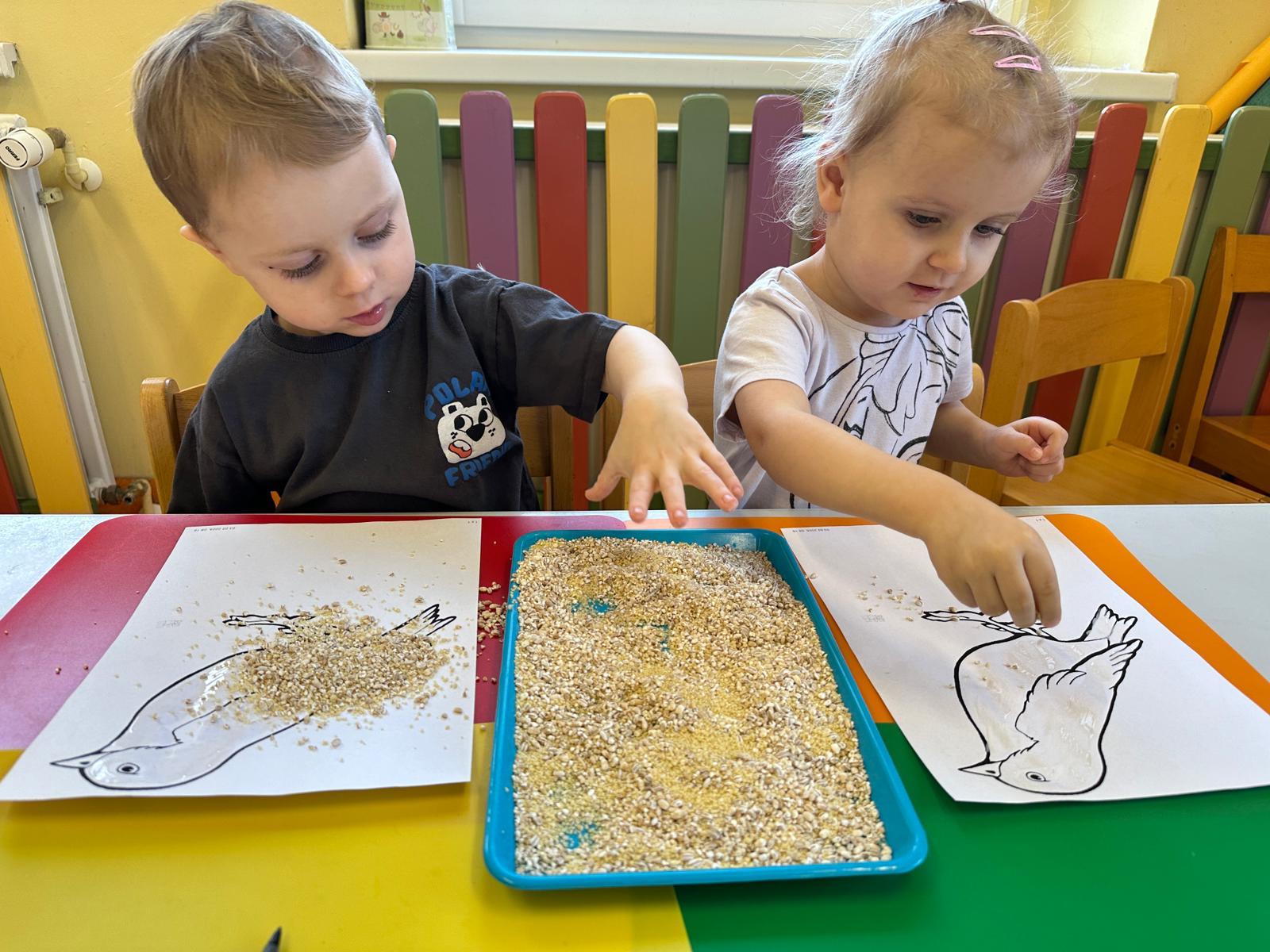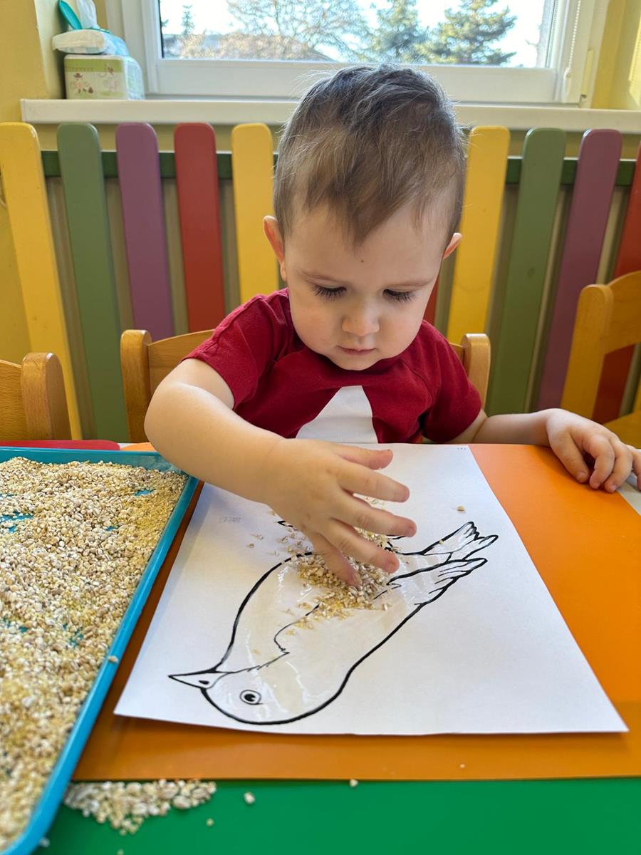 Zajęcia plastyczne to najchętniej wykonywane zajęcia przez dzieci. Tym razem nawiązując do wcześniejszym tematów o ptakach, dzieci tworzyły wróbelka za pomocą kleju i ziaren kasz.