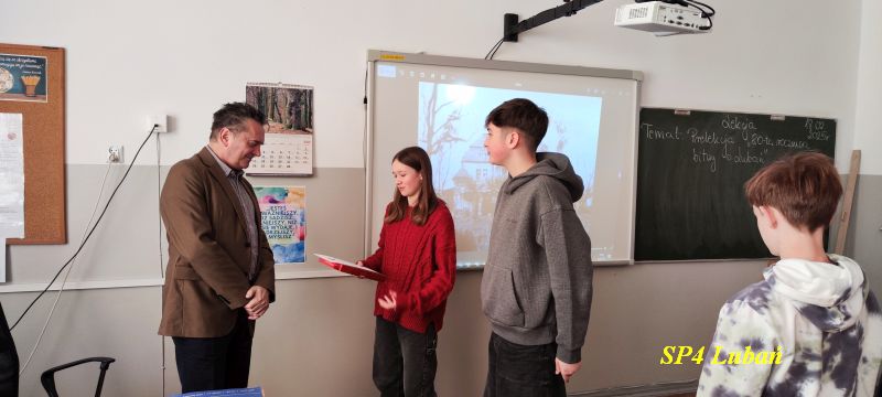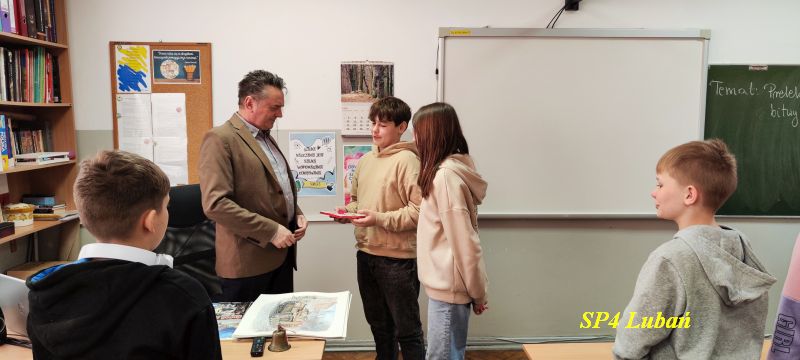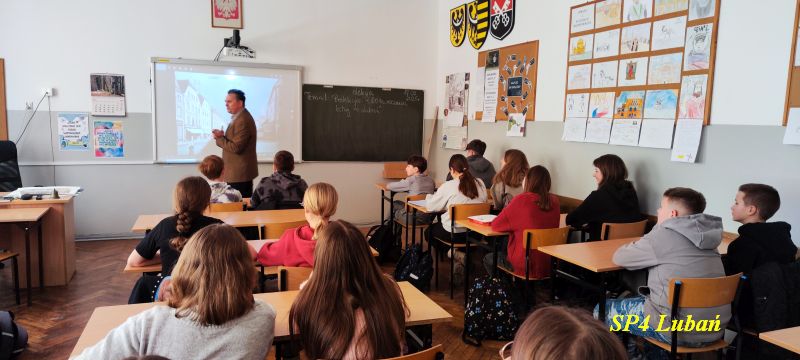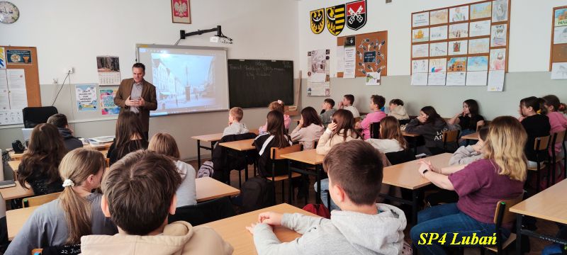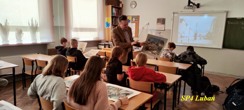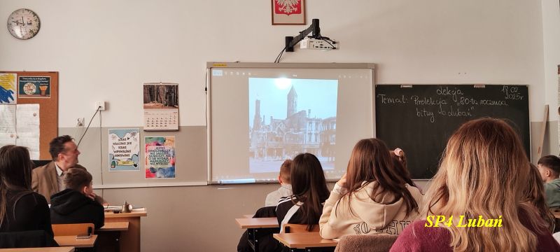 Podczas lekcji historii klasy: 6a, 6c i 5b gościły pana Janusza Kulczyckiego, który opowiadał o losach naszego miasta z przełomu lutego i marca 1945 roku oraz pokazywał na materiale zdjęciowym budynki i miejsca związane z ową batalią. Dzięki temu uczniowie zobaczyli jak wyglądał przedwojenny Lubań, jakie zniszczenia przyniosły czasy wojny i jak obecnie wyglądają punkty, w których stały nieistniejące już budynki. Uczniowie poznali również sprzęt bojowy oraz obejrzeli obrazy malowane akwarelami przez naszego gościa, których tematyka związana była z bitwą. Był również czas na pytania i wspólną rozmowę. Bardzo dziękujemy za to spotkanie, dzięki niemu mogliśmy „dotknąć” historii naszego miasta.