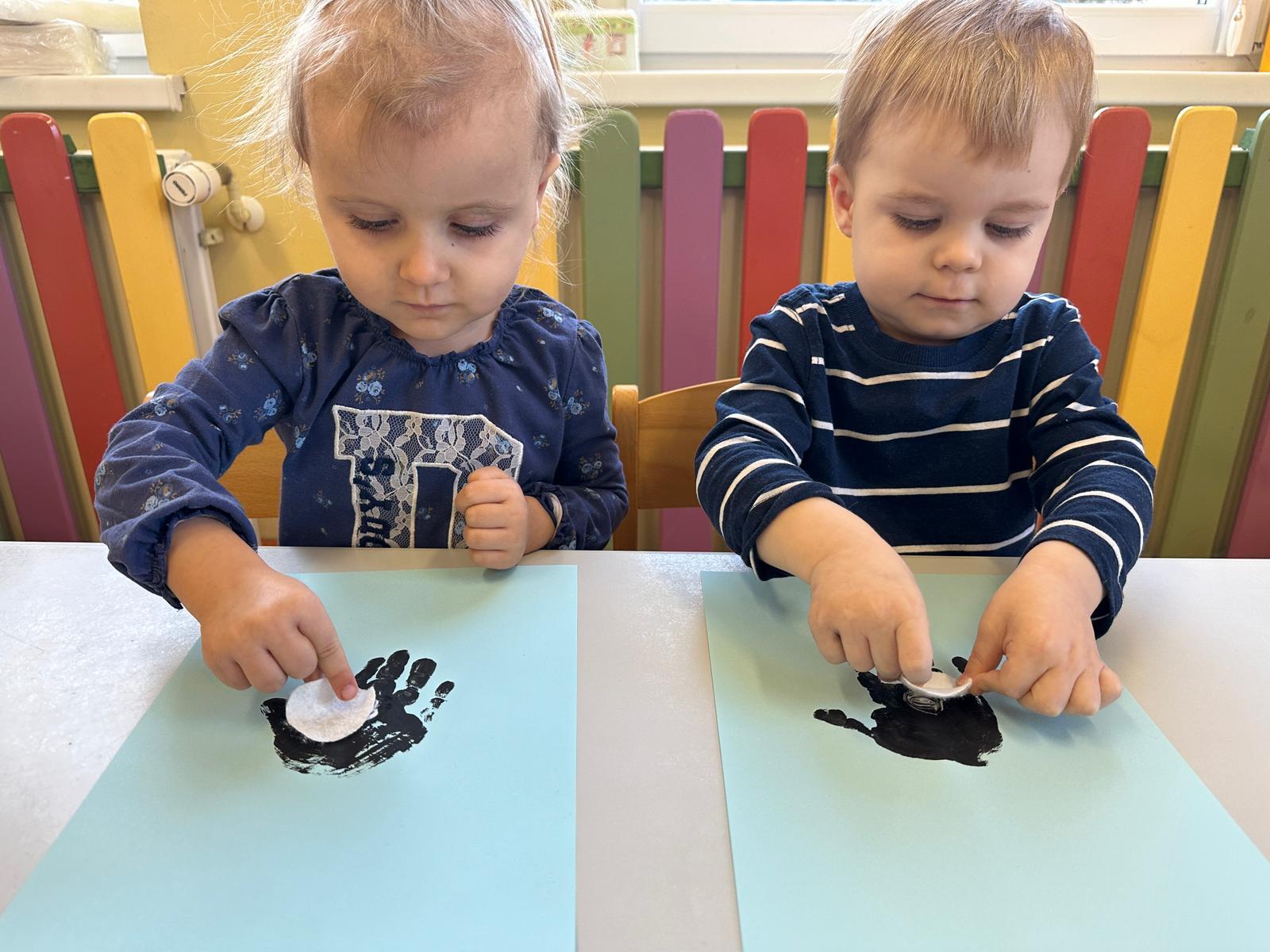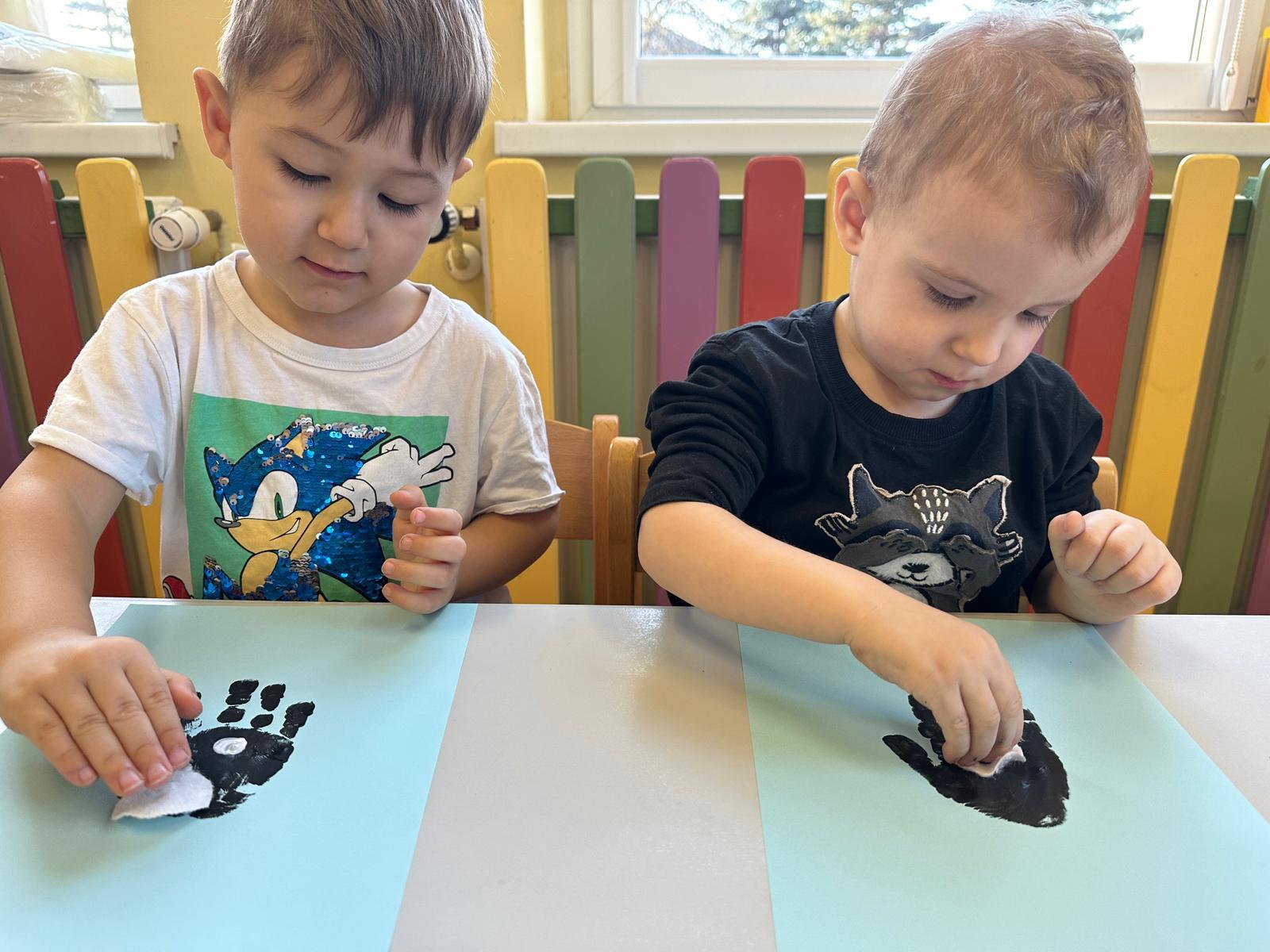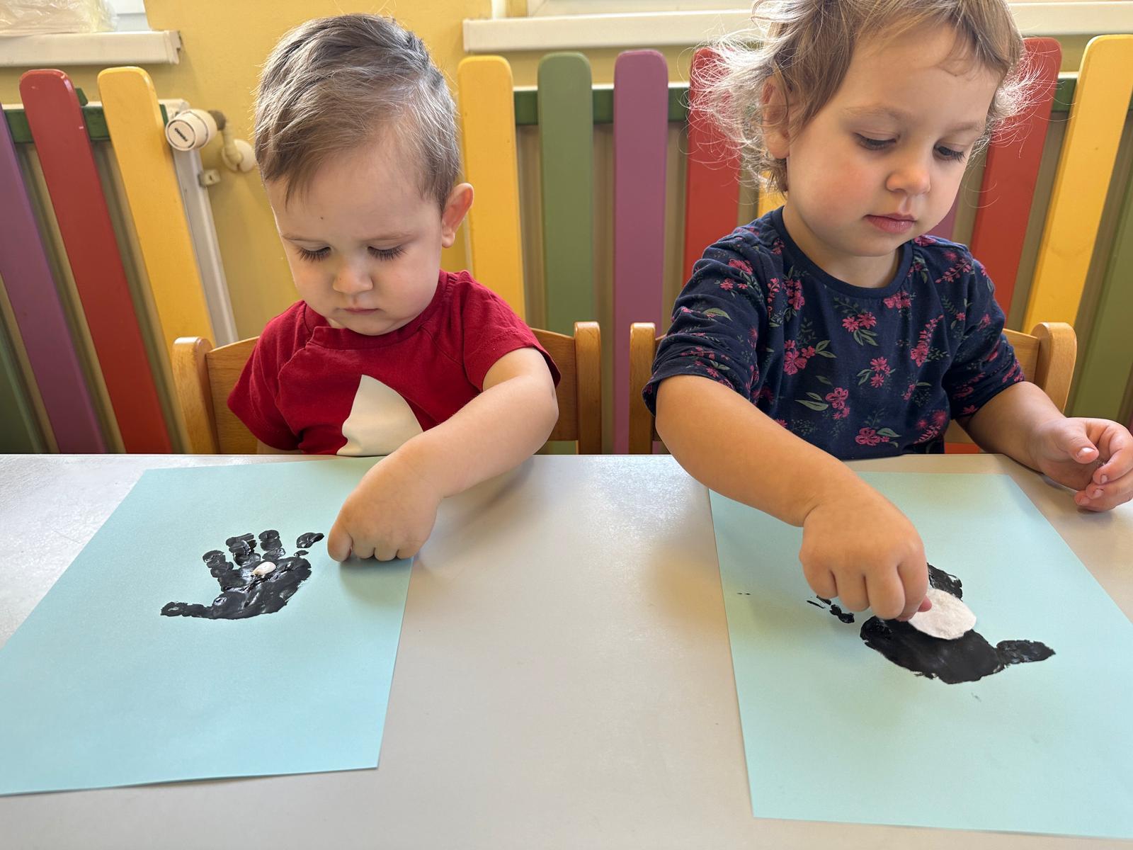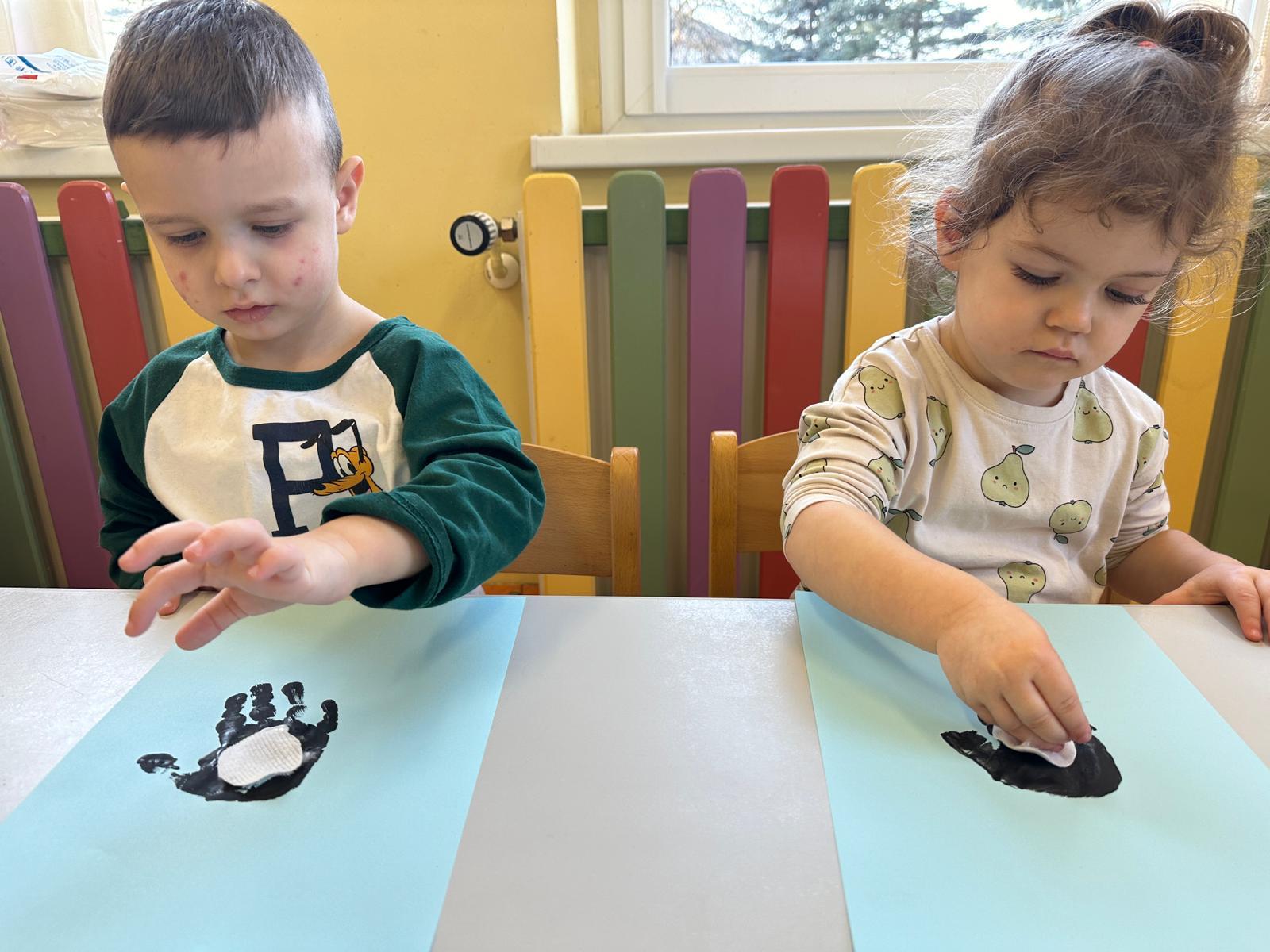 Praca plastyczna to rozwijanie umiejętności takich jak zdolności manualne, koncentracja, praca w skupieniu oraz kreatywność. Dzieci doklejały dzióbek, oczka oraz brzuszek do odbitych farbą rączek.