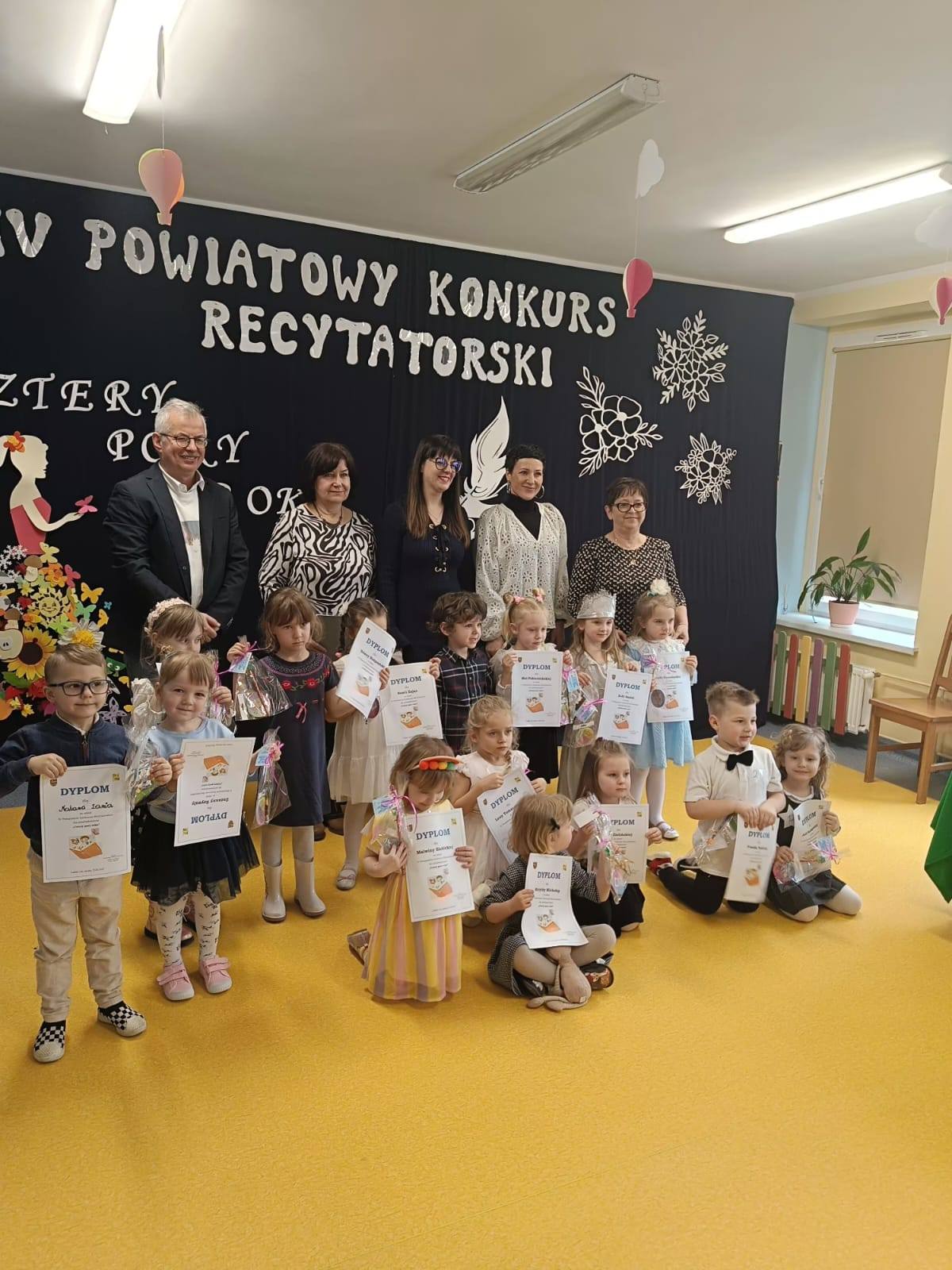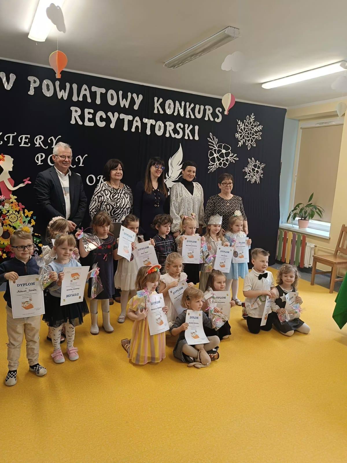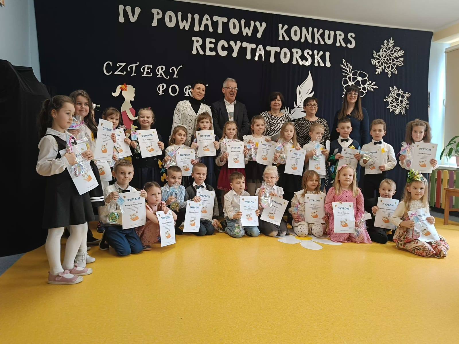 W naszych przedszkolnych murach zagościło dzisiaj niemalże 50 dzieci wraz z rodzicami i nauczycielami z przedszkoli z całego powiatu lubańskiego. Wszyscy uczestnicy zaprezentowali się wspaniale, recytując odważnie przygotowane wiersze o tematyce „Czterech pór roku”.