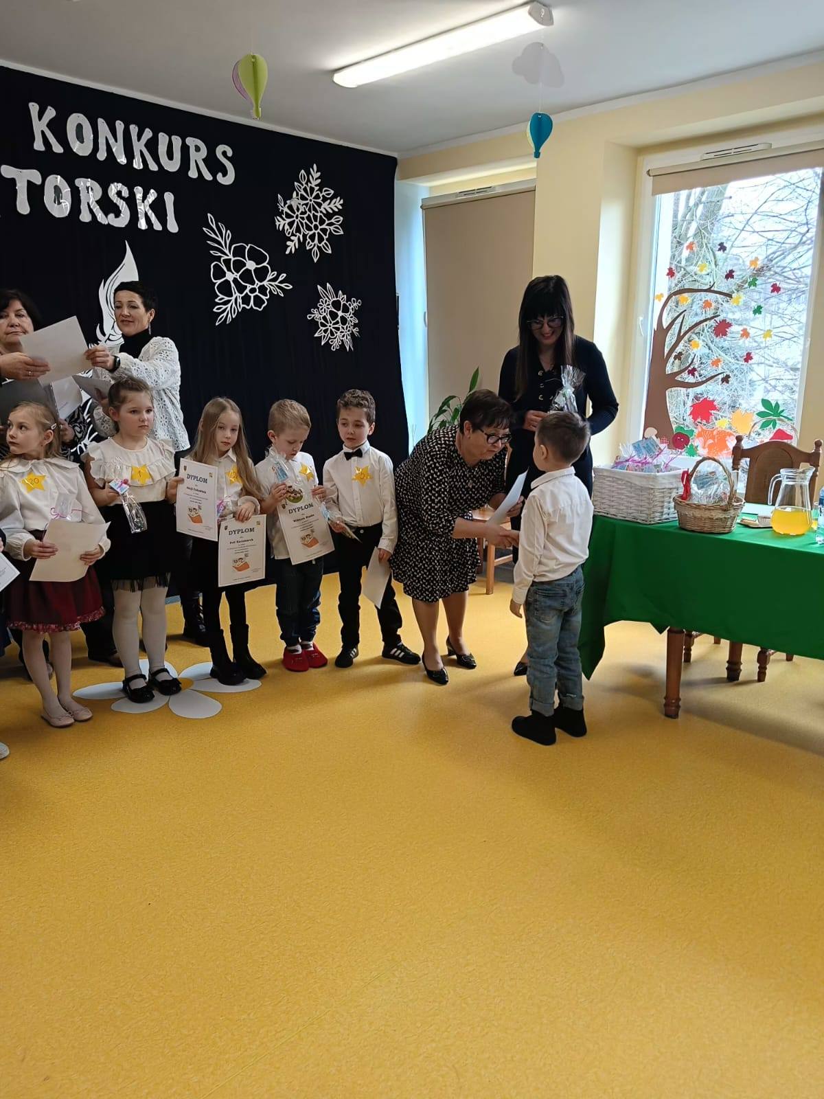 Konkurs prowadziła Pani Monika Borkowska z PCE w Lubaniu. Wyróżnieni podczas dzisiejszego konkursu, zostaną nagrodzeni na Gali Laureatów organizowanej przez Powiatowe Centrum Edukacji w Lubaniu. Jesteśmy bardzo dumni, że Lenka z grupy II zajęła 2 miejsce w kategorii wiekowej 3-4 latków, a Alan K. z grupy V zajął I miejsce w kategorii 5-6 latków.