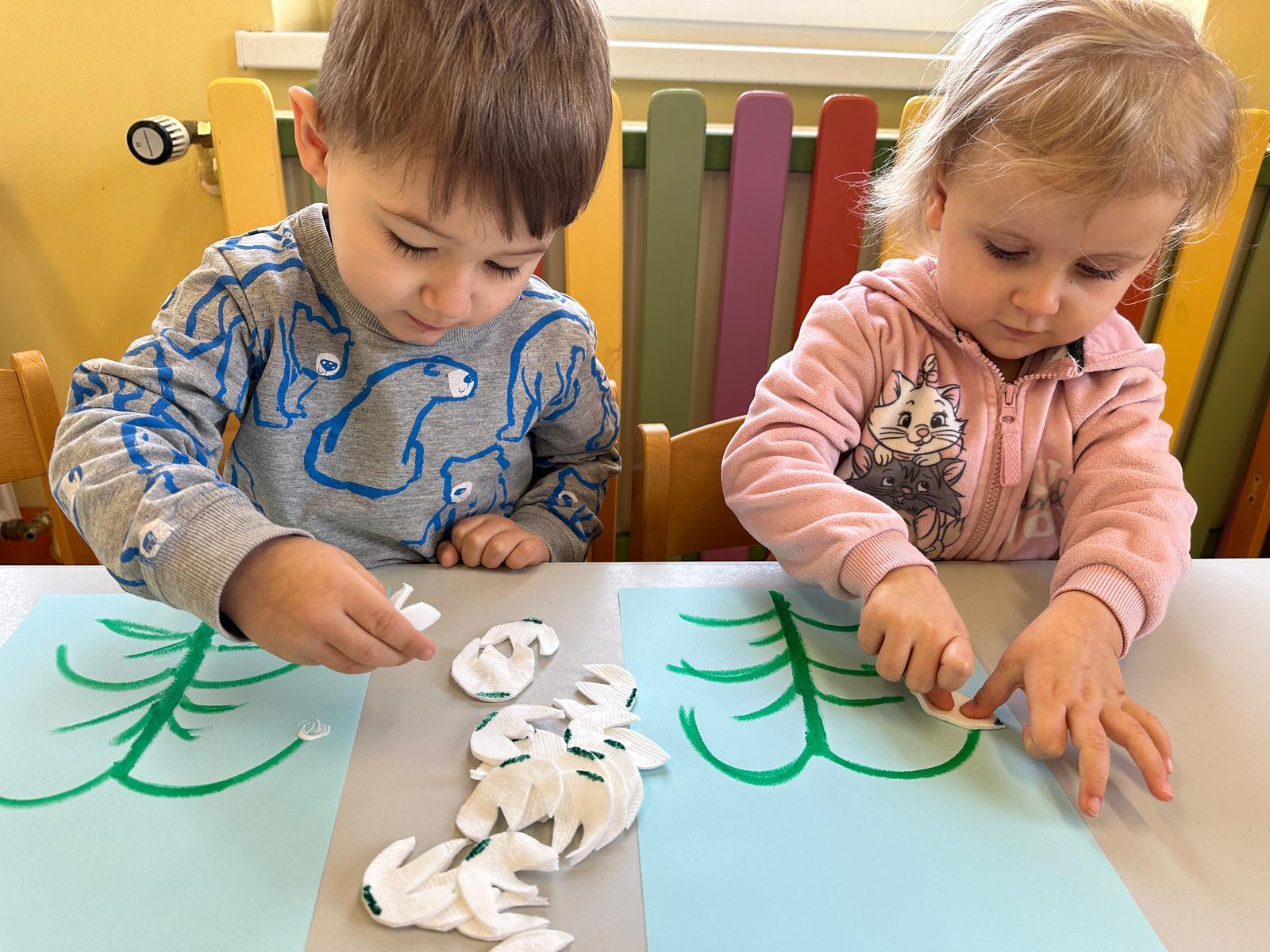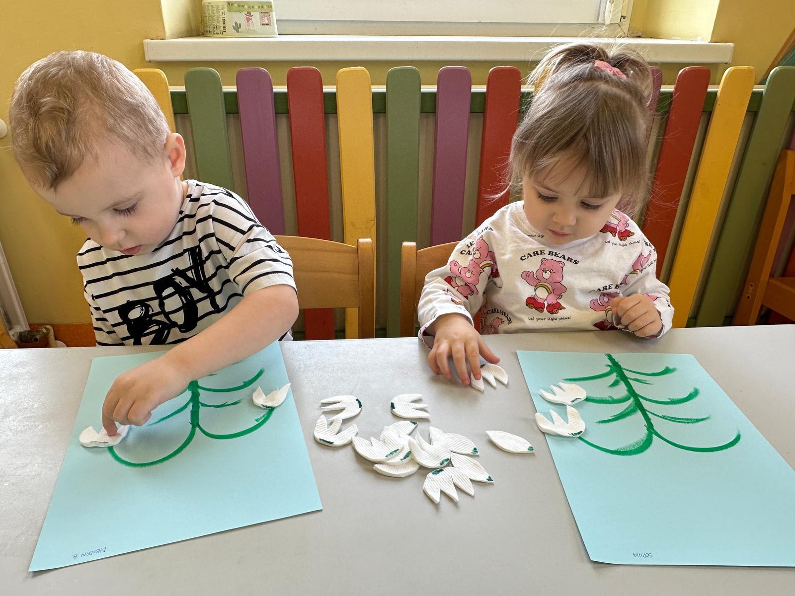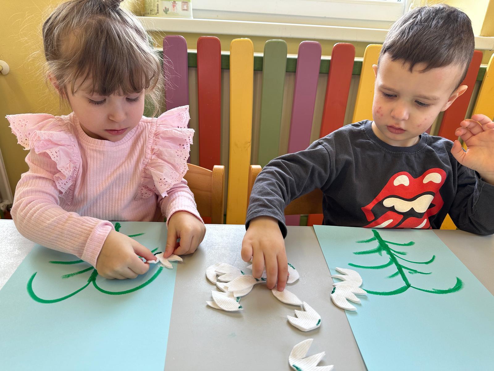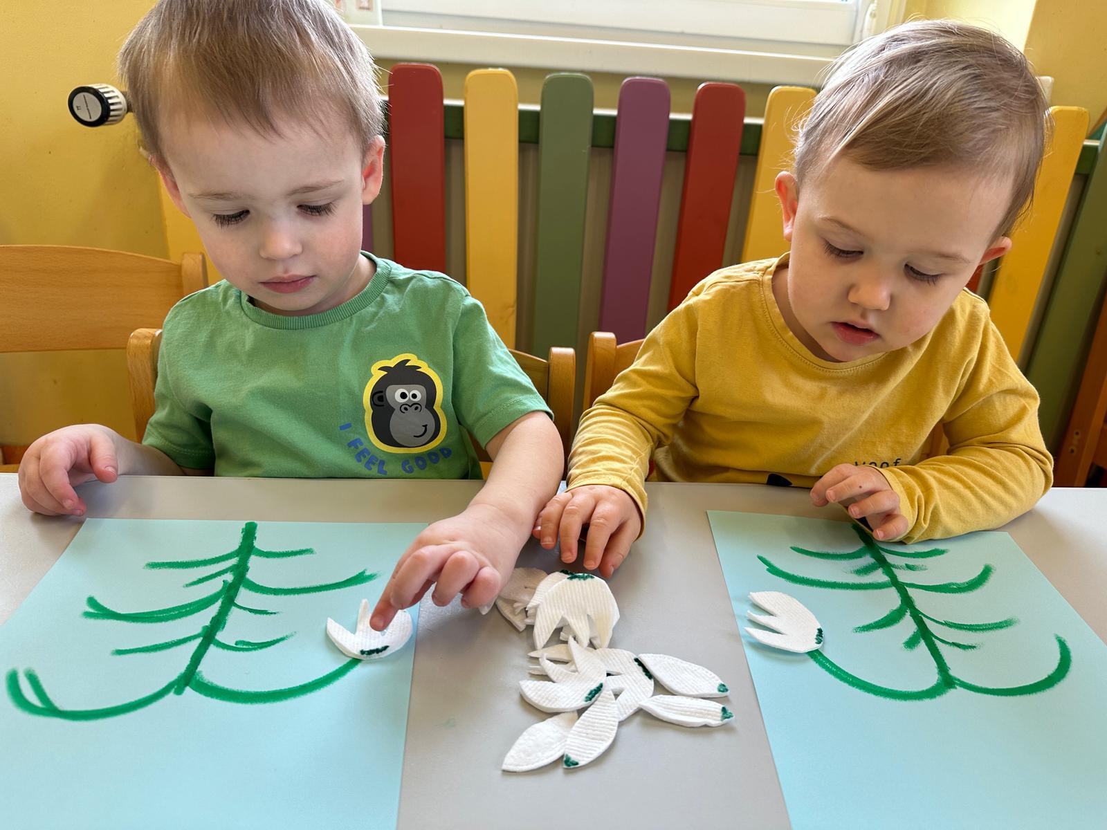 Przebiśnieg kwiat, który zwiastuje wiosnę. Praca plastyczna, która rozwija umiejętności takie jak: koncentracja, praca w skupieniu oraz kreatywność. Dzieci przyklejały przebiśniegi wycięte z płatków kosmetycznych na łodygi.