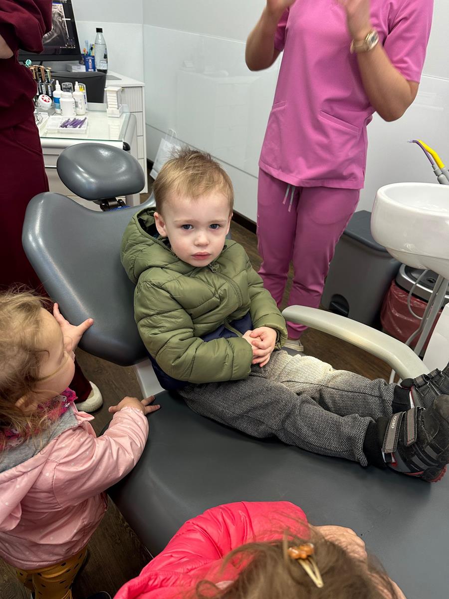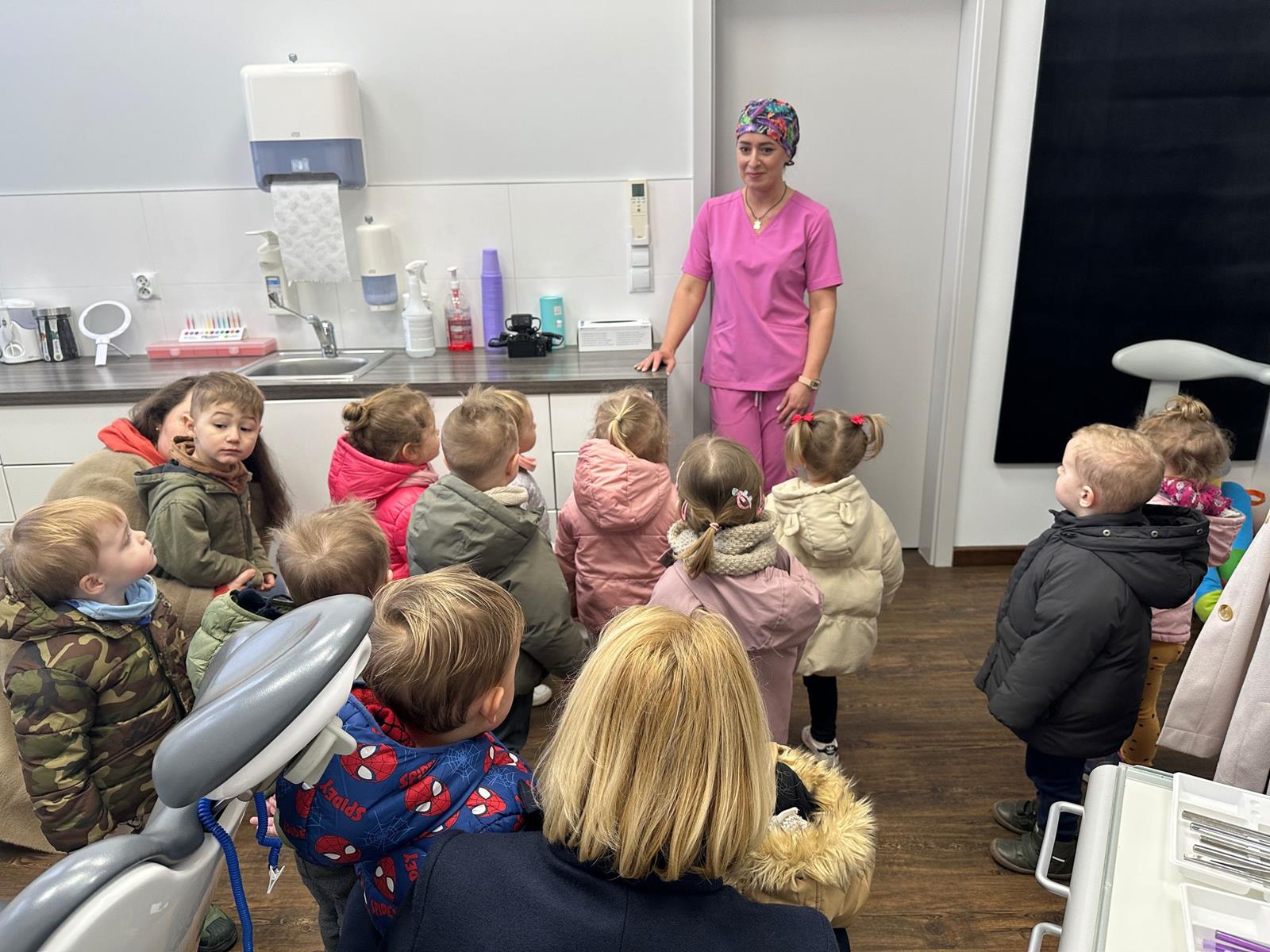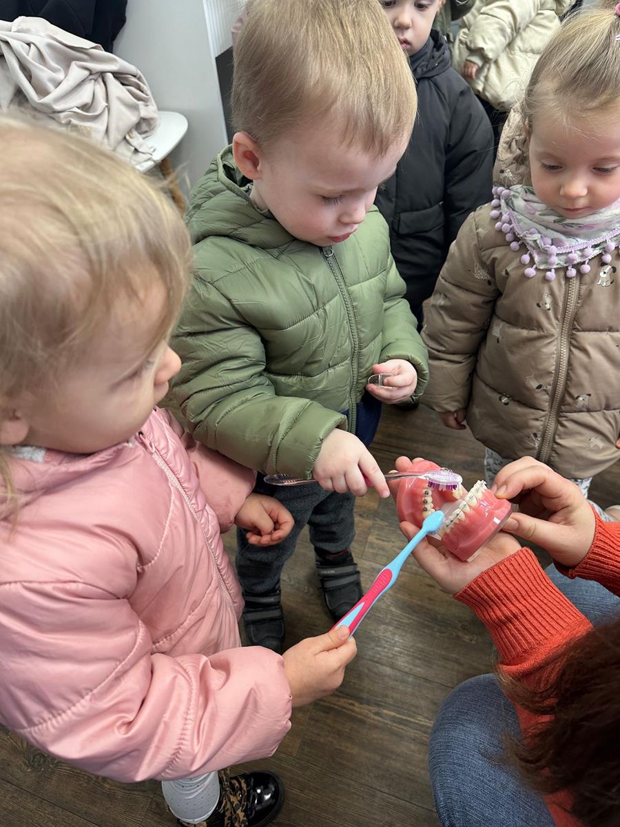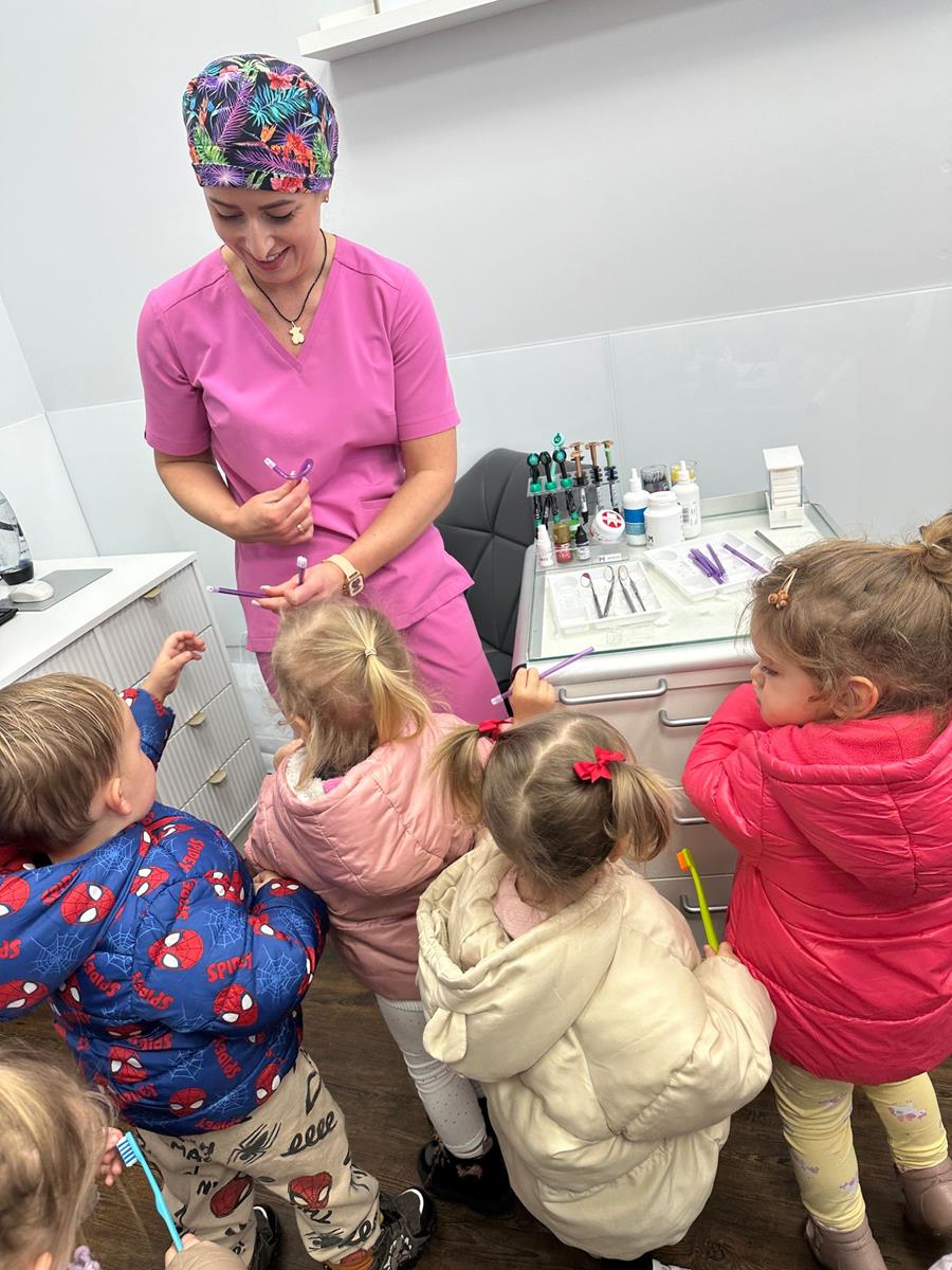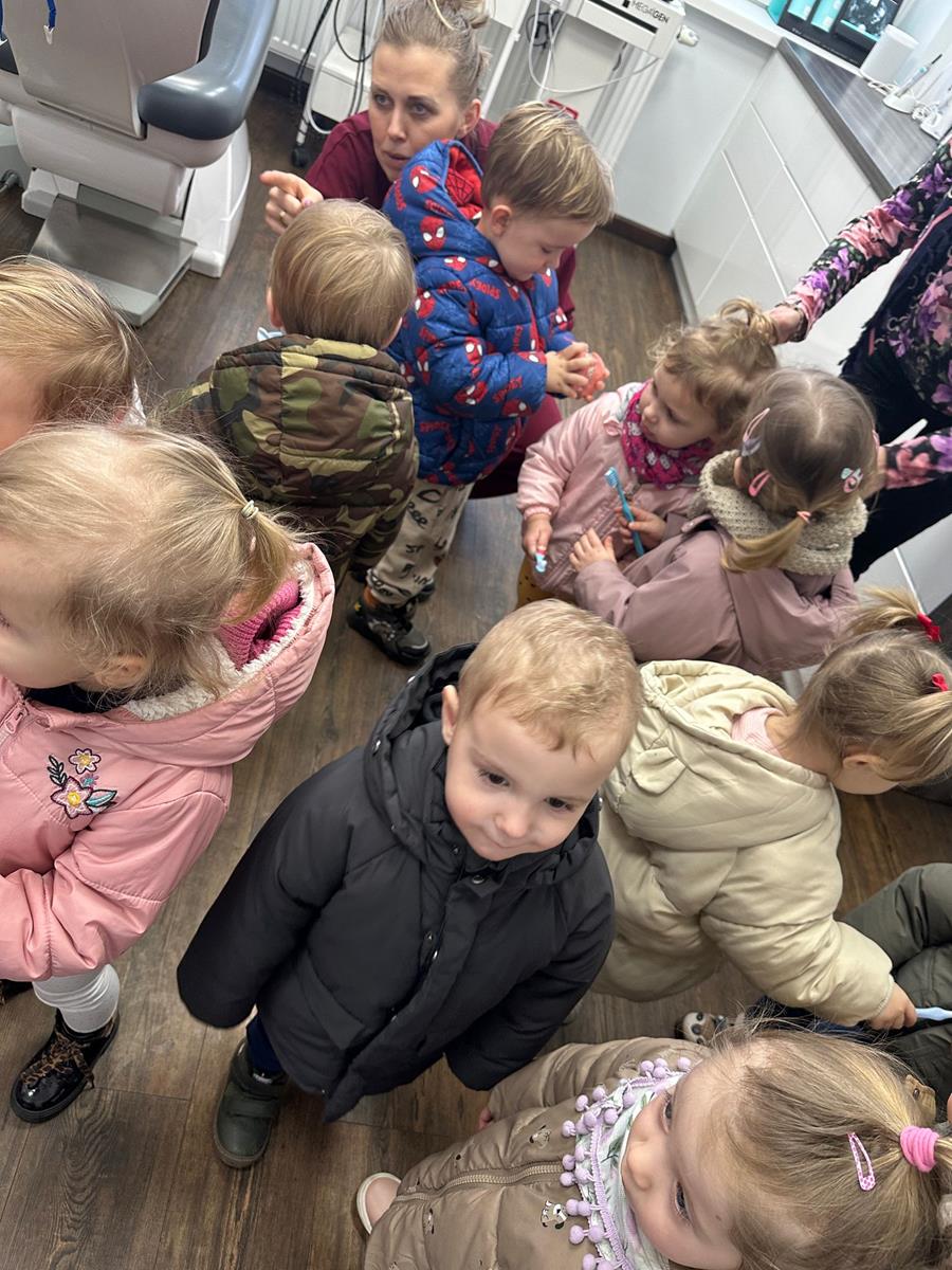 Dzieci ze starszej grupy żłobkowej wybrały się z wizytą do gabinetu stomatologicznego. Pani Ania zachęciła dzieci do zwiedzenia gabinetu, porozmawiała z dziećmi o higienie jamy ustnej, zdrowym odżywianiu i prawidłowym szczotkowaniu zębów. Kolejną atrakcją była przejażdżka w górę i w dół na fotelu dentystycznym i sprawdzenie do czego służą wszystkie dziwne urządzenia by oswoić się z gabinetem stomatologicznym. Na koniec pani rozdała wszystkim dzieciom upominki i dyplomy. Dziękujemy Ortoimplan Clinic za możliwość odwiedzin.