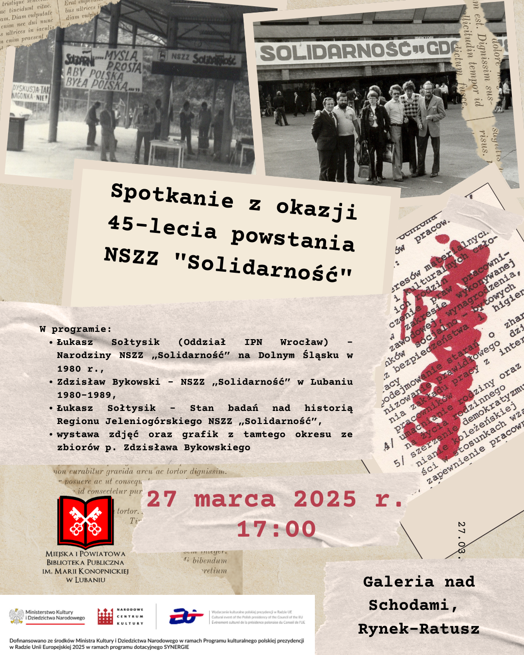 To już 45-lecie powstania NSZZ "Solidarność". Chcielibyśmy wyjątkowo uczcić to wydarzenie i zaprosić Was do naszej biblioteki 27 marca 2025 r. o 17:00 do Galerii nad Schodami w Ratuszu.
