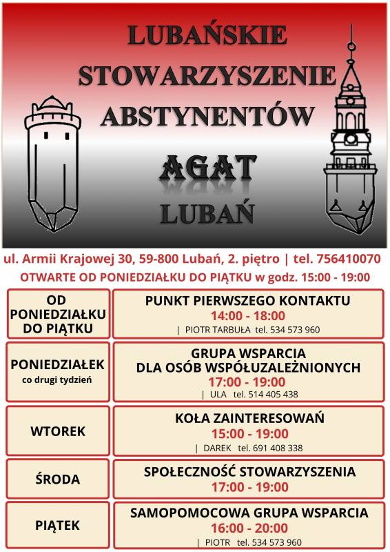Lubańskie Stowarzyszenie Abstynentów "AGAT" zaprasza do korzystania z bezpłatnego wsparcia. Aktualny grafik spotkań: * PONIEDZIAŁEK - PIĄTEK | punkt pierwszego kontaktu | godz. 14:00 - 18:00 * PONIEDZIAŁEK (co drugi tydzień) | grupa wsparcia dla osób współuzależnionych | godz. 17:00 - 19:00 * WTOREK | koła zainteresowań | godz. 15:00 - 19:00 * ŚRODA | spotkania społeczności Stowarzyszenia LSA "AGAT" | 17:00 - 19:00 * PIĄTEK | samopomocowa grupa wsparcia | godz. 16:00 - 20:00 Kontakt: * adres: ul. Armii Krajowej 30 (II piętro), Lubań. * godziny otwarcia: poniedziałek - piątek 15:00 - 19:00 * telefon: 756410070 Więcej informacji na profilu FB: AGAT Lubańskie Stowarzyszenie Abstynentów.