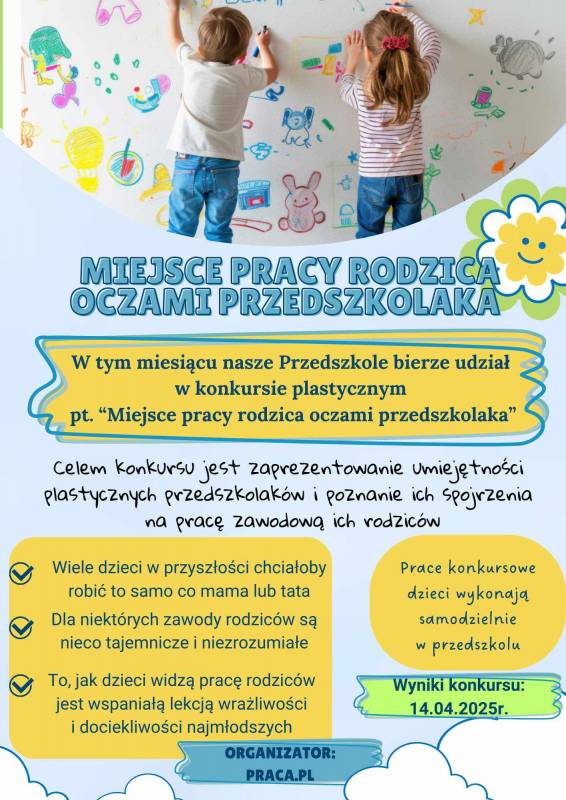 W miesiącu marcu dzieci z naszego przedszkola brały udział w konkursie plastycznym "Miejsce pracy rodzica oczami przedszkolaka" , organizowanym przez portal praca.pl - https://www.praca.pl/