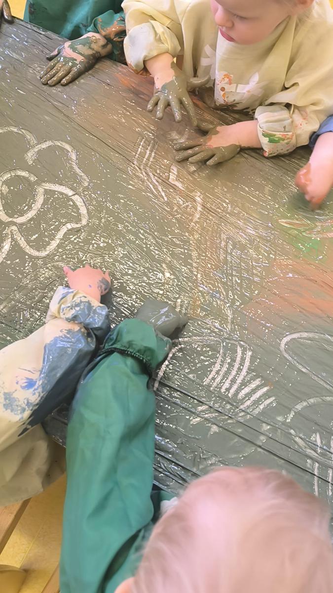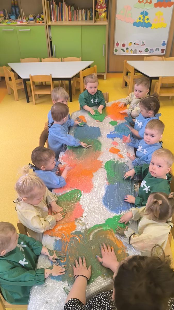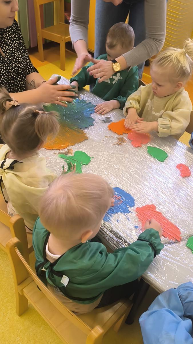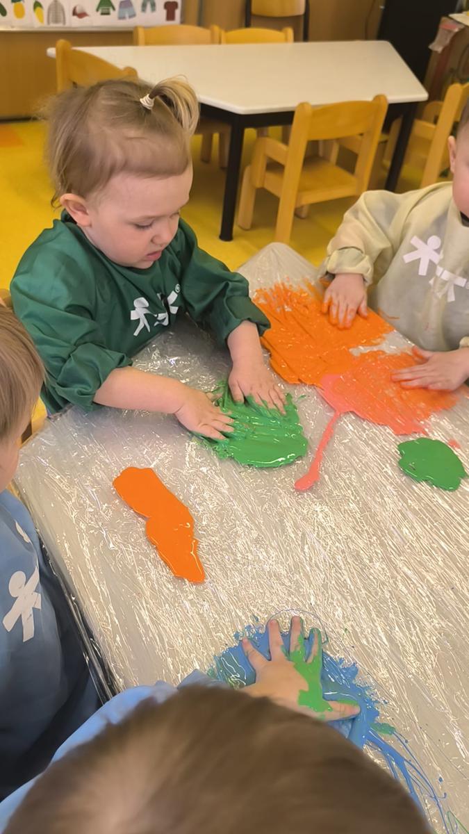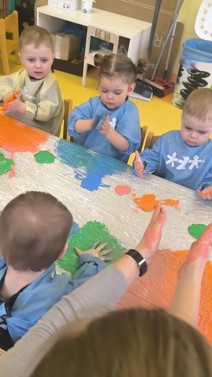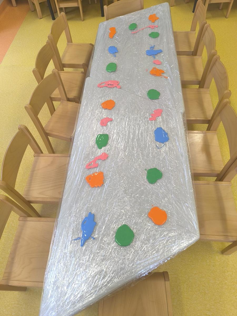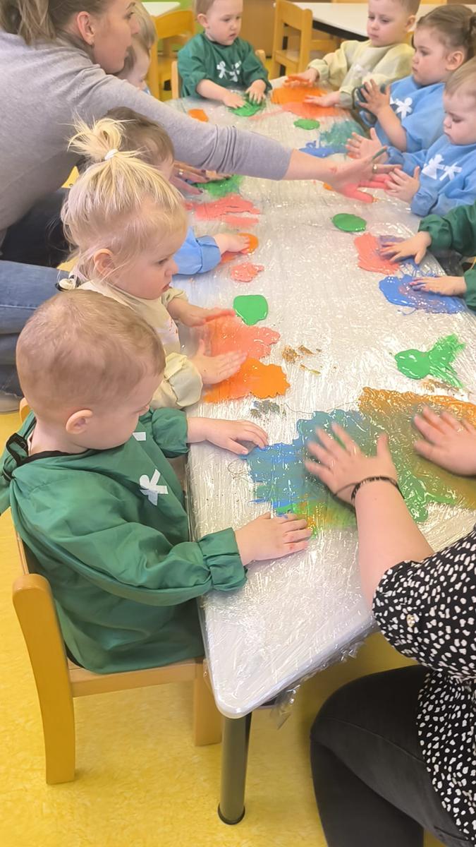 My klepiemy do rytmu rękami, my klepiemy - Ty też poklep z nami. Bardzo miłe jest takie klepanko, drogi kolego i koleżanko… Dzieci na zajęciach klepały na folii rękoma do rytmu piosenki. Jest to forma działań plastycznych, oraz doskonałe ćwiczenie motoryki małej, koordynacji wzrokowo – ruchowej.